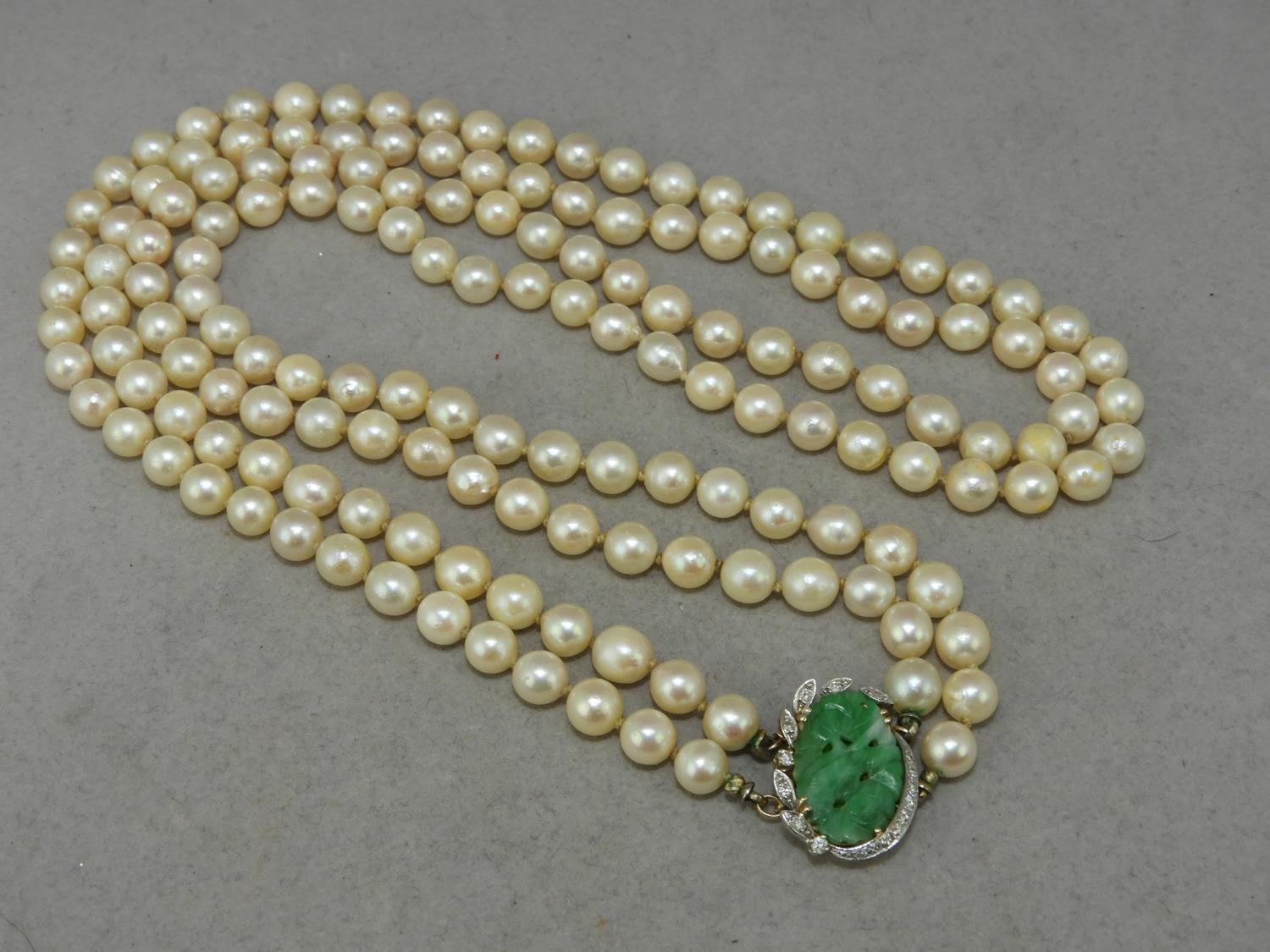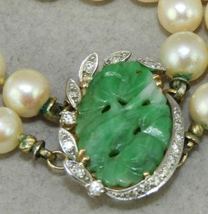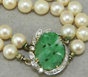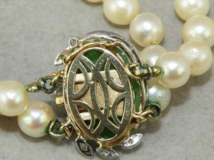 14k gold jade and diamond 2 strand pearl necklace, 24", 6.2-6.5mm