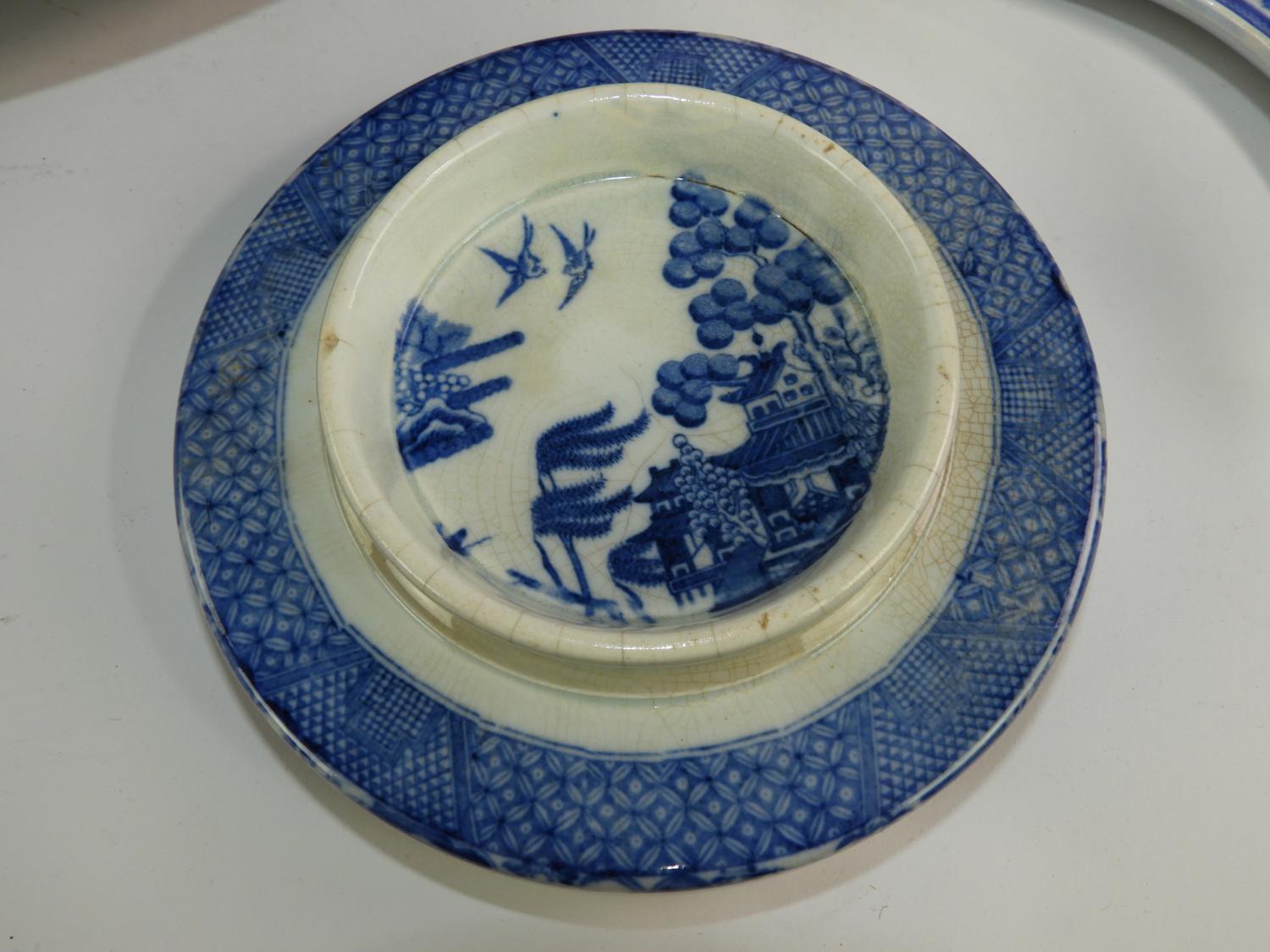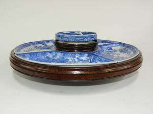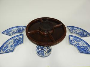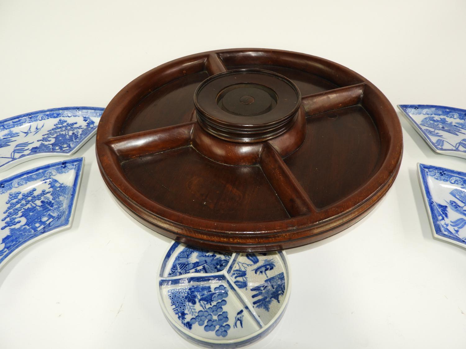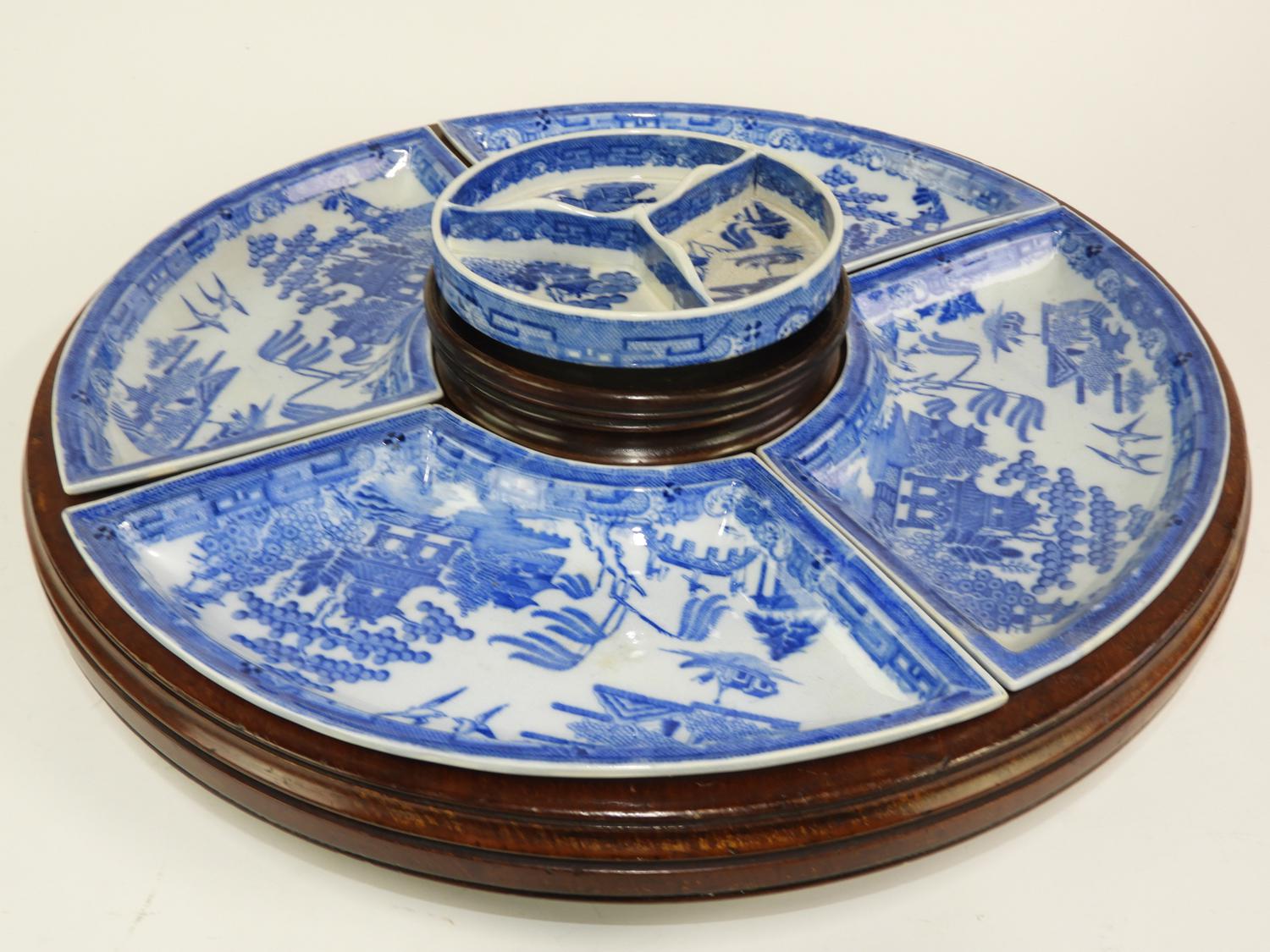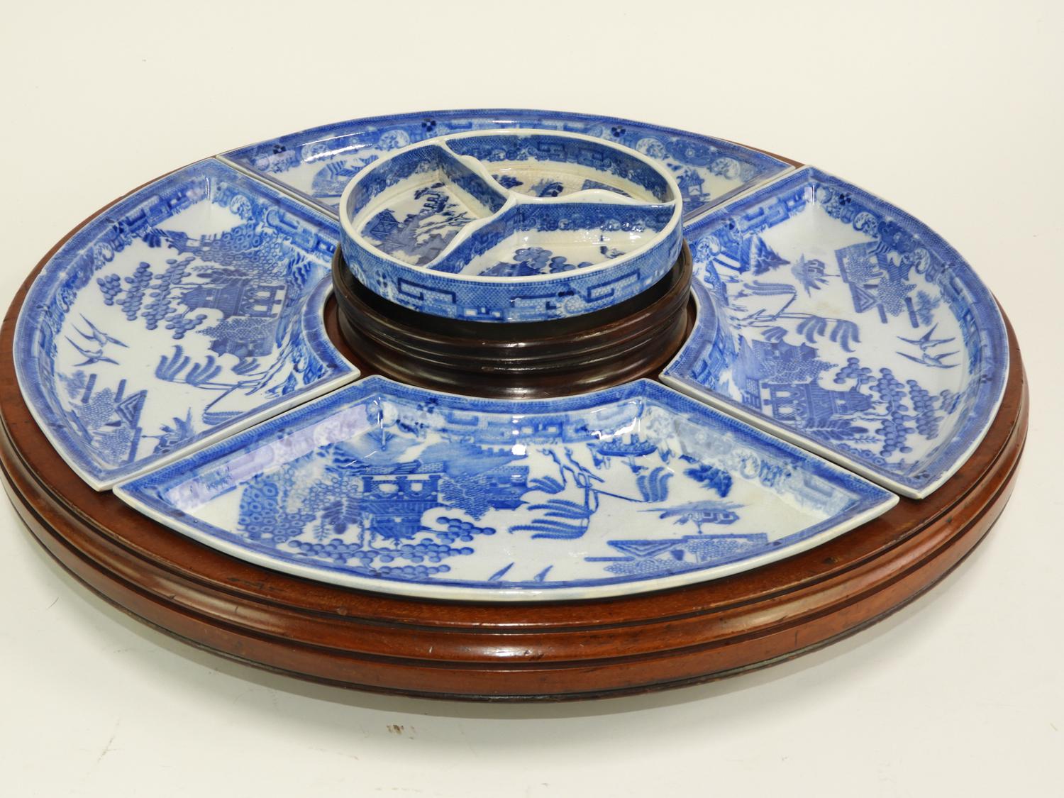 19th century spode willow pattern five piece sectional serving dish on stand, 7" x 19 1/2"