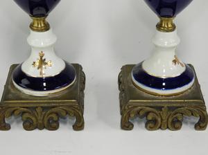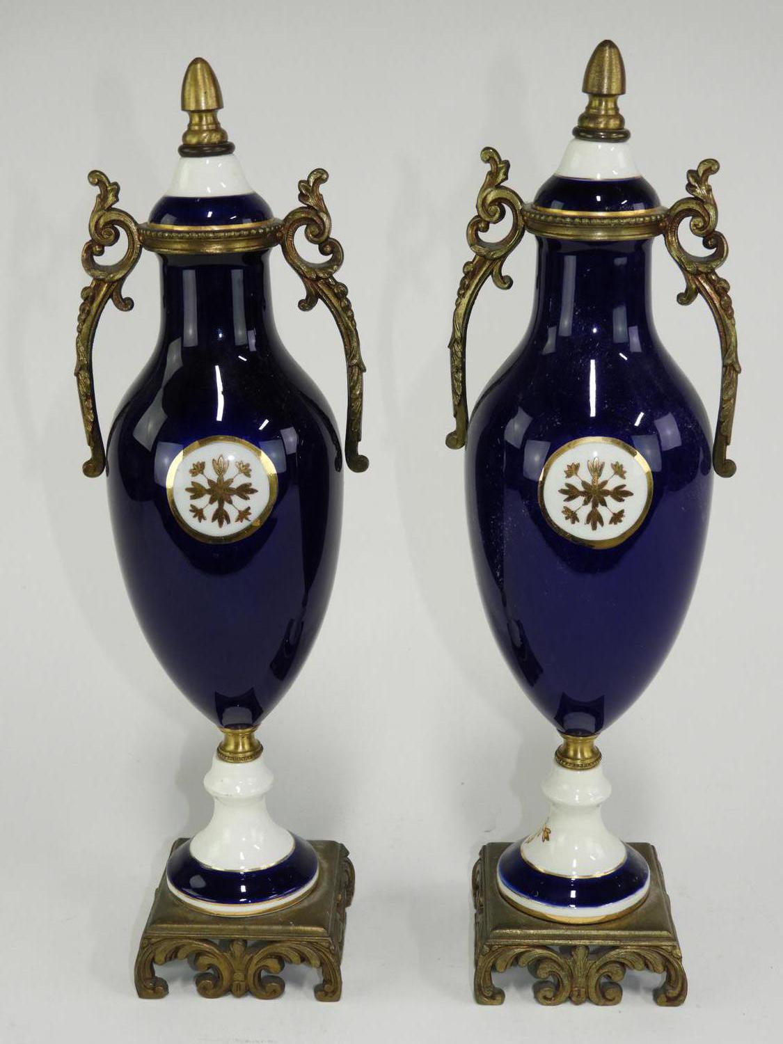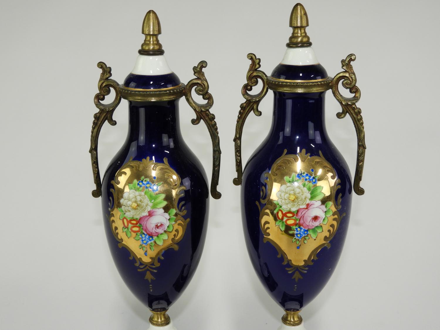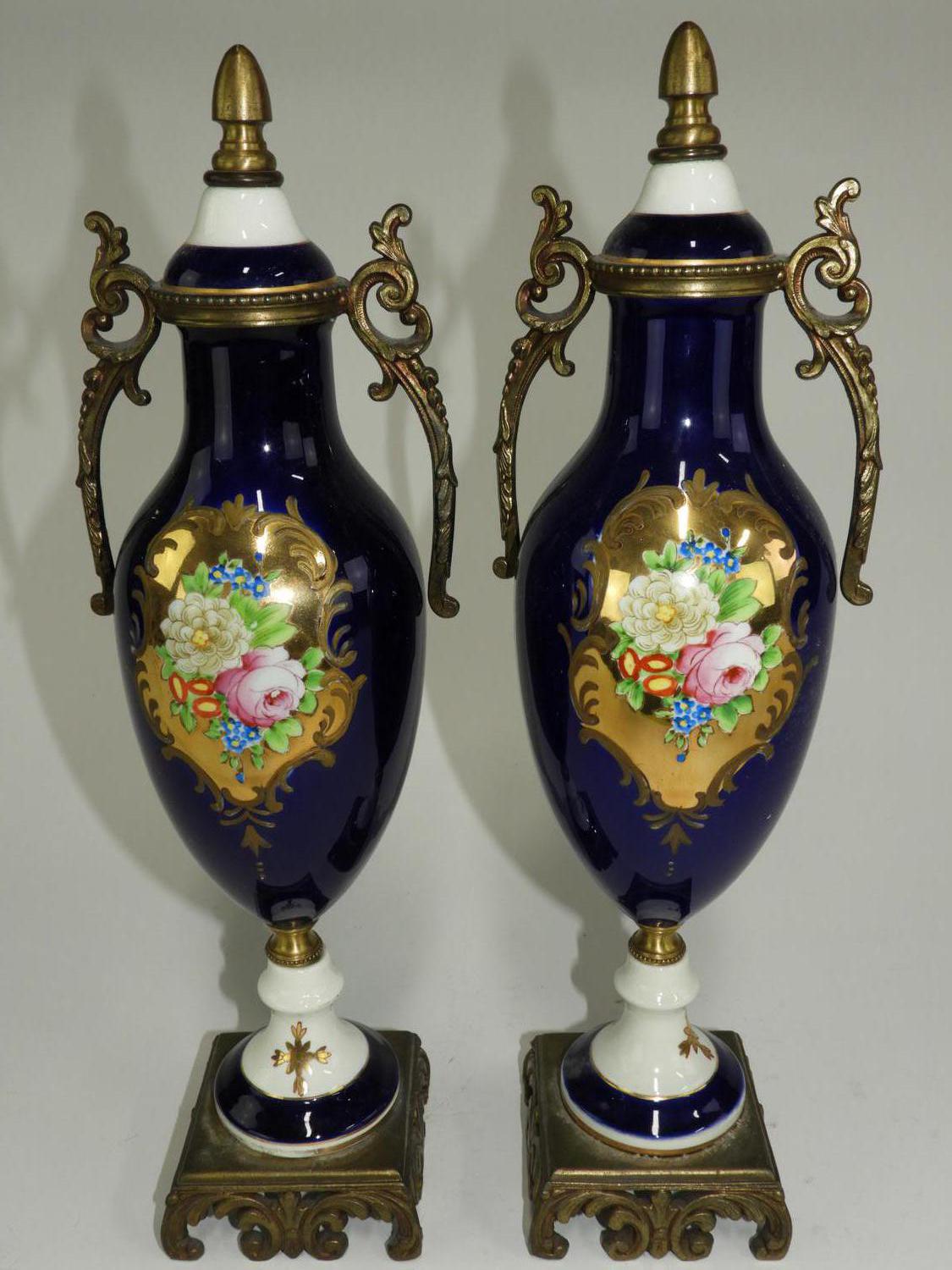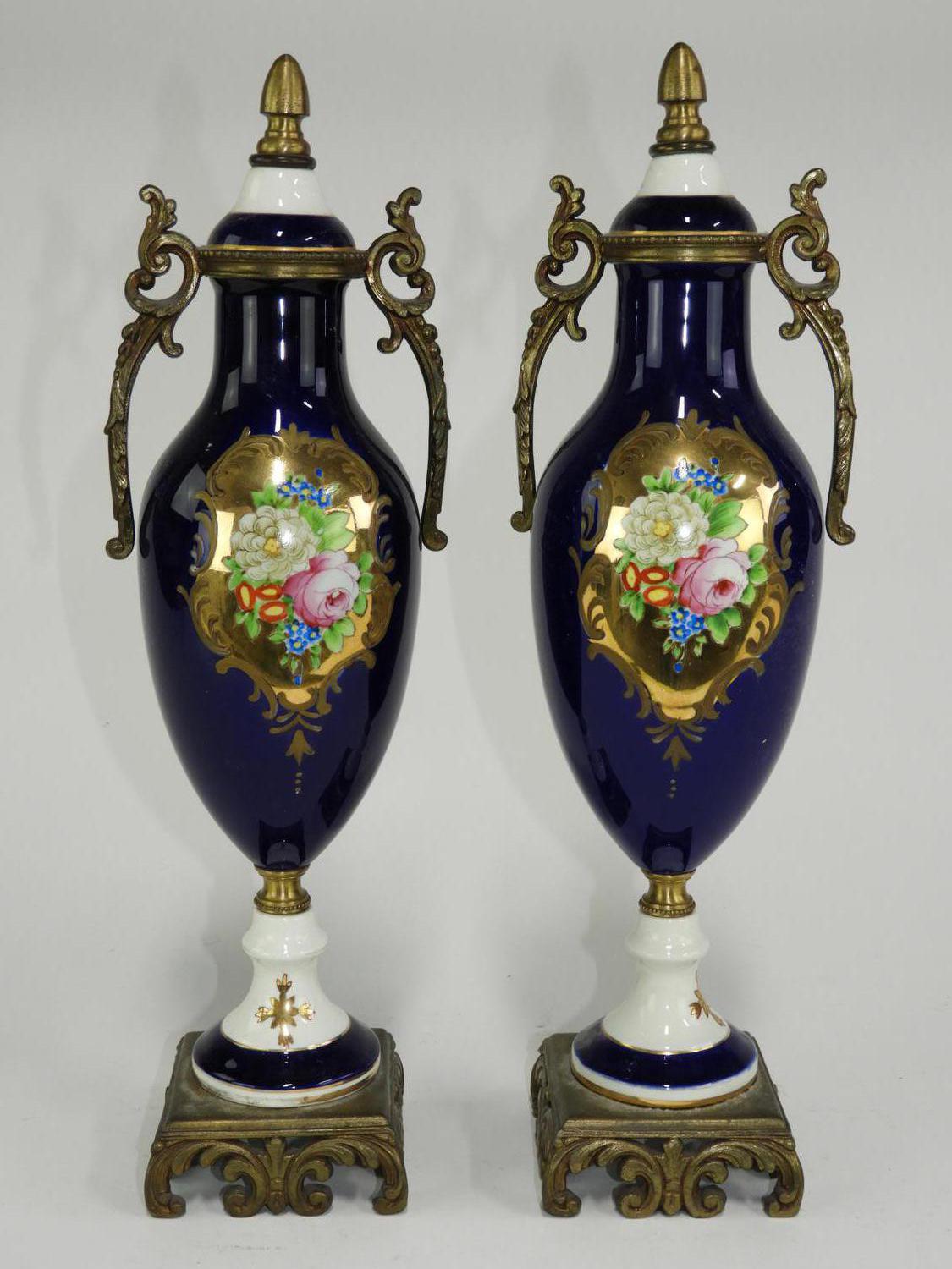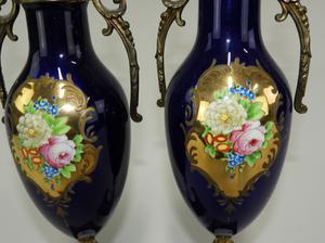 pair of french style hand painted gilded cobalt garniture, ht. 15 1/2"
