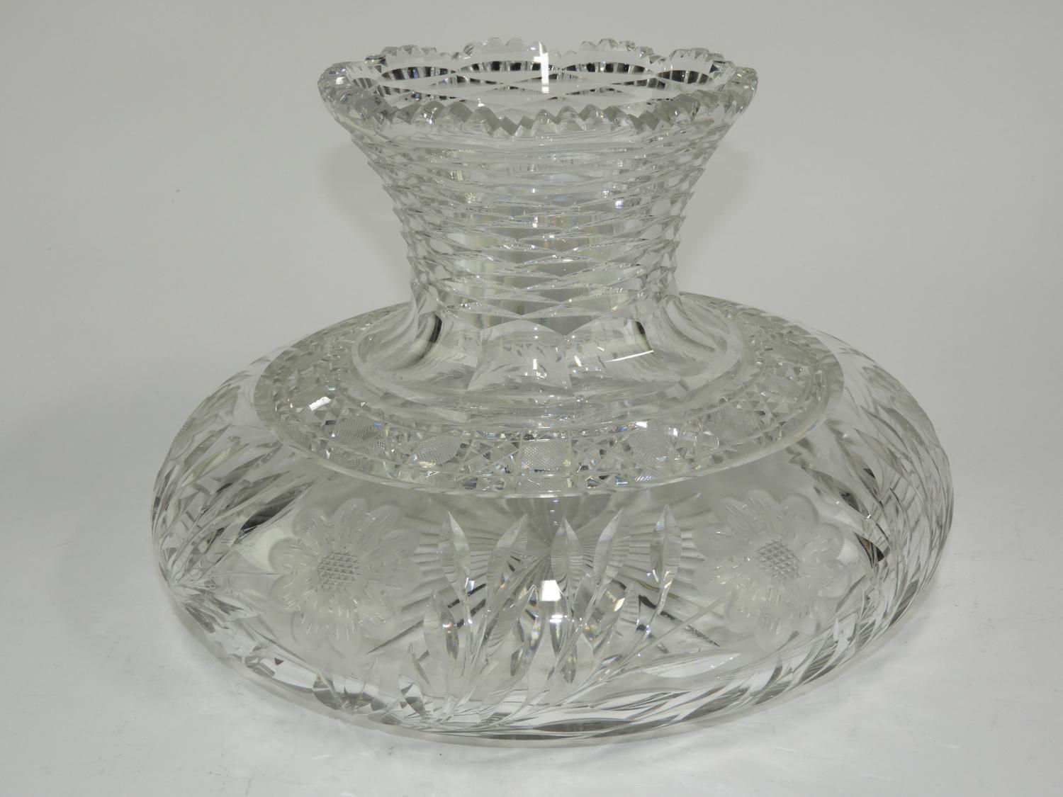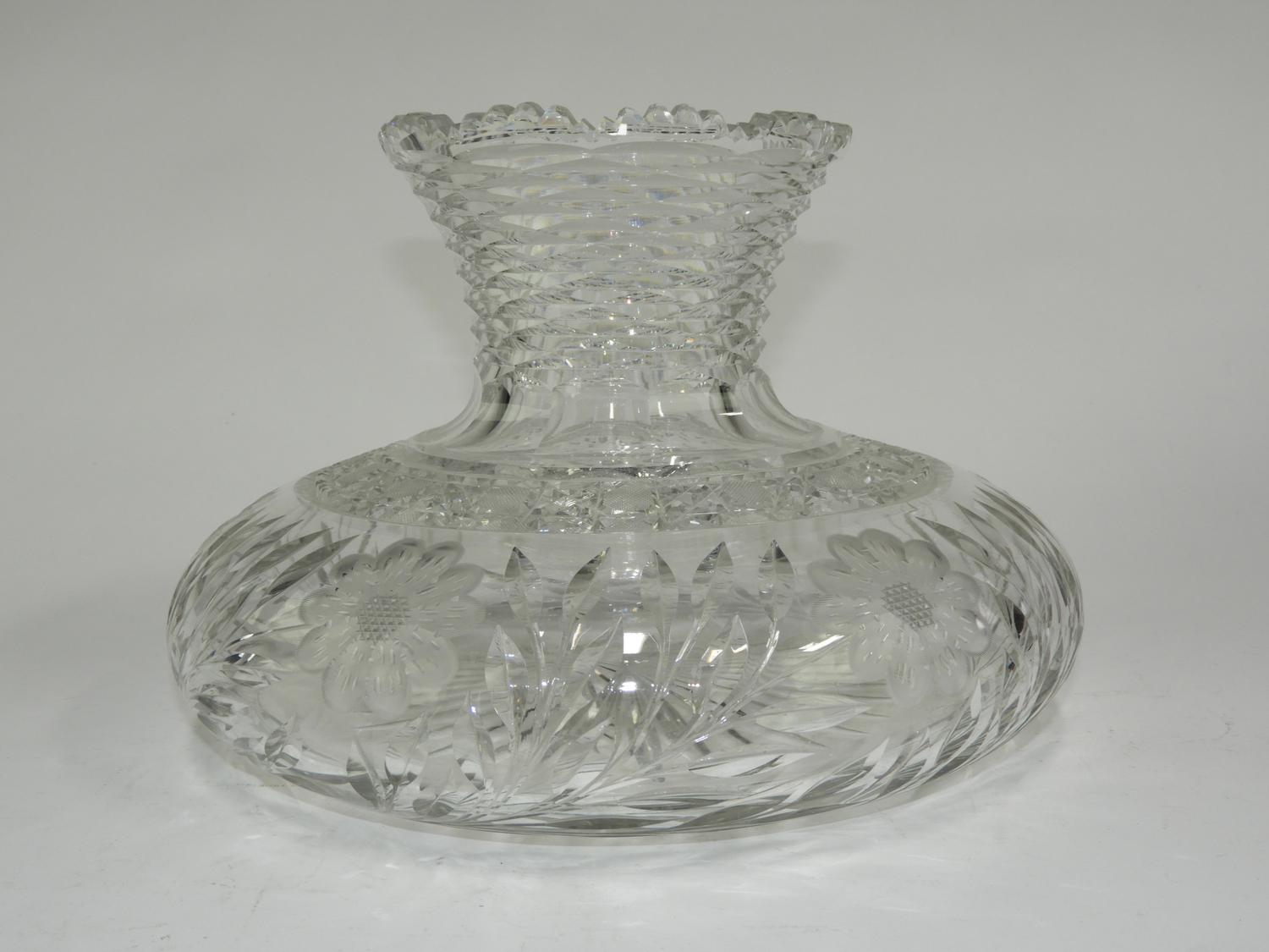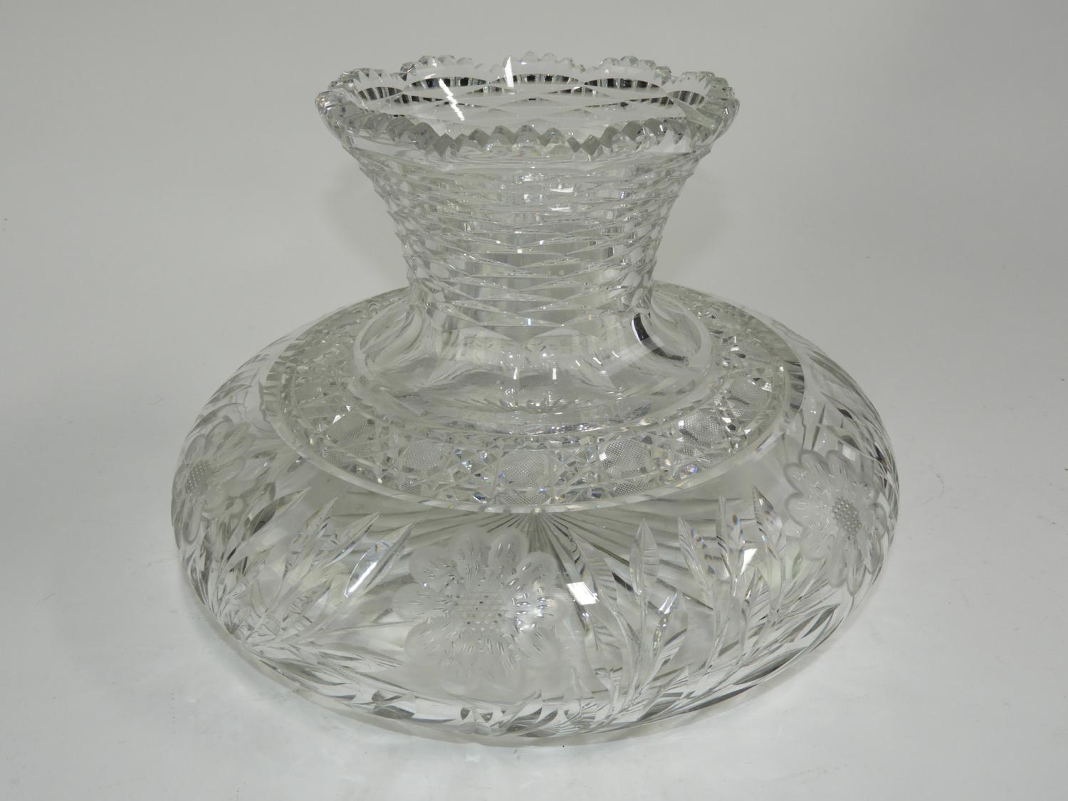 large etched and cut glass crystal vase, early 20th century, 8" x 13"