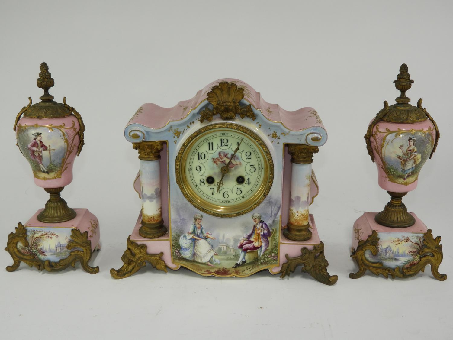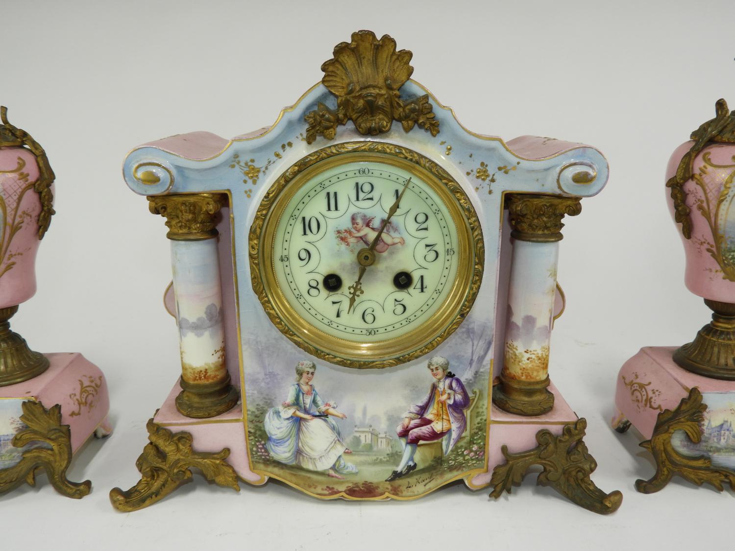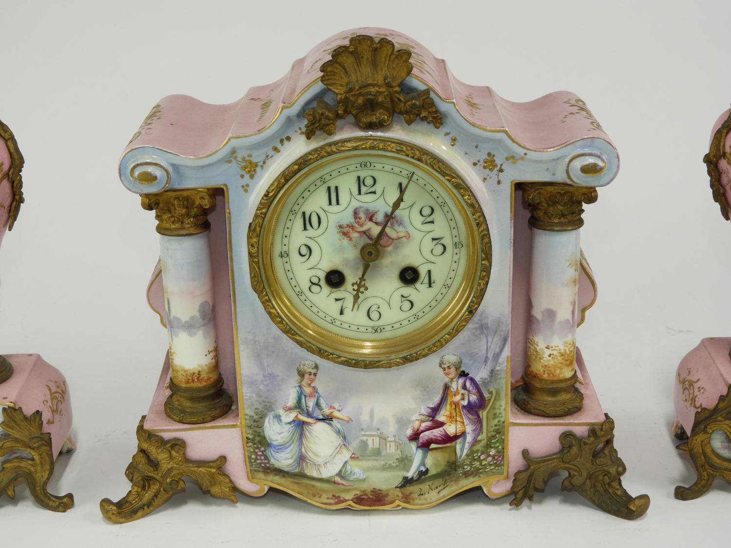 french porcelain mantle clock and garniture, handpainted by l. karl