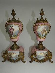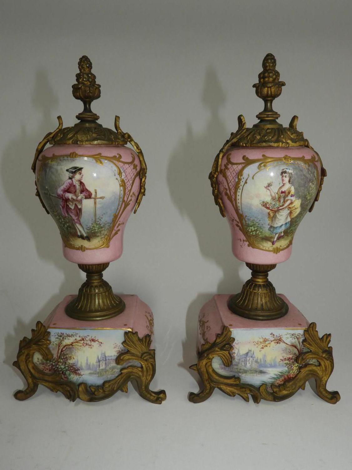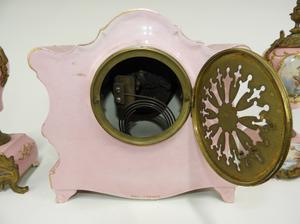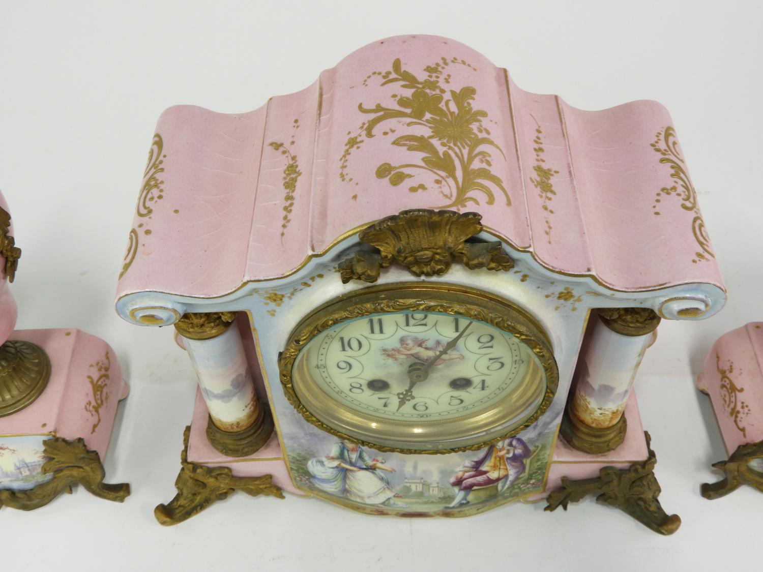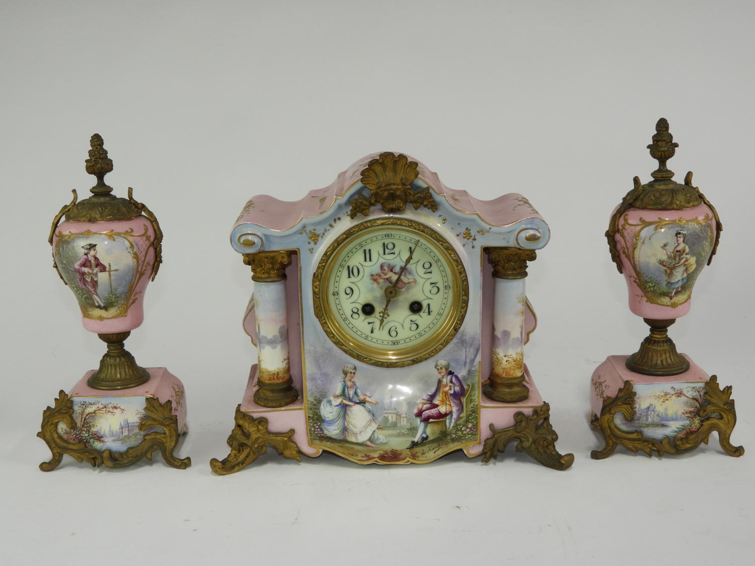 french porcelain mantle clock and garniture, handpainted by l. karl