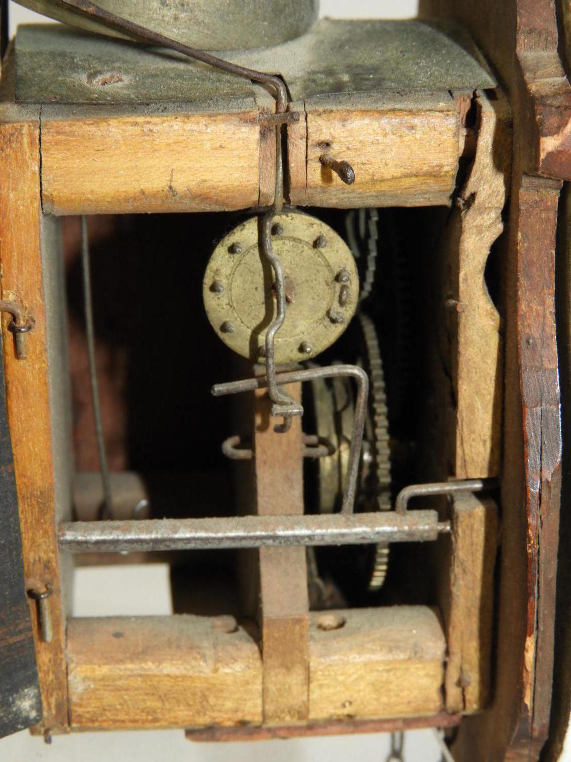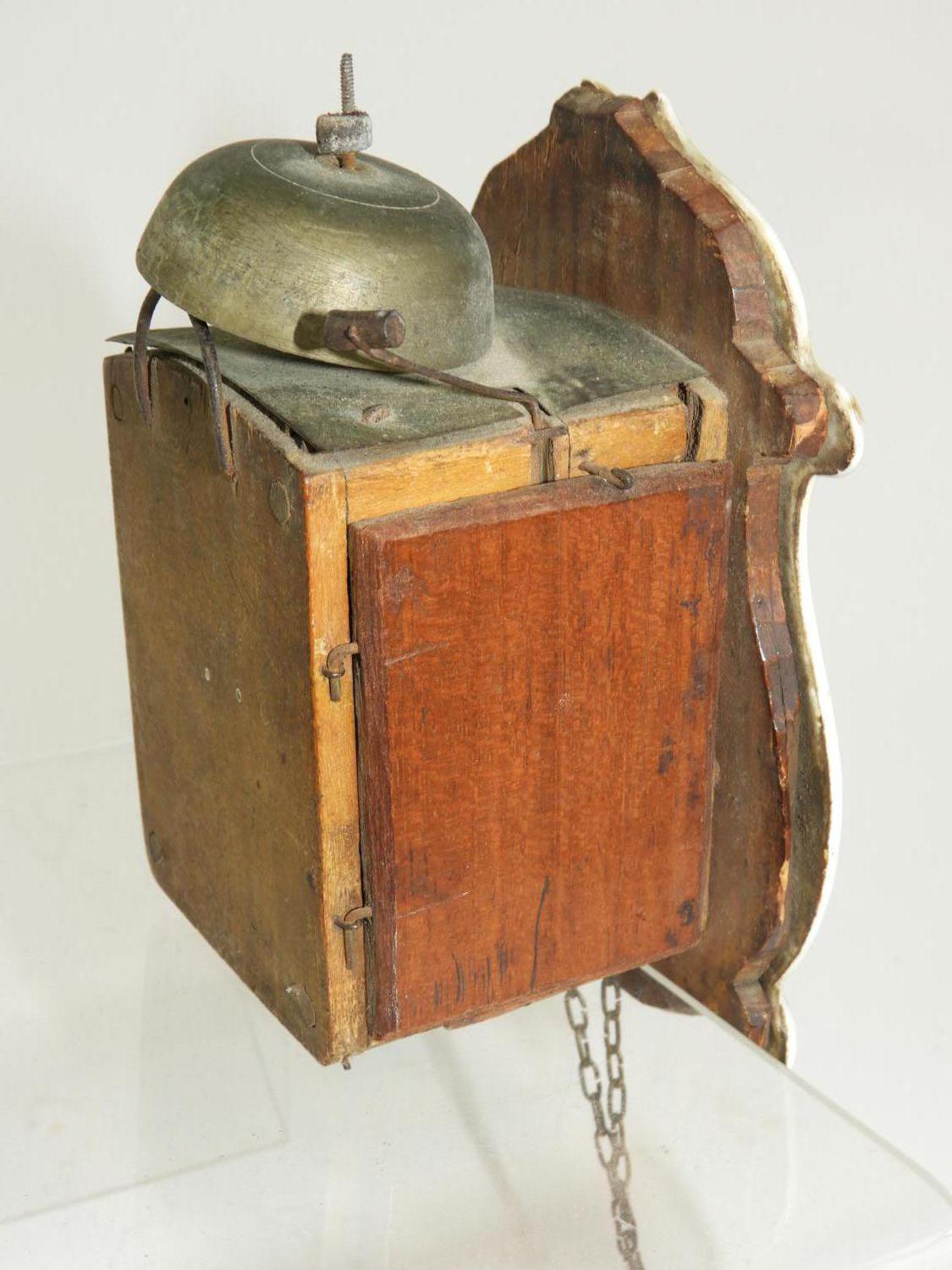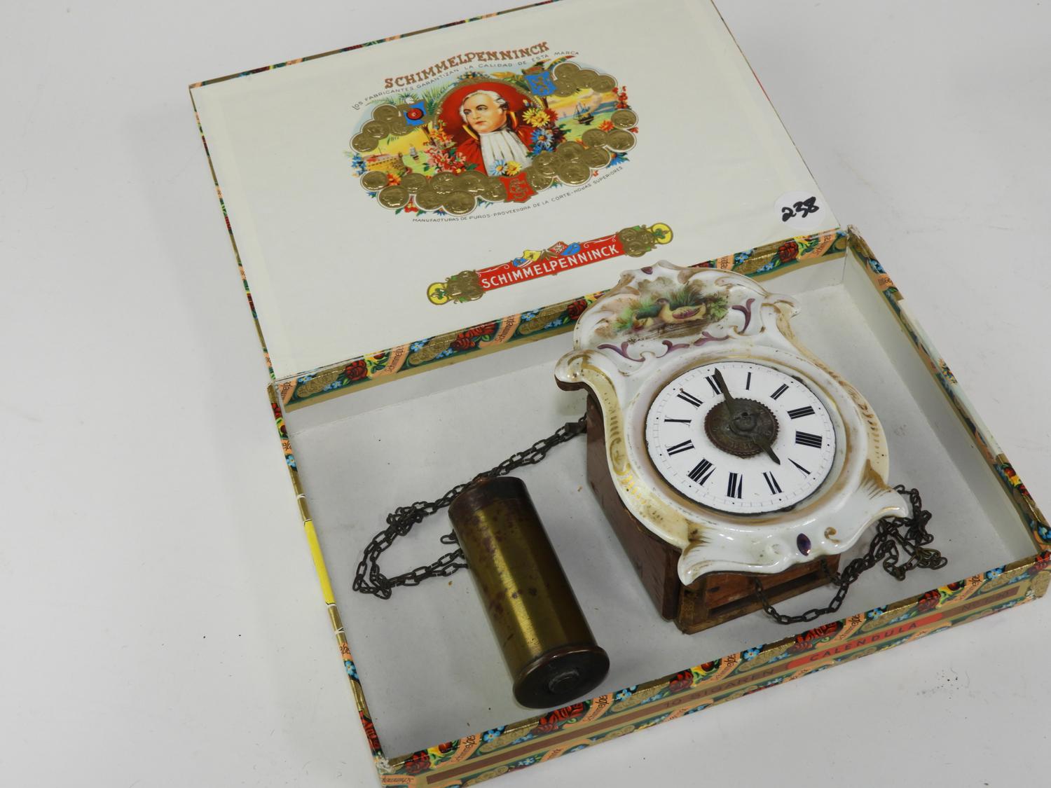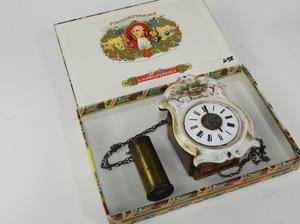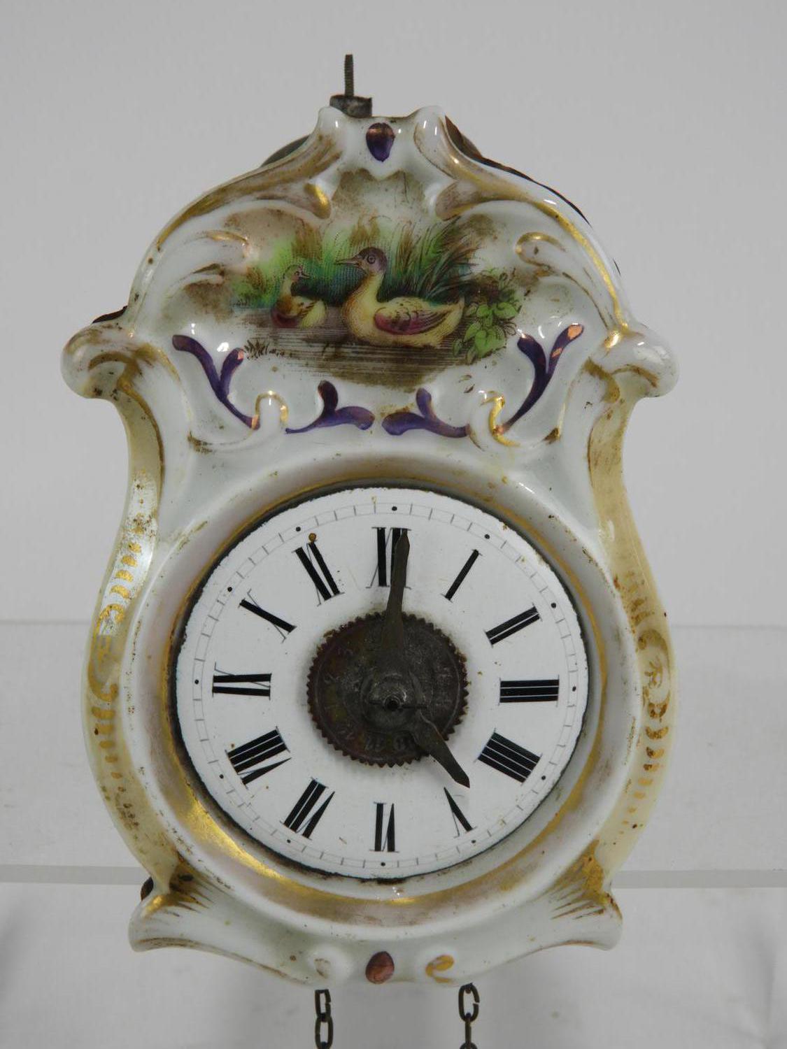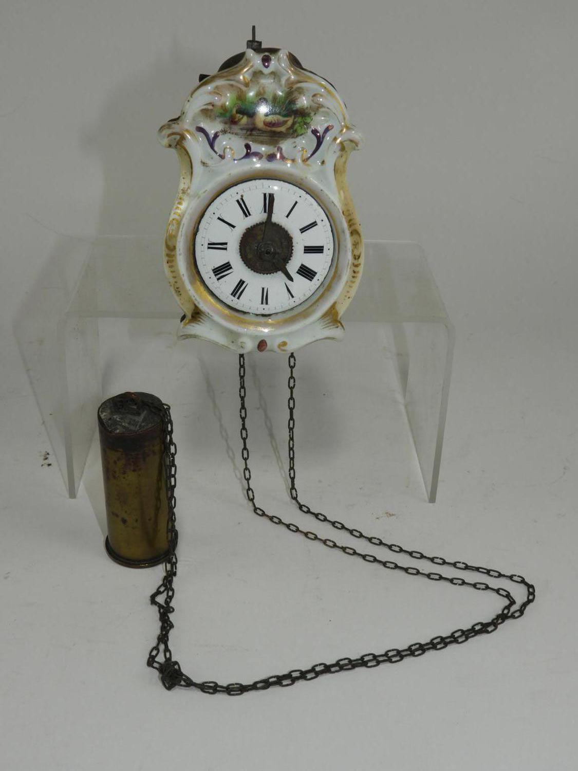 19th century miniature wall clock with porcelain face and enamel dial, 5" x 3 1/2"