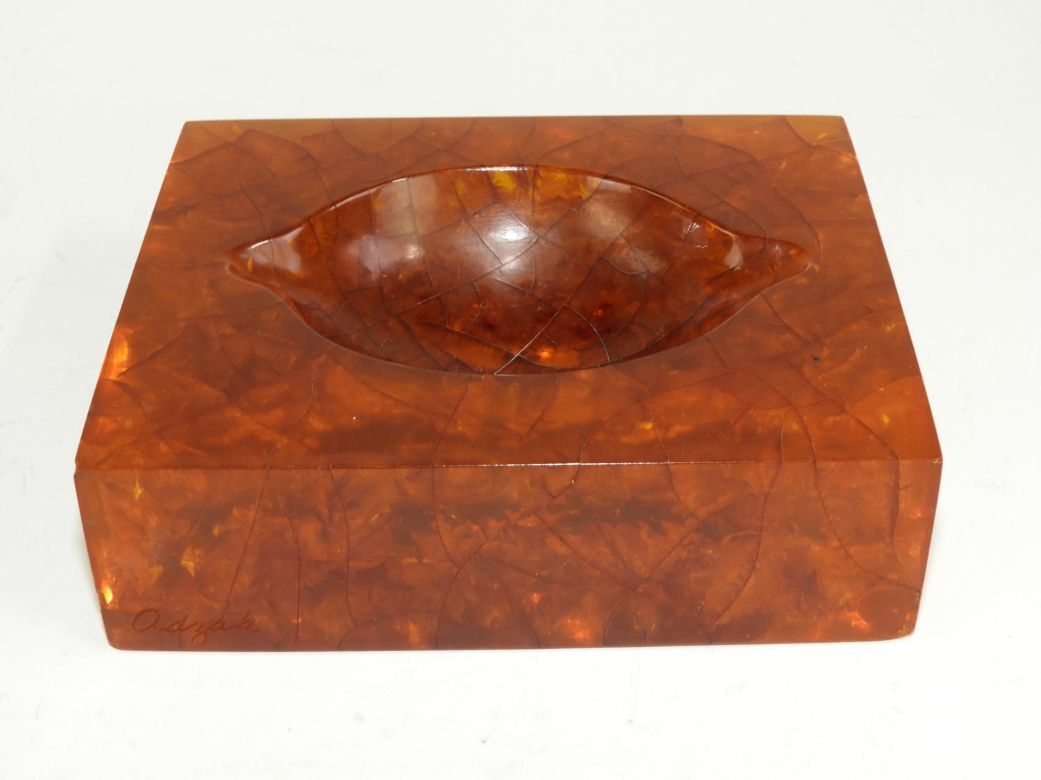 vintage amber cigar ash tray signed adzak, 1 1/2" x 5" x 4 1/2"