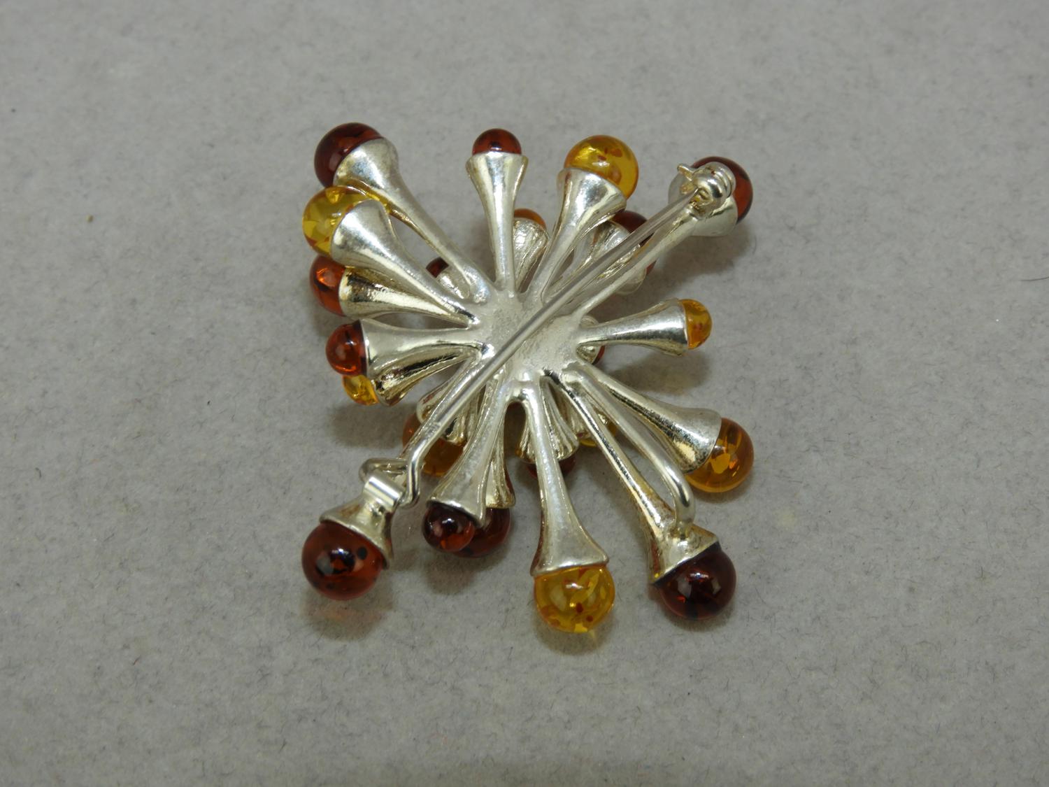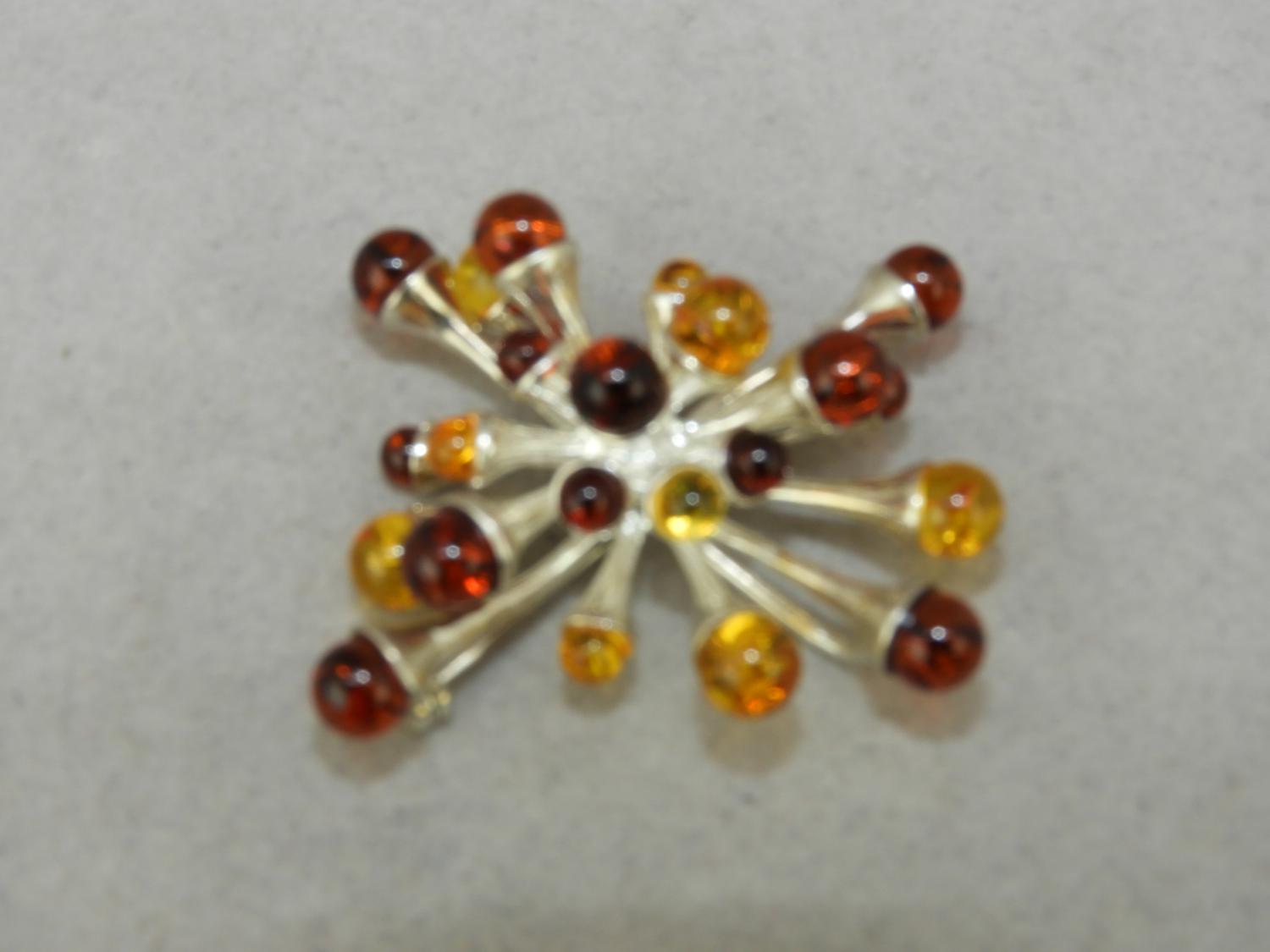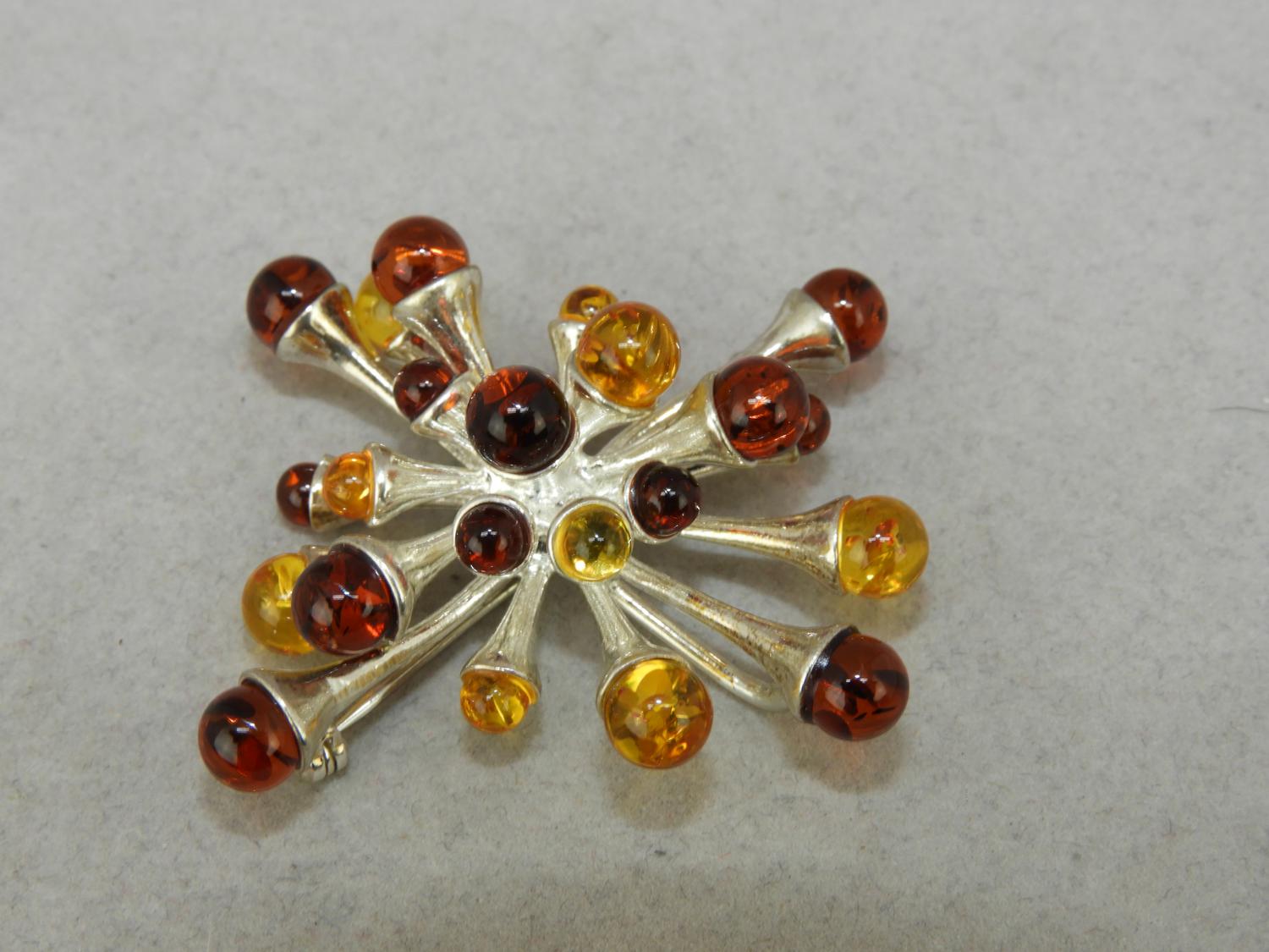 abstract silver and amber brooch, pendant, 1 3/4" across