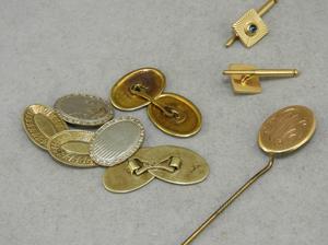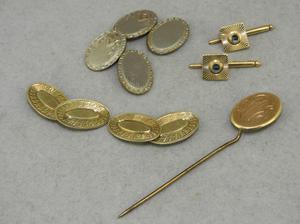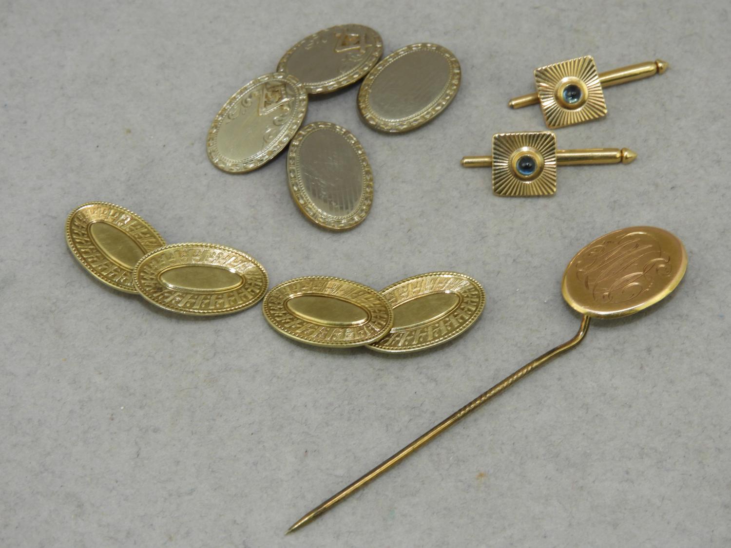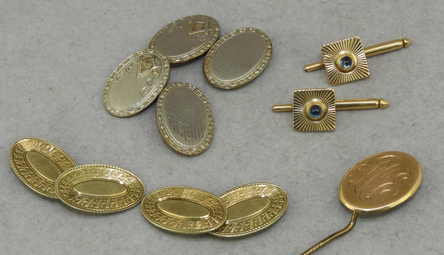 3 pr of 14k yellow gold cufflinks, gold filled stickpin in box