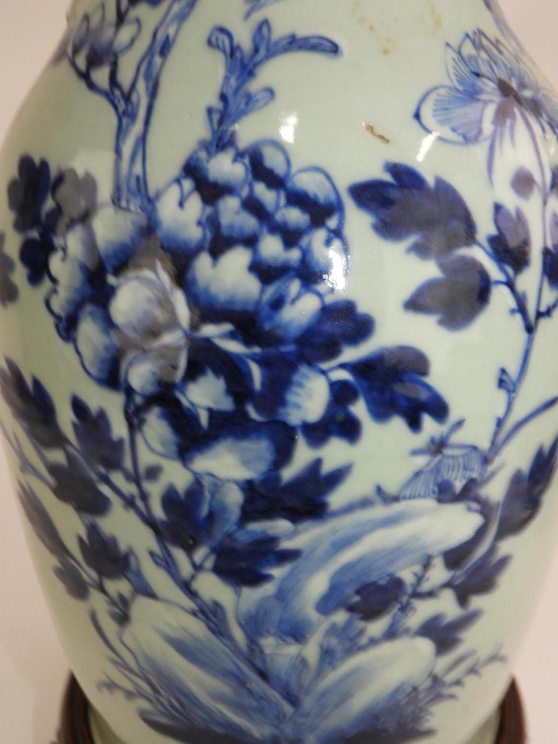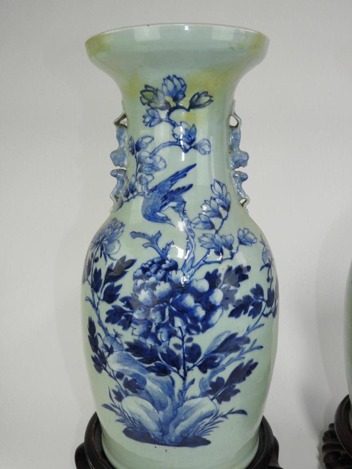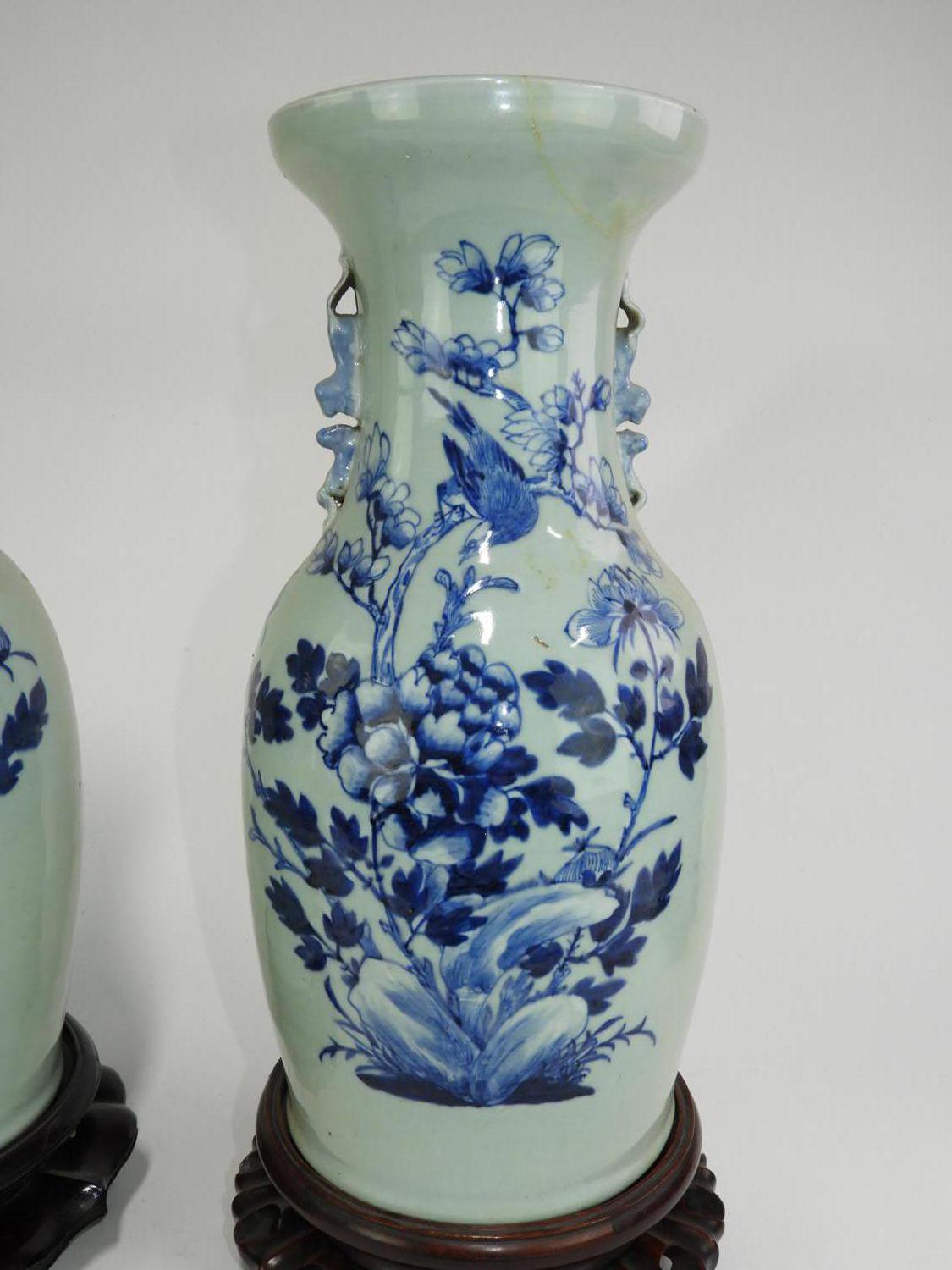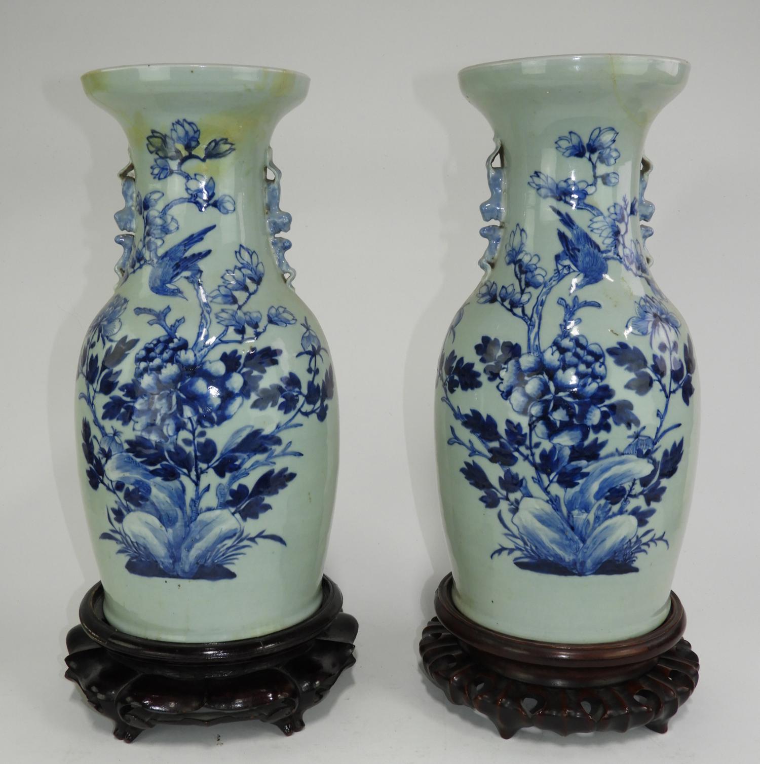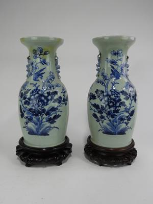 pair of chinese blue and white vases on stands, ht. 20 1/2", with restorations