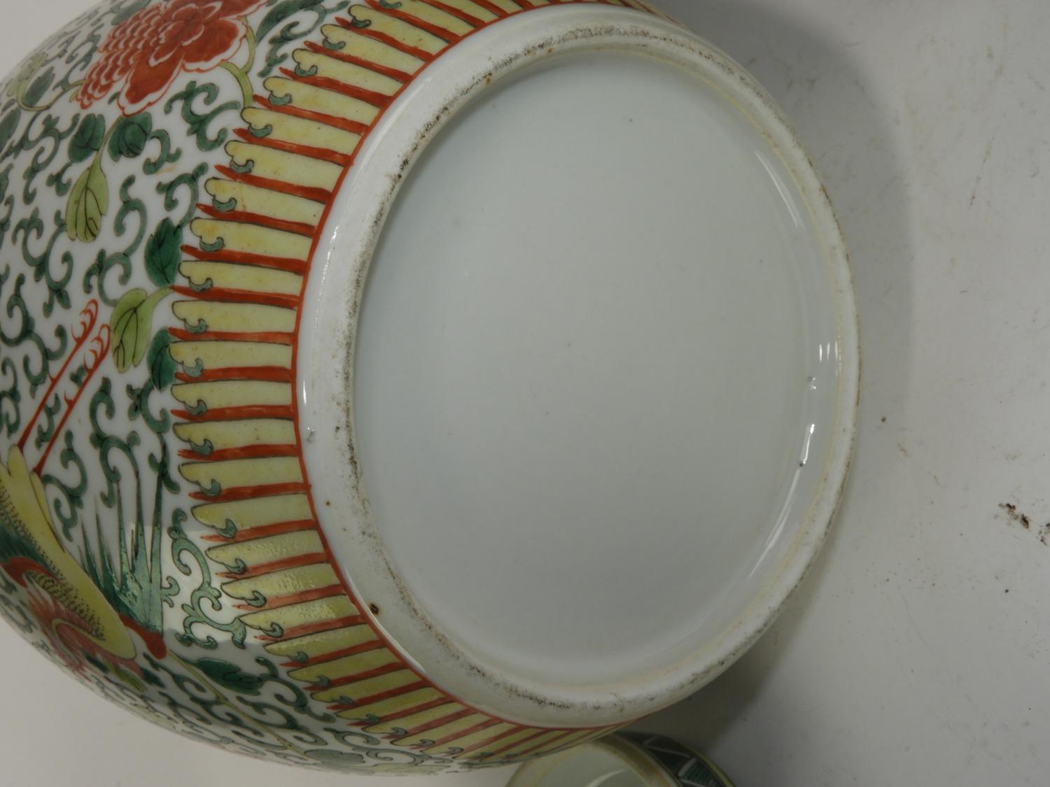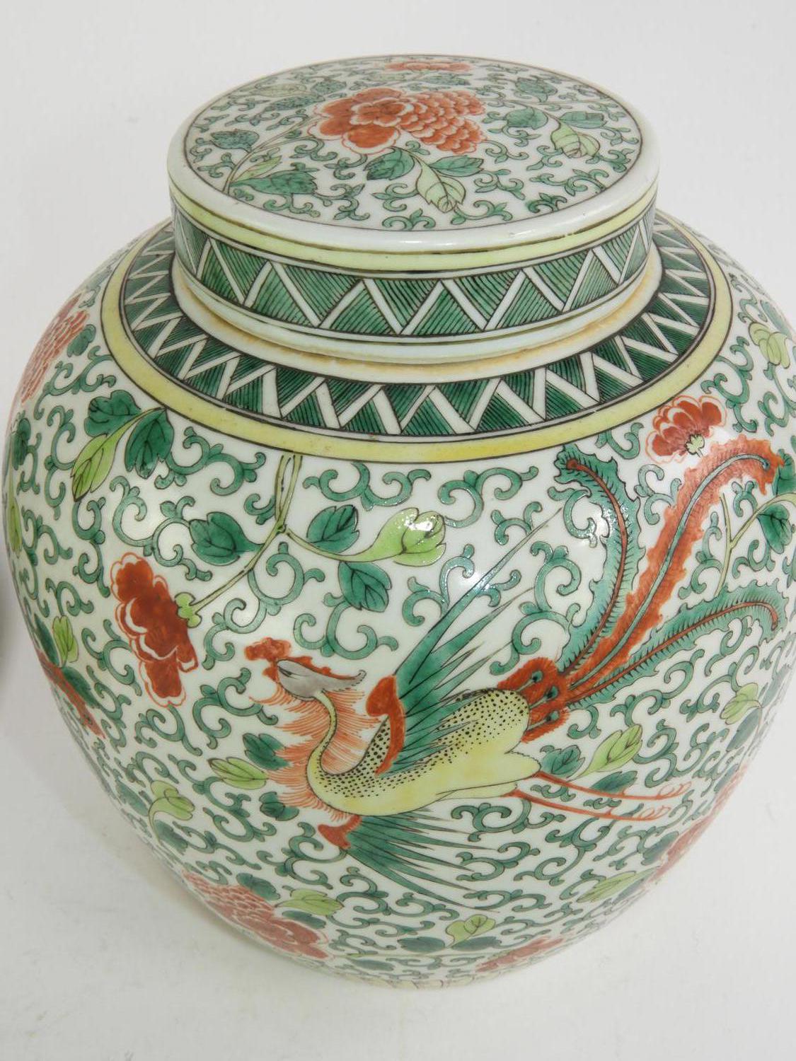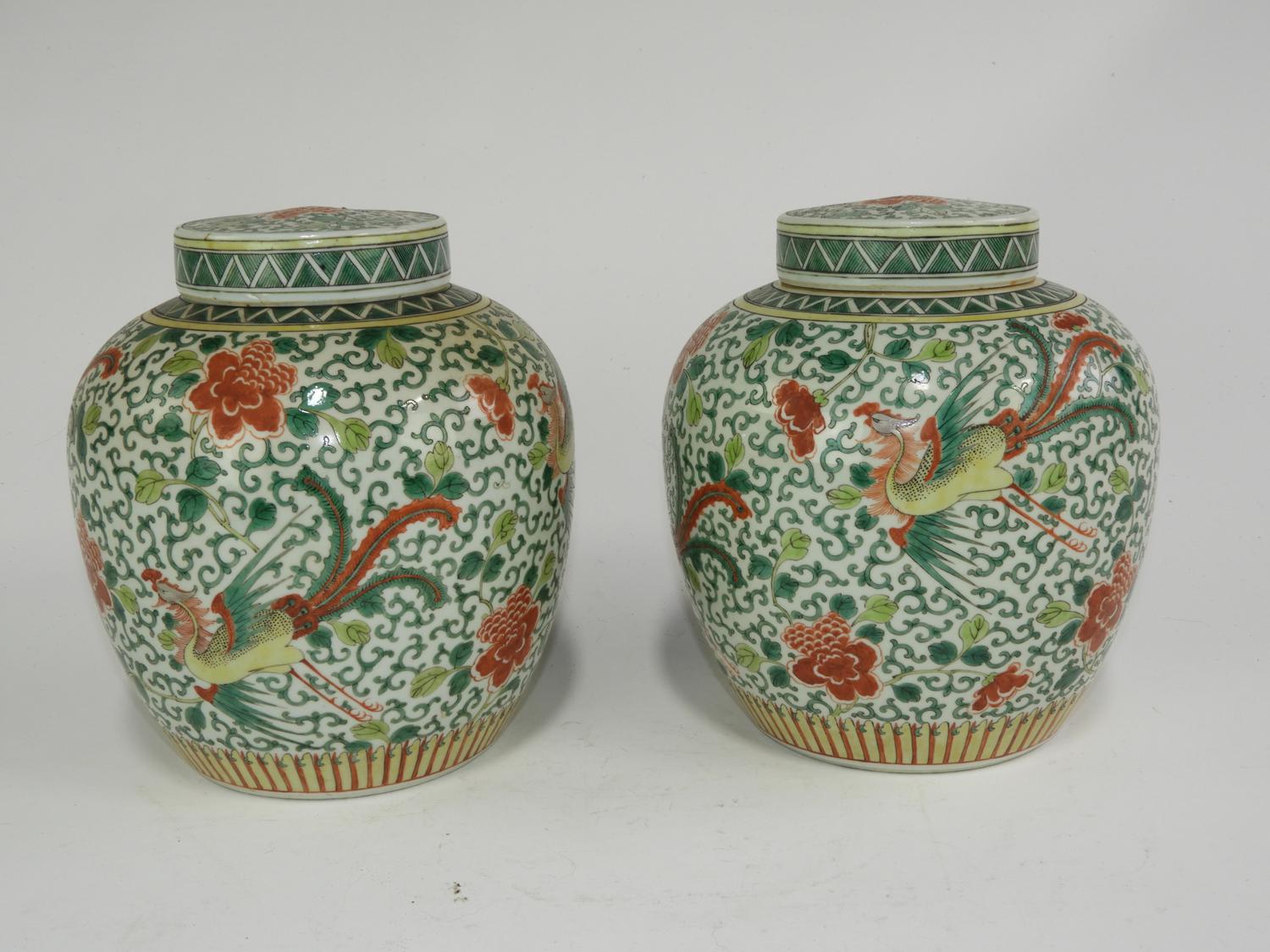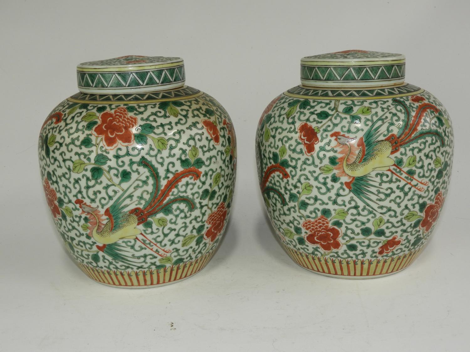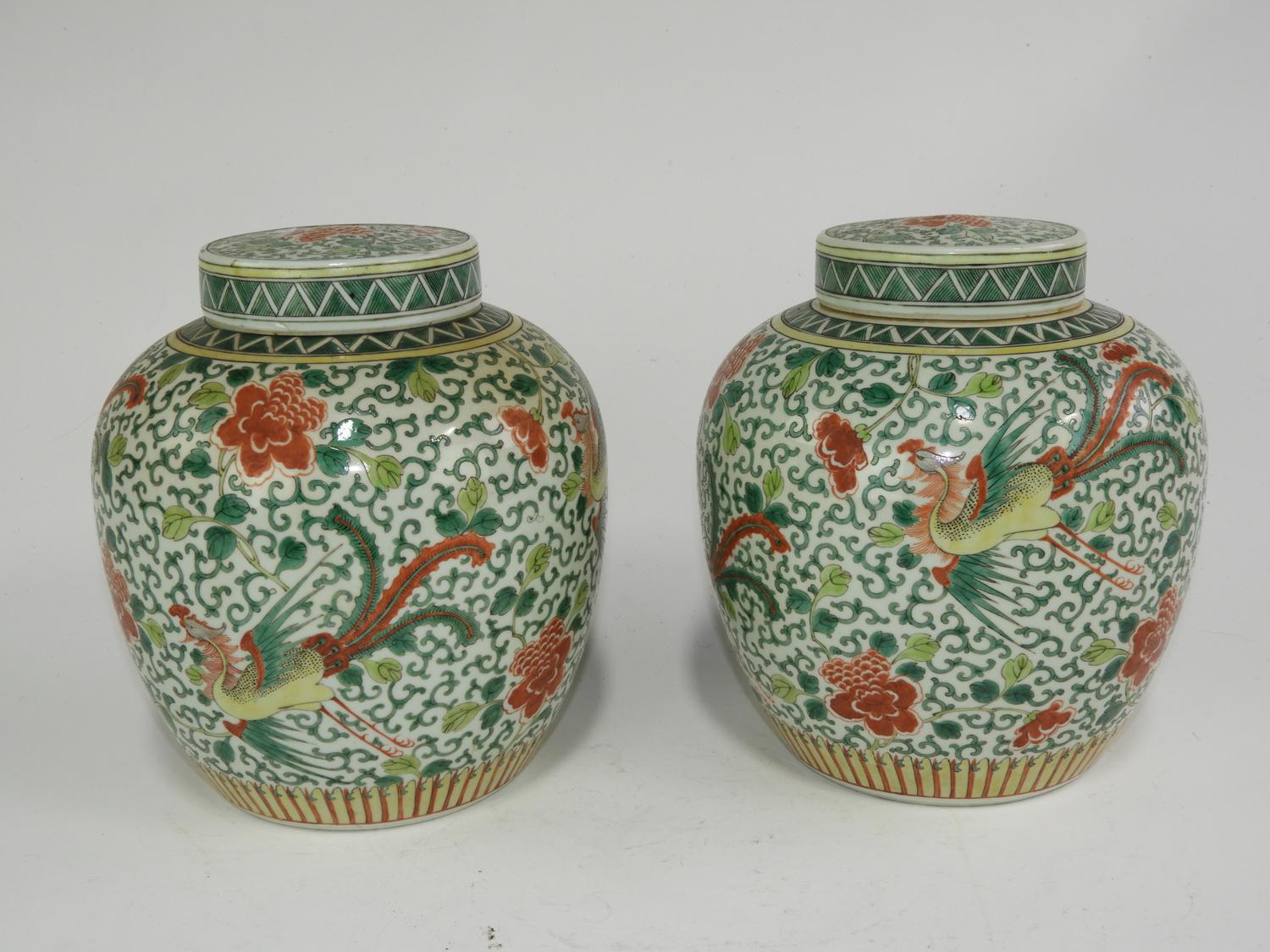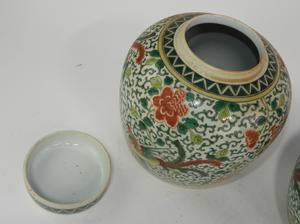 pair of chinese famille vert covered ginger jars, ht. 9 1/4"