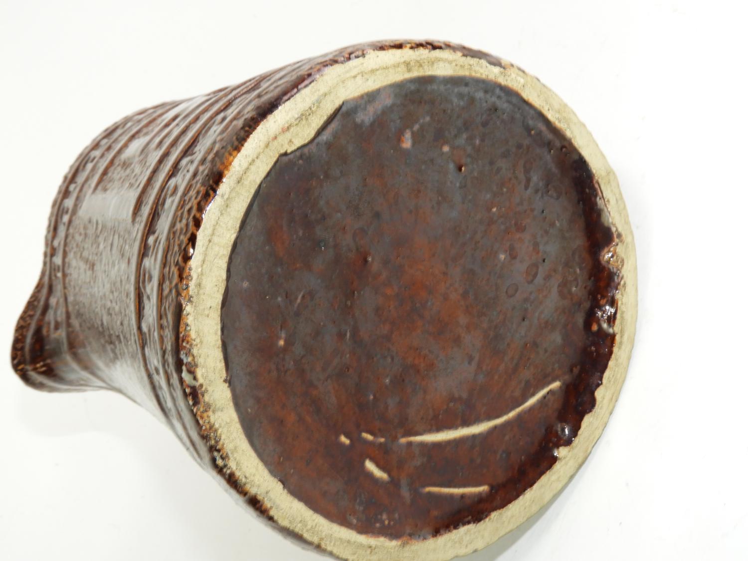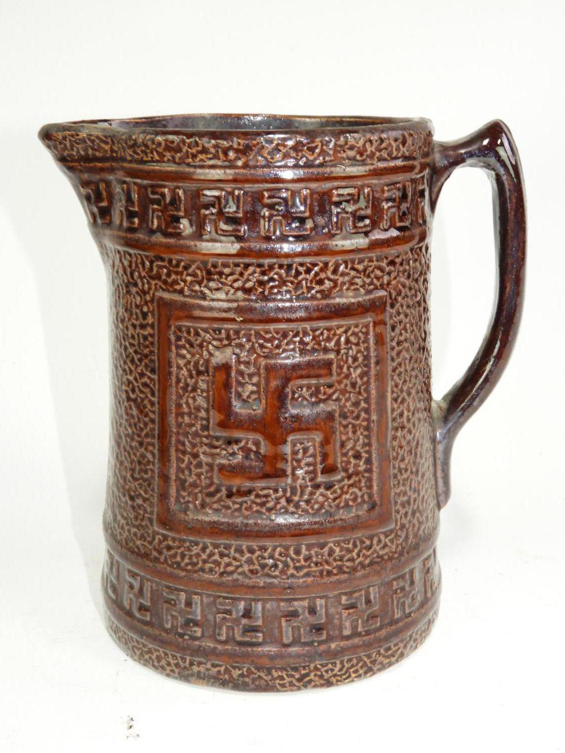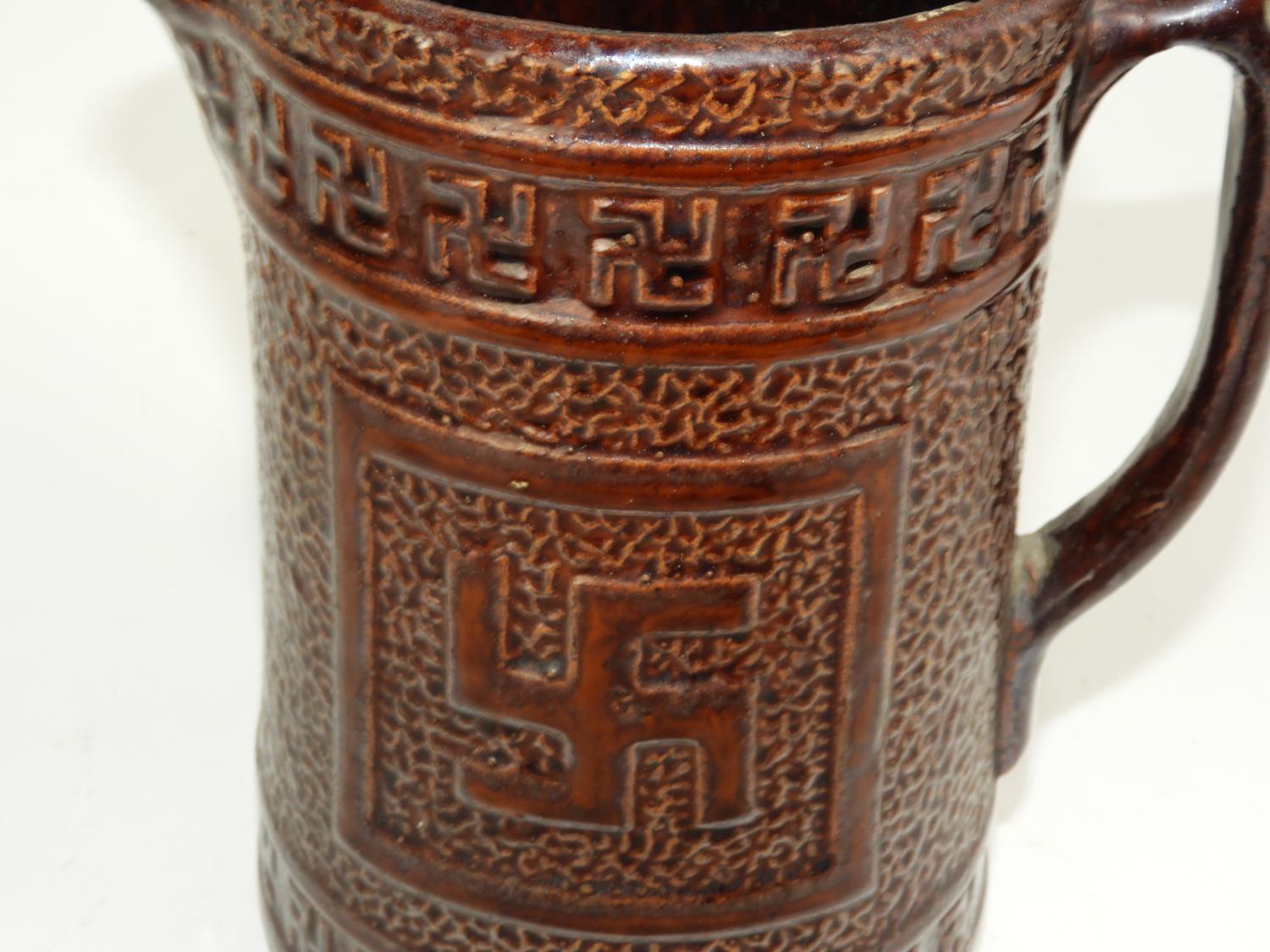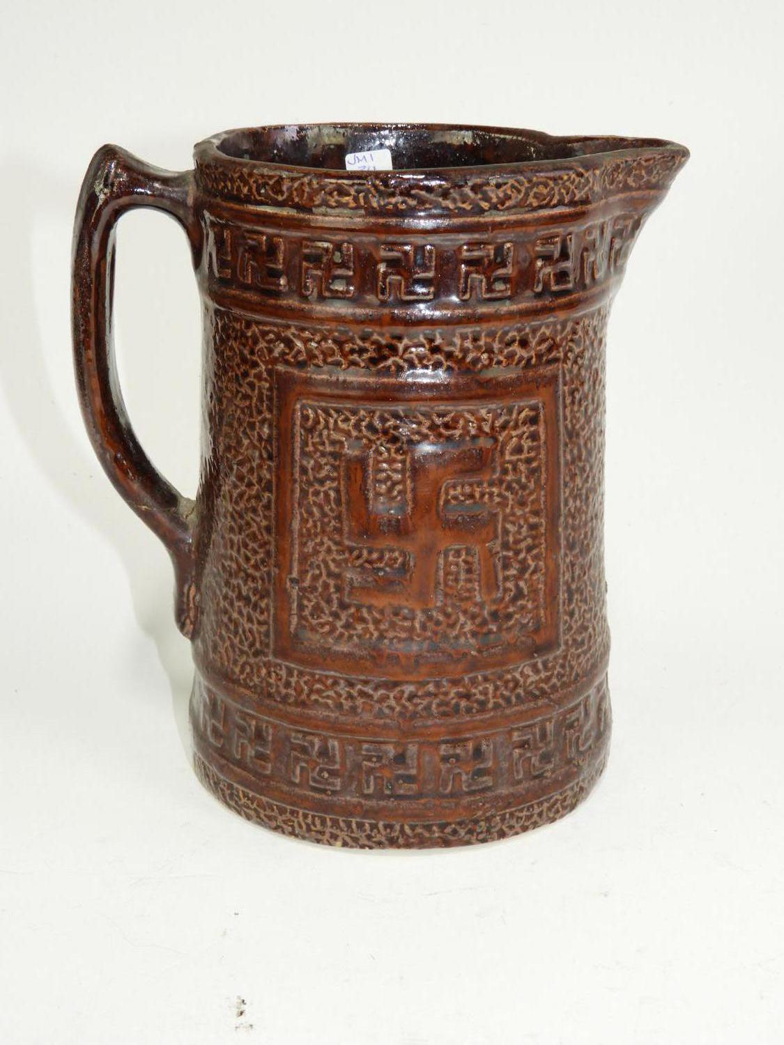 19th century brown glazed pitcher decorated with a swastika, ht 8 1/4"