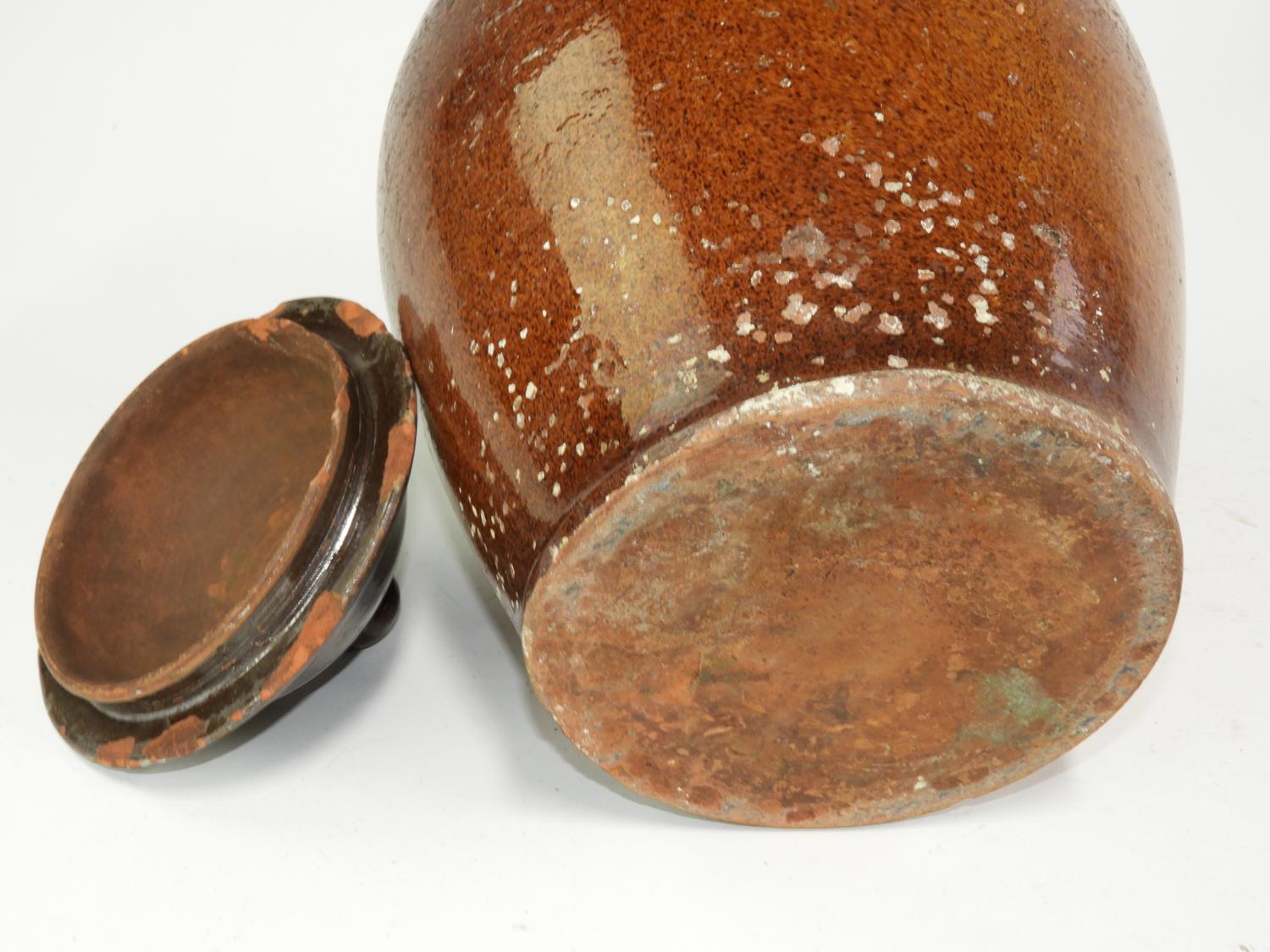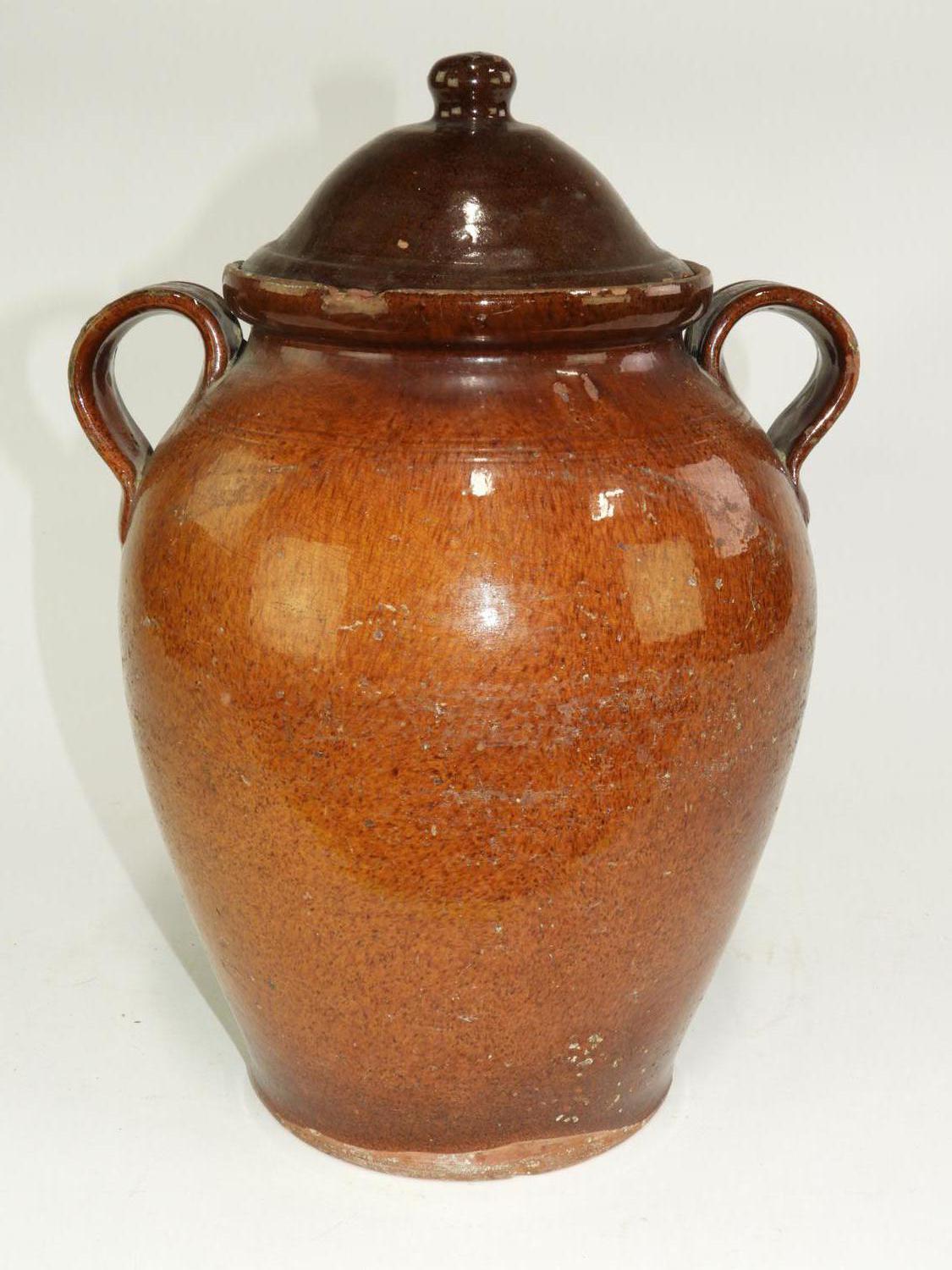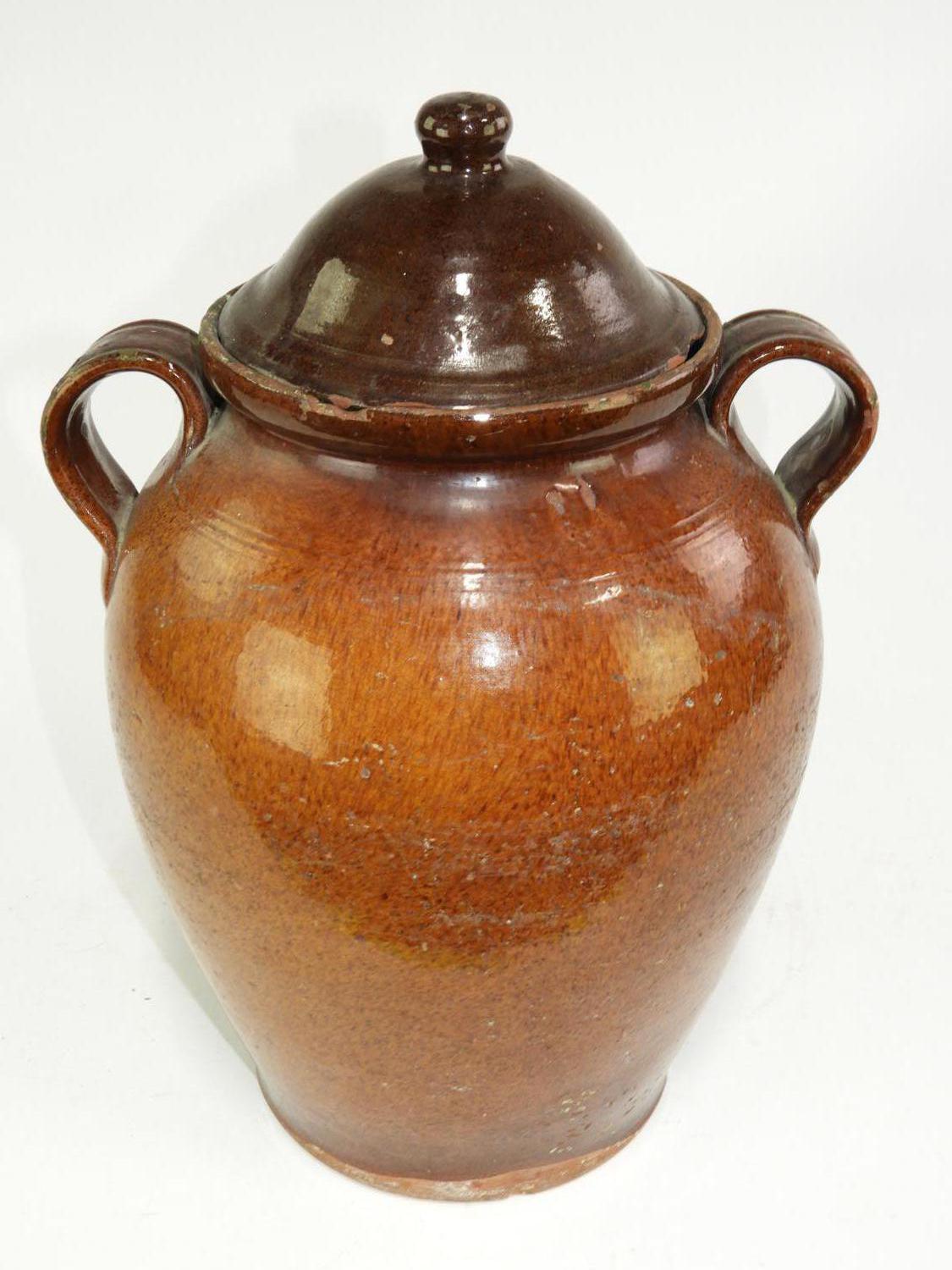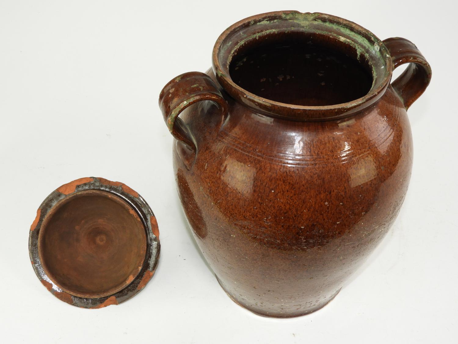 19th century redware two handled covered pot, ht. 15 1/2"