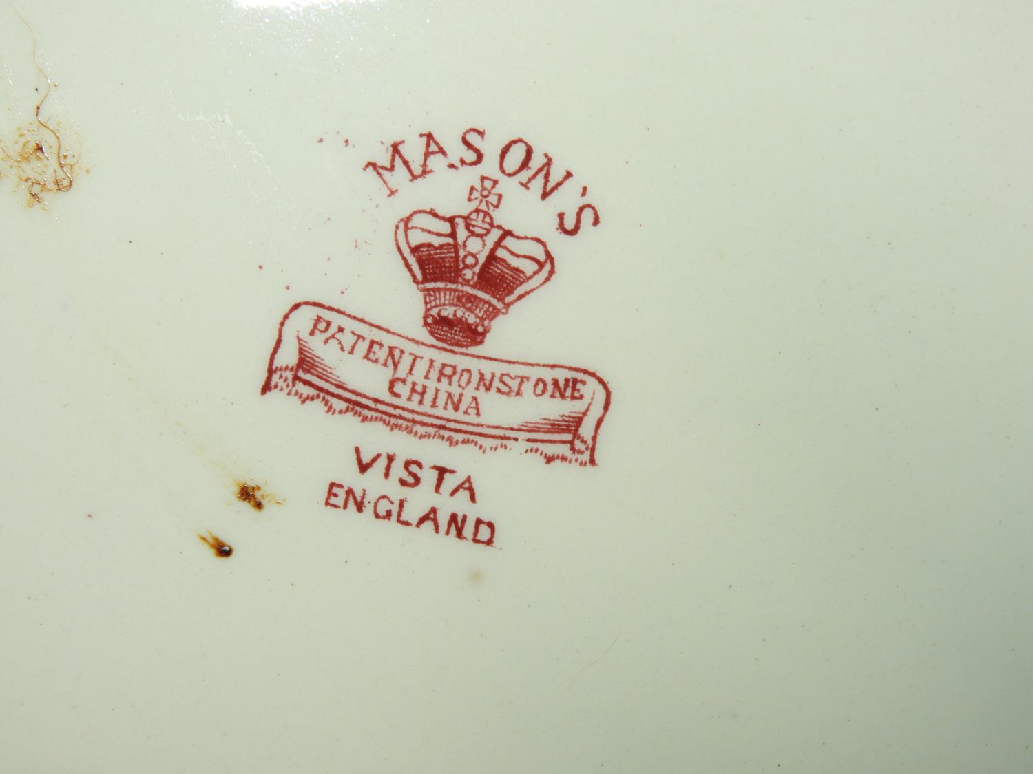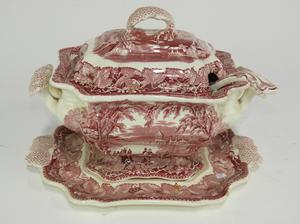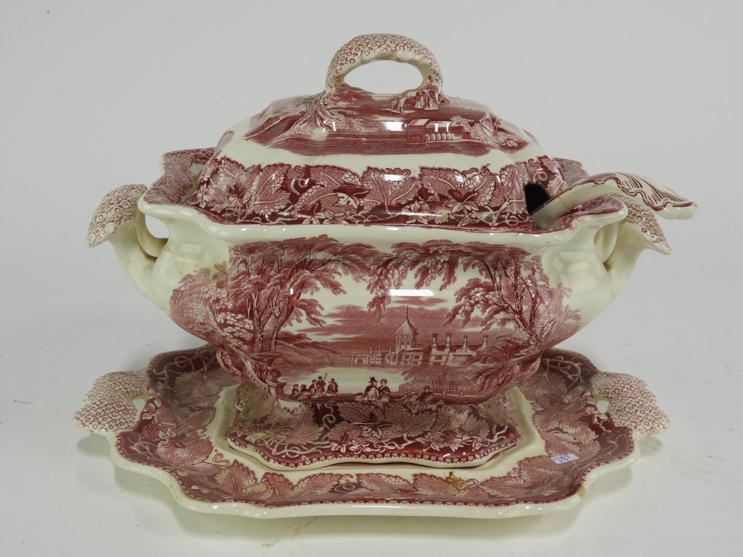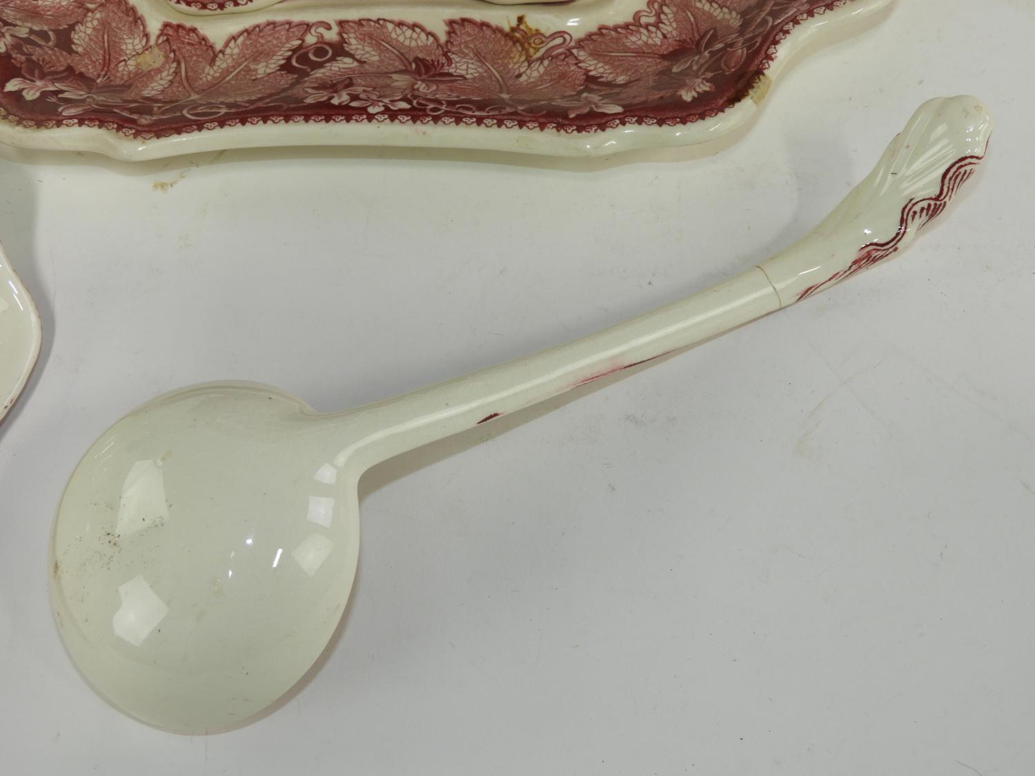 masons "vista" red transfer print covered tureen on stand with ladle, ladle has been repaired