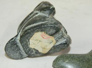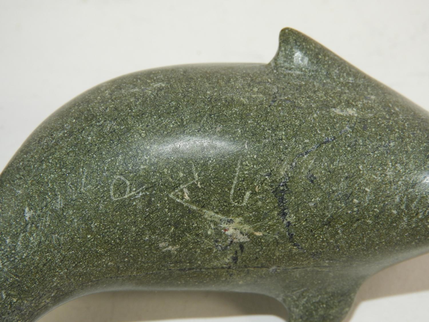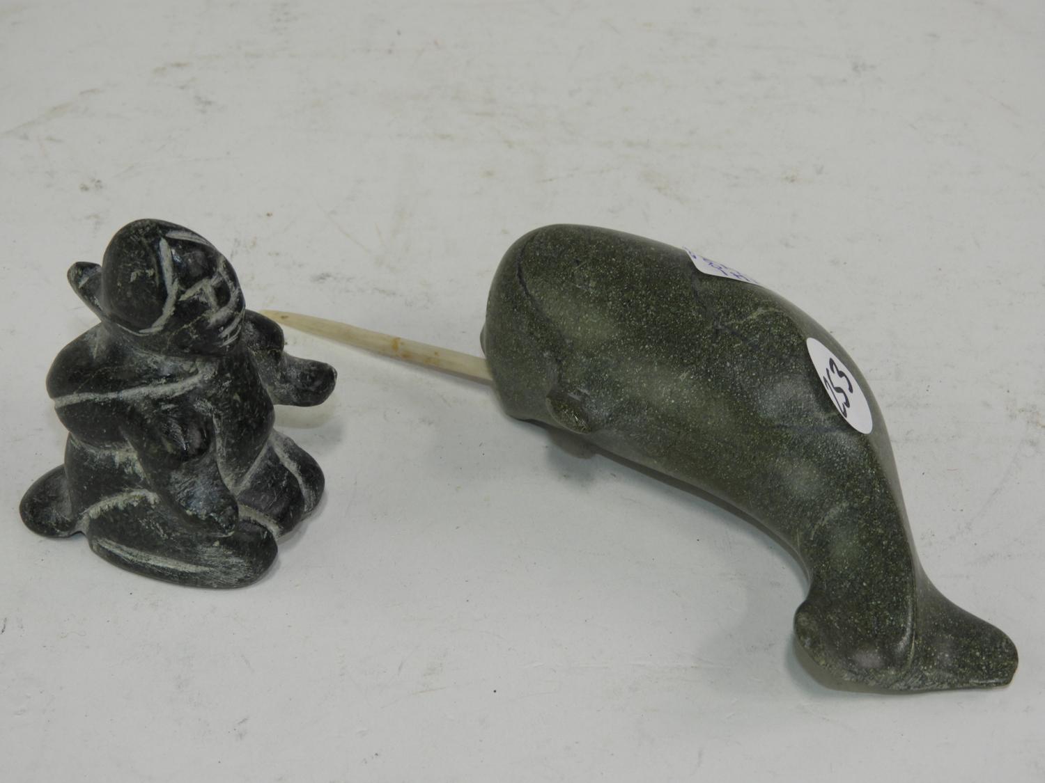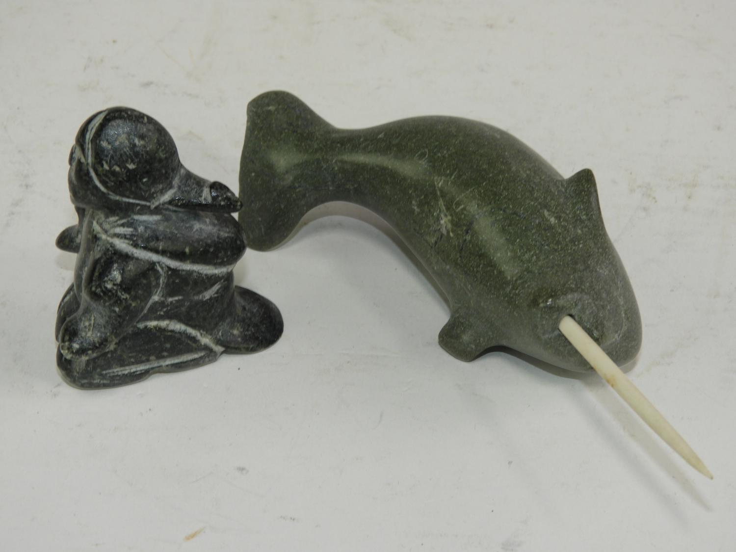 2 inuit carved stone sculptures narwhale & hunter