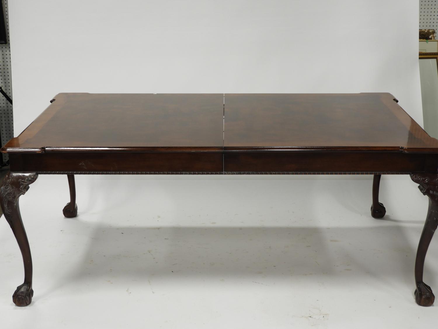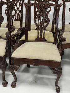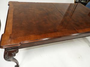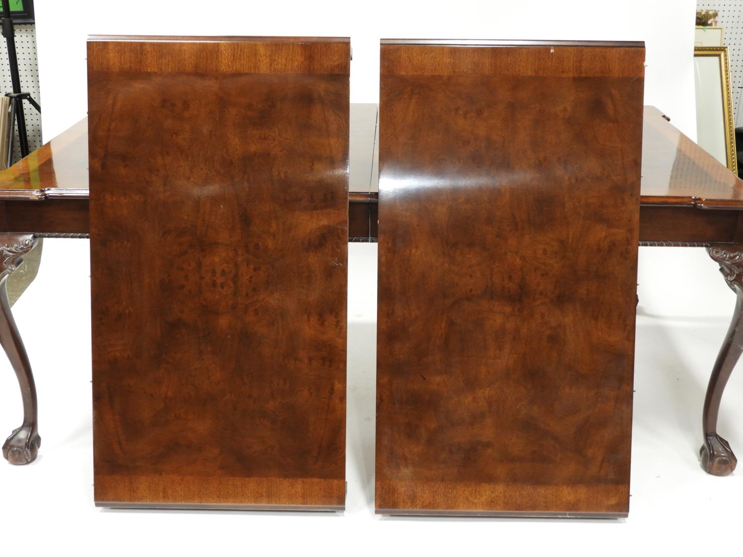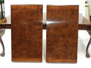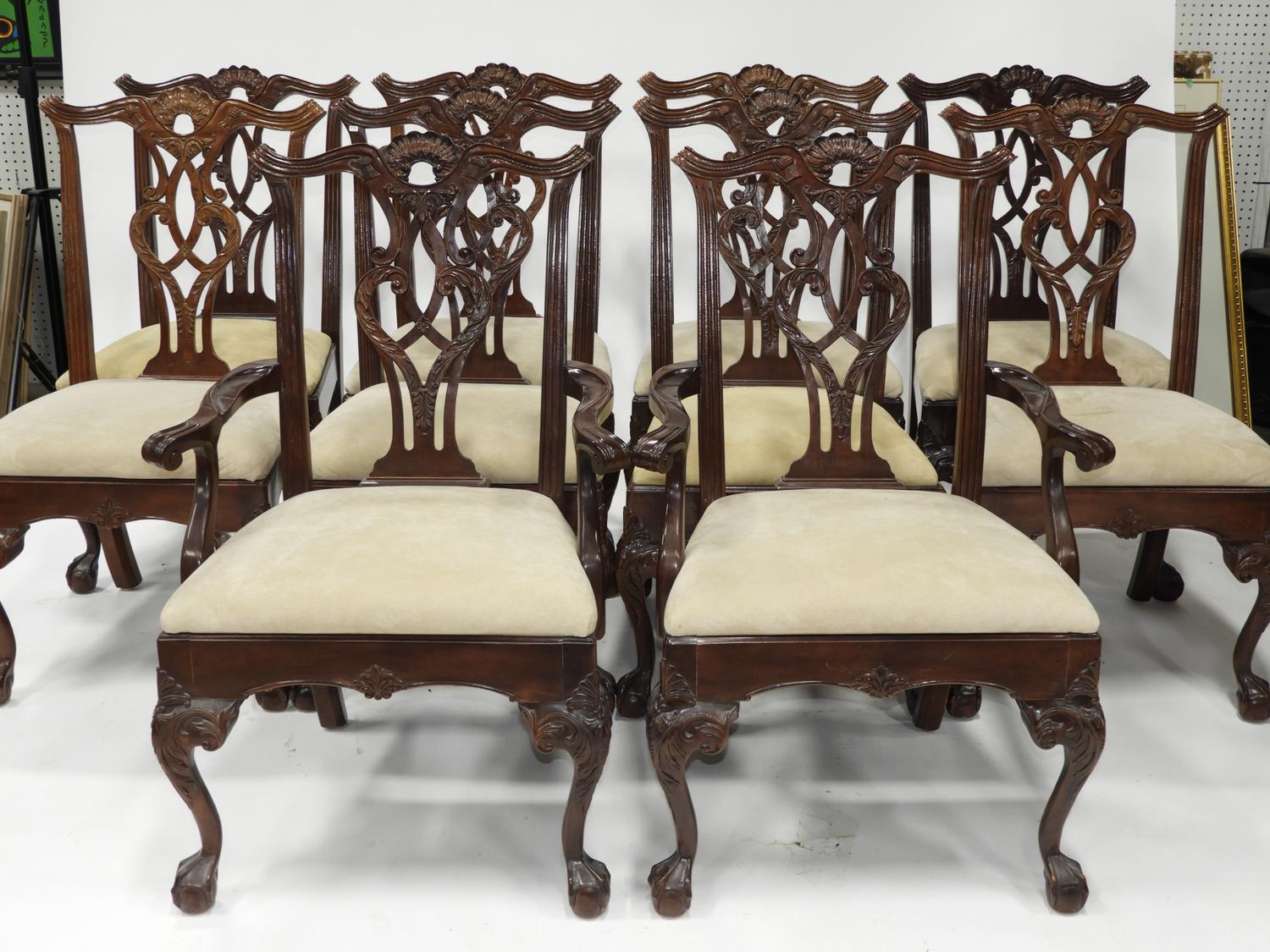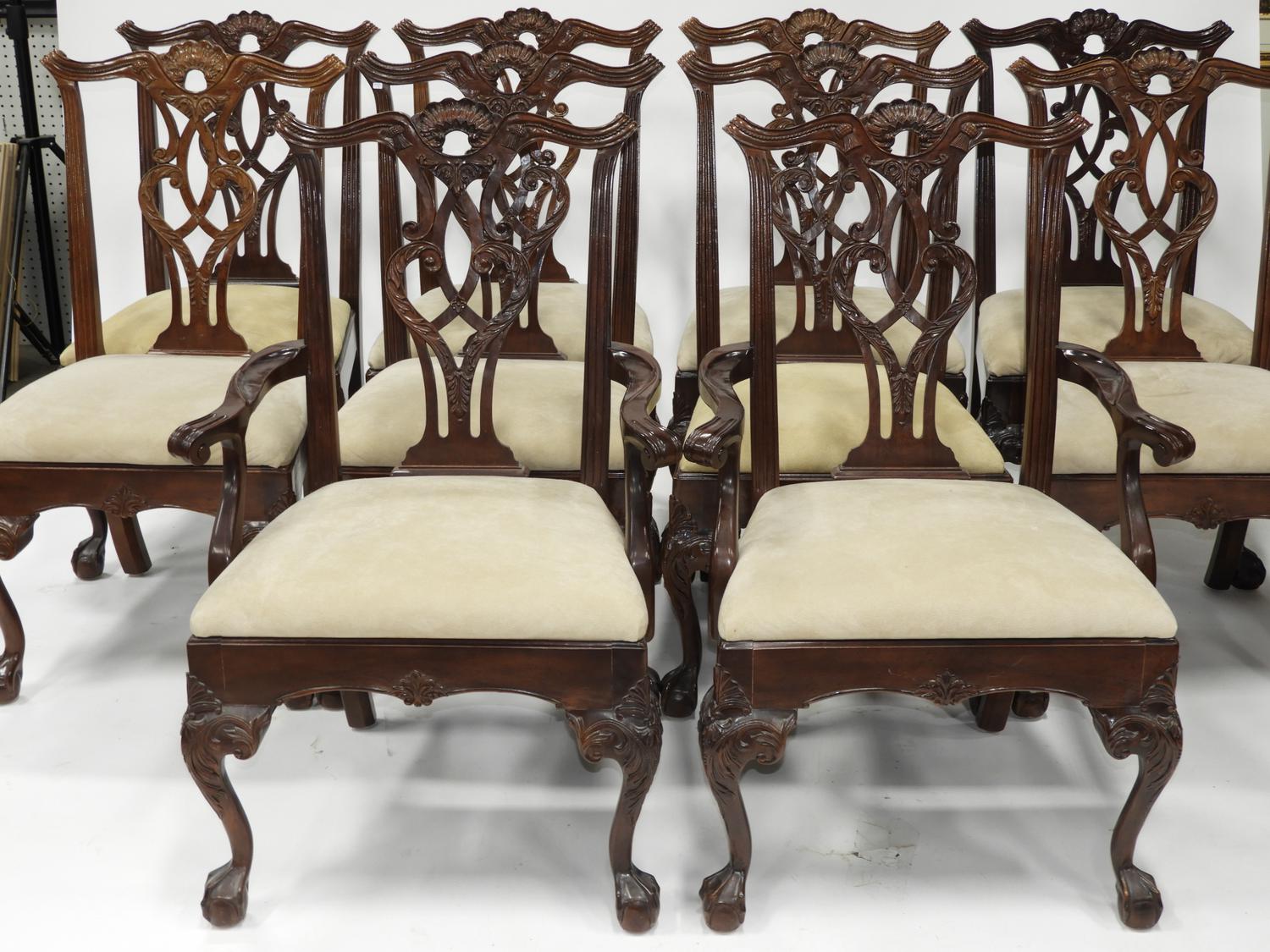 chippendale style inlaid mahogany extending dining table with two leaves and ten matching chairs including two armchairs, rittenhouse square by henredon, late 20th century, 30" x 75" x 44"