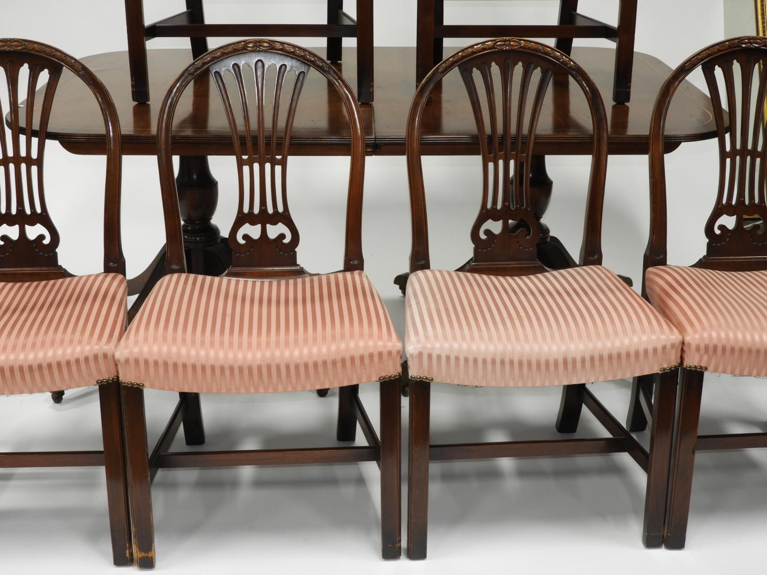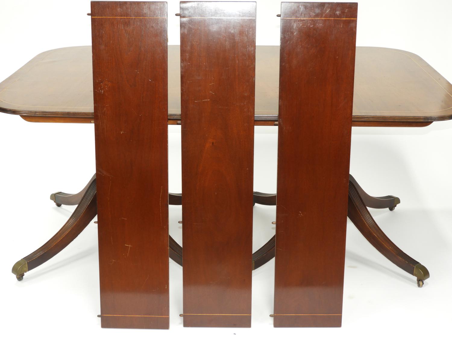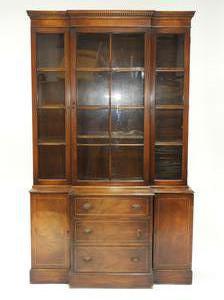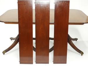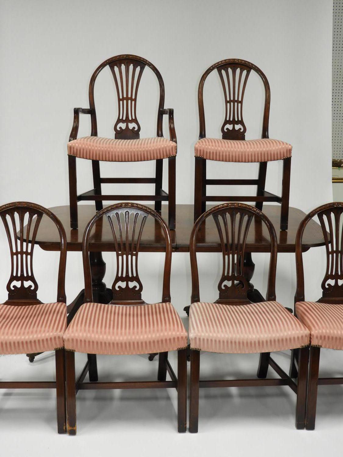 nine piece mahogany dining suite, english, early 20th century, double pedestal dining table with 3 leaves breckfront china cabinet sideboard six dining chairs including one armchair