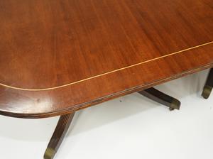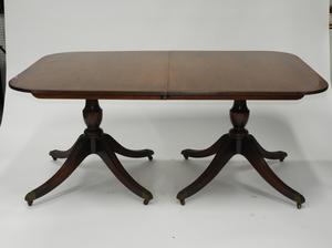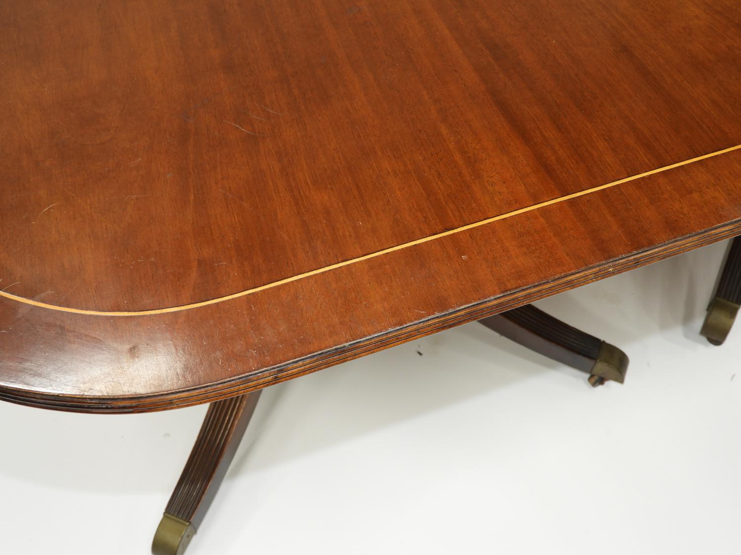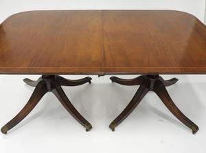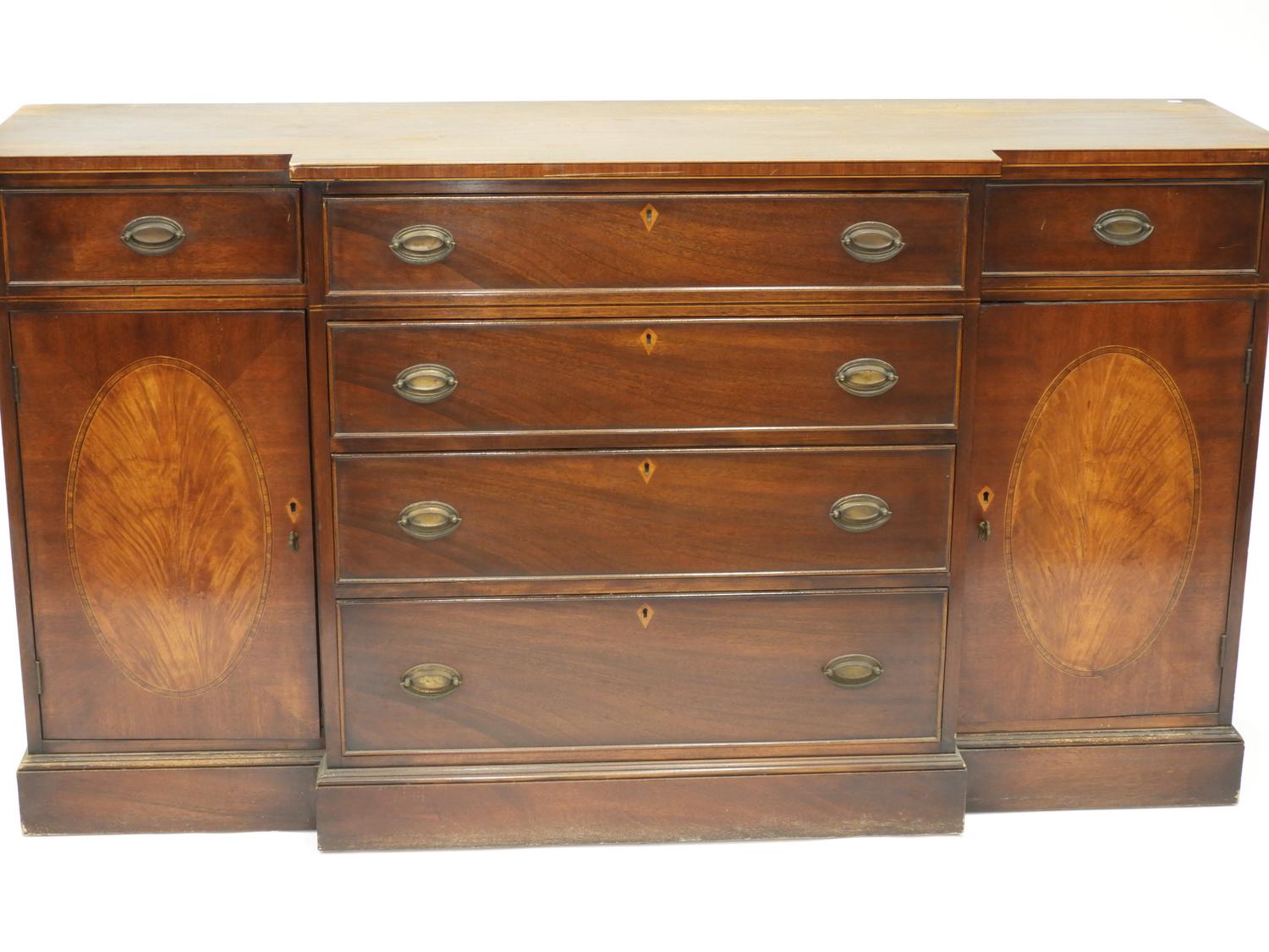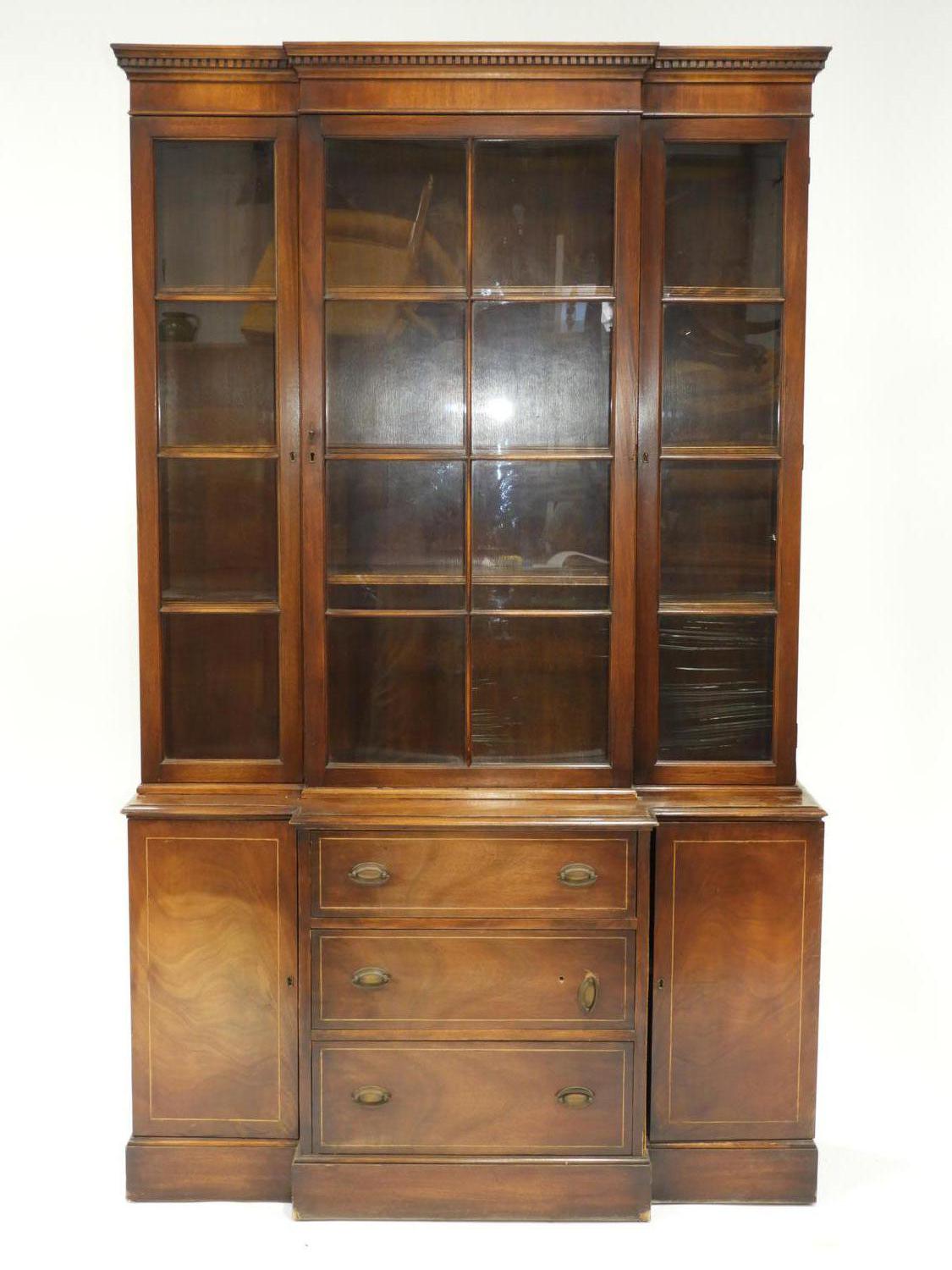 nine piece mahogany dining suite, english, early 20th century, double pedestal dining table with 3 leaves breckfront china cabinet sideboard six dining chairs including one armchair