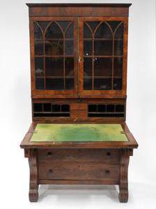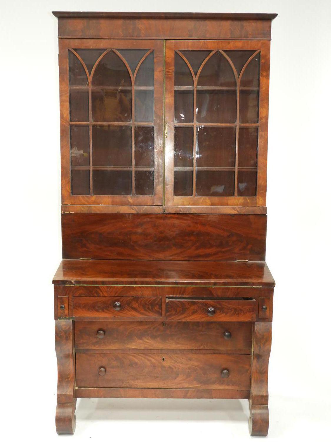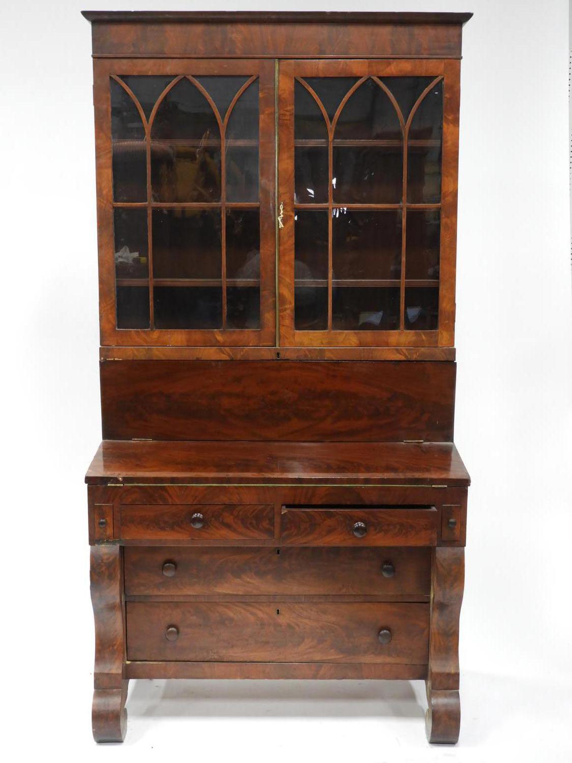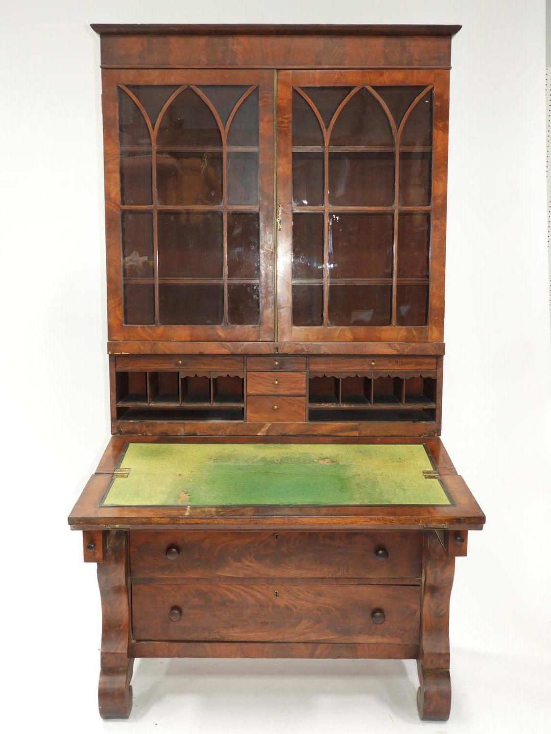 19th century mahogany bureau bookcase with gothic glazed doors, canadian, 87" x 36" x 28"