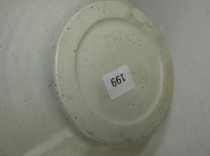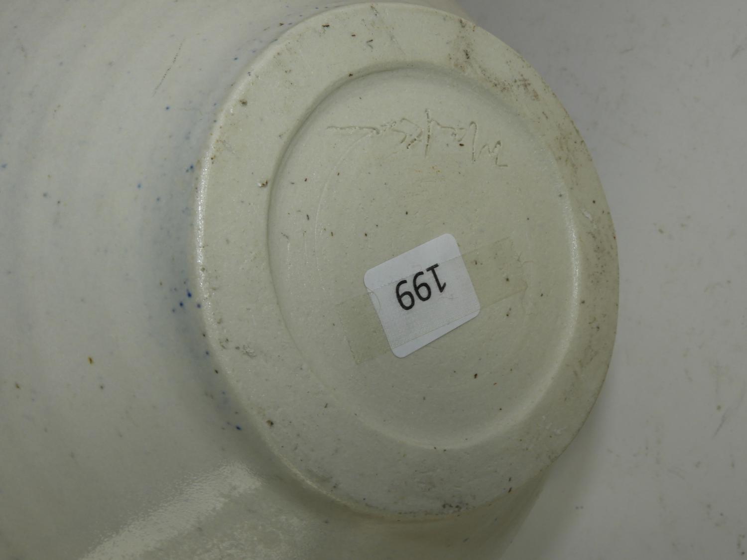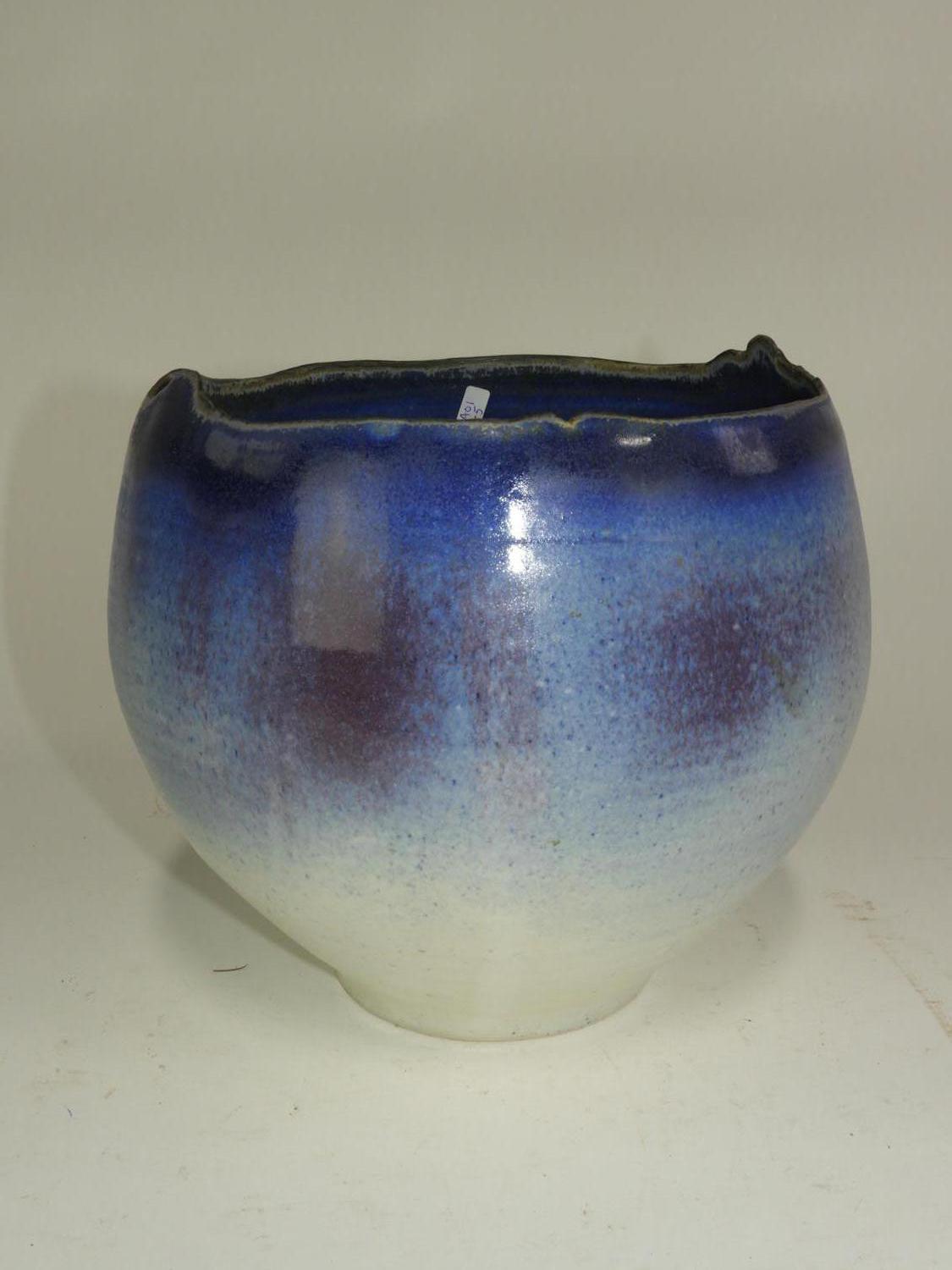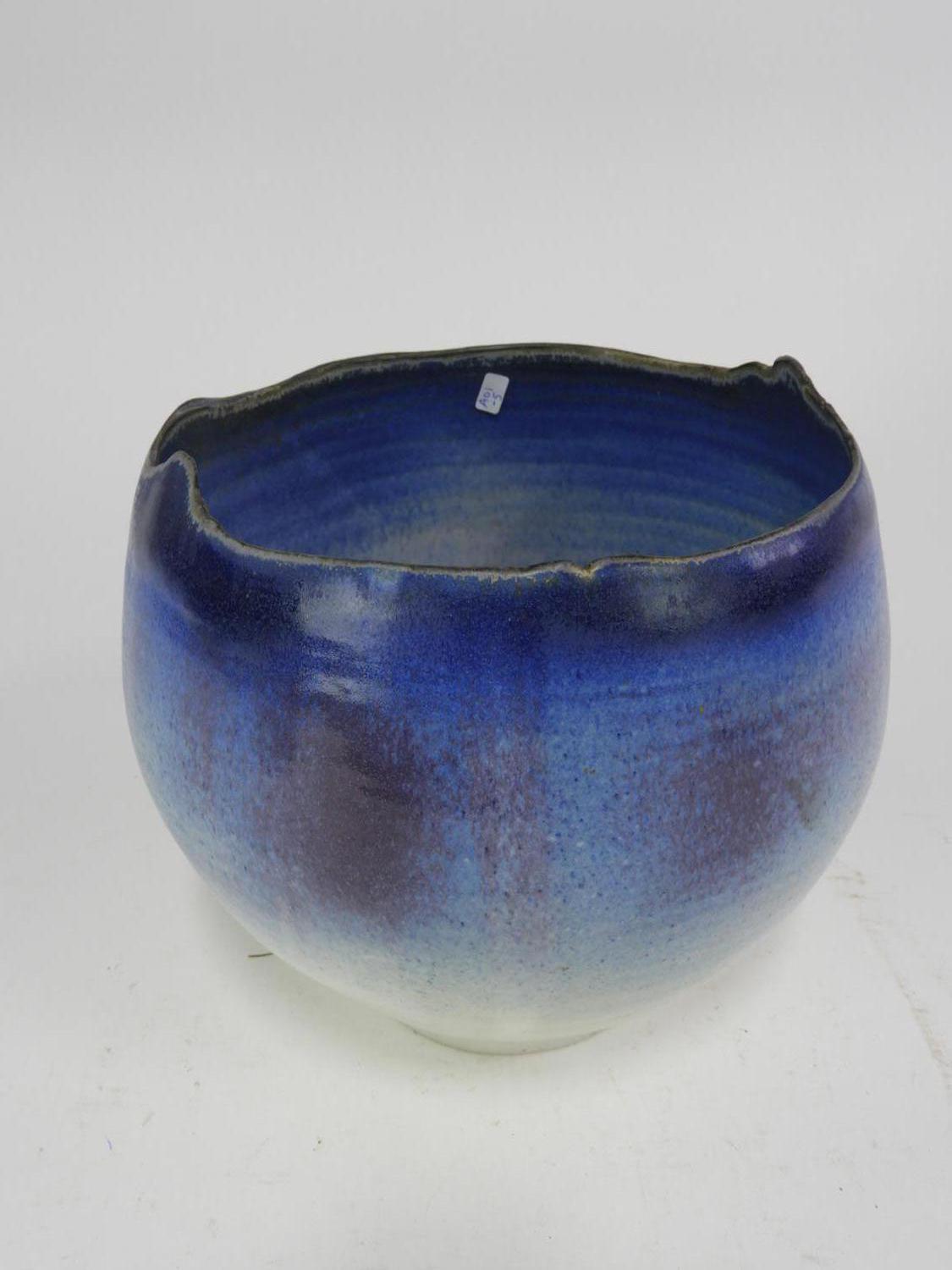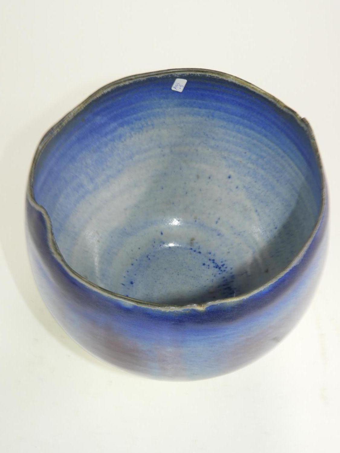blue glazed art pottery bowl, signed, 8 1/2" x 9 1/2"