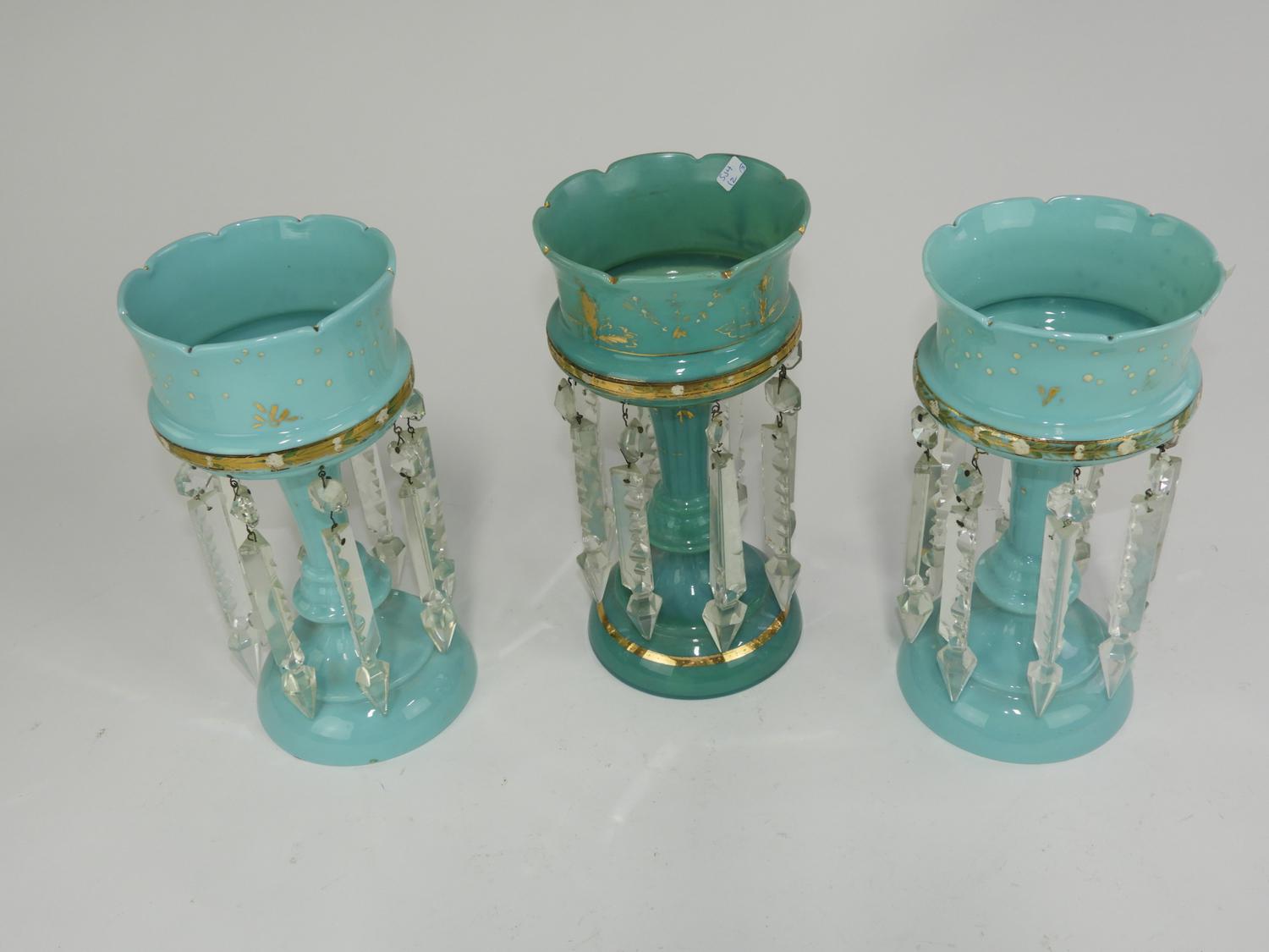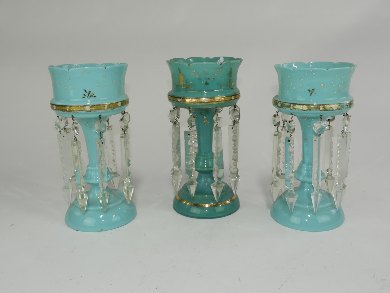 3 hand painted bristol glass lustres, ht 10 1/2"
