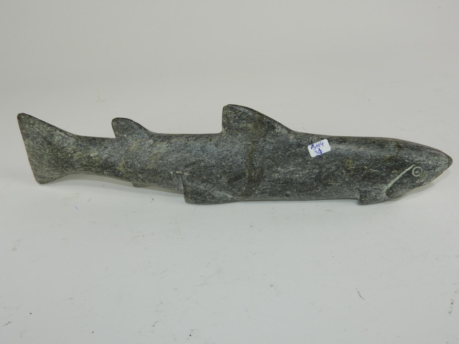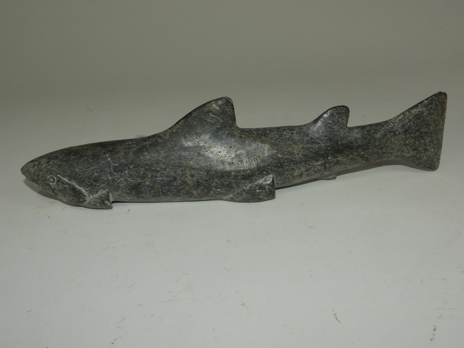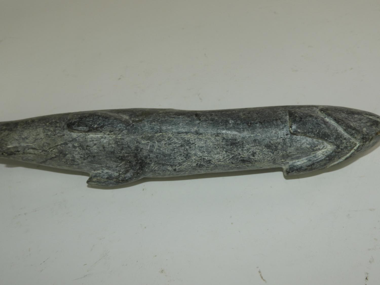 inuit carved stone fish, length 13 1/2"