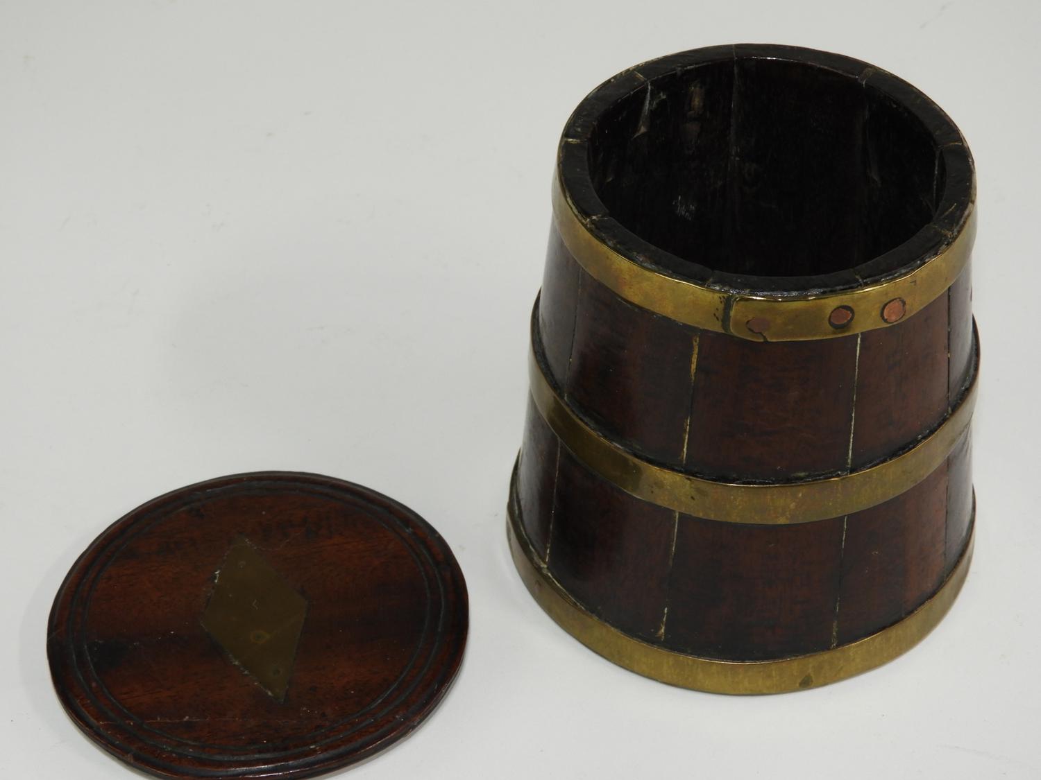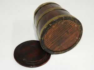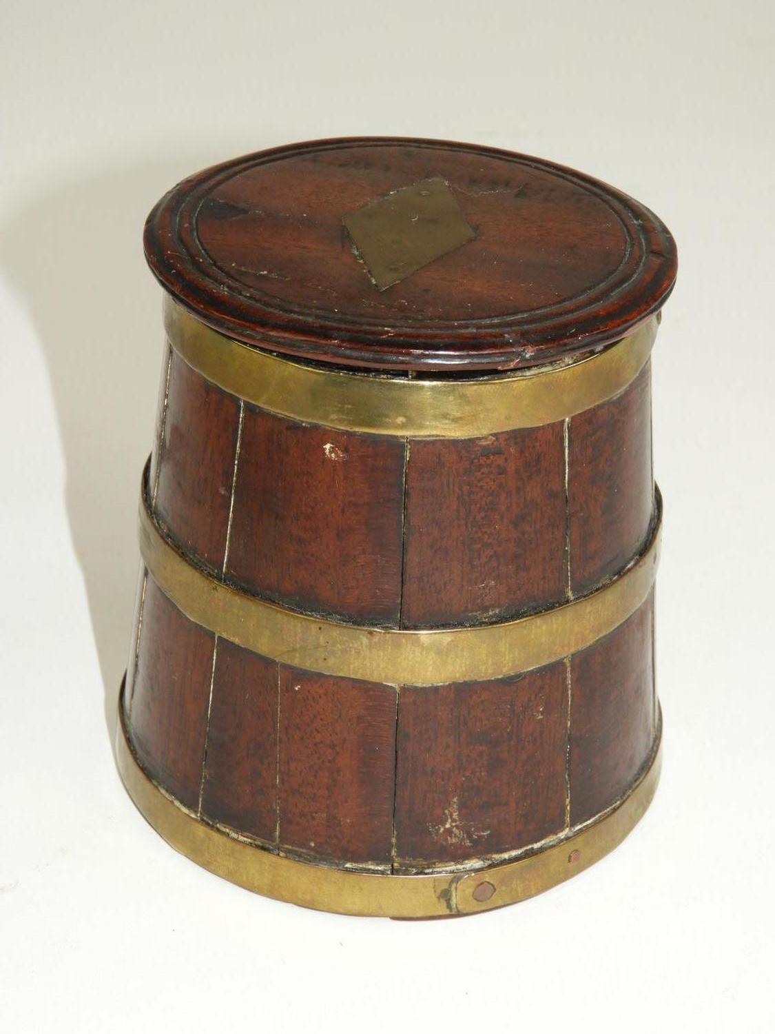 brass bound oak barrel-form box, 19th century, 4 3/4" x 4"