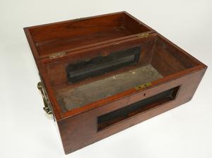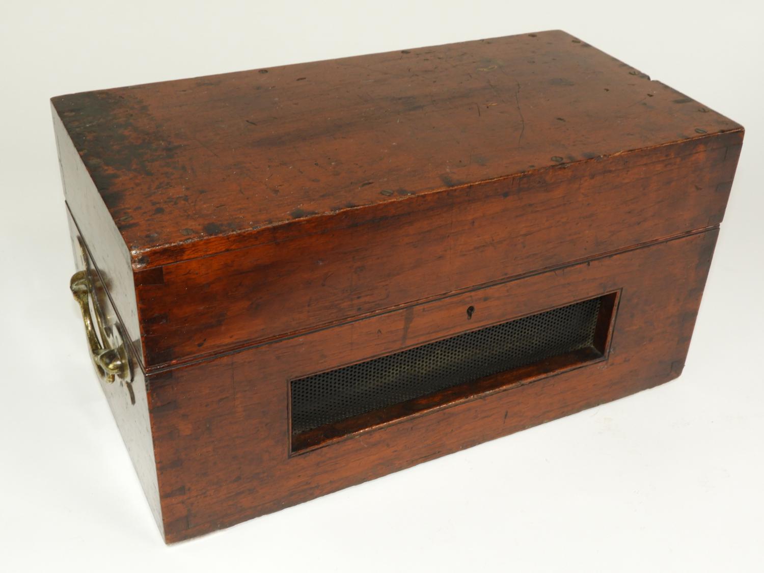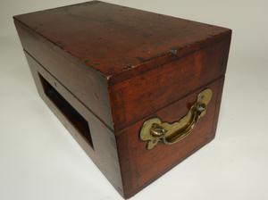 small 19th century mahogany trunk with brass bail handles, 9 1/2" x 19" x 9 1/2"