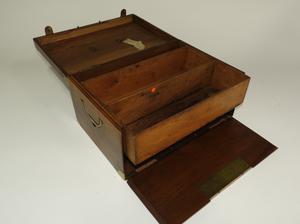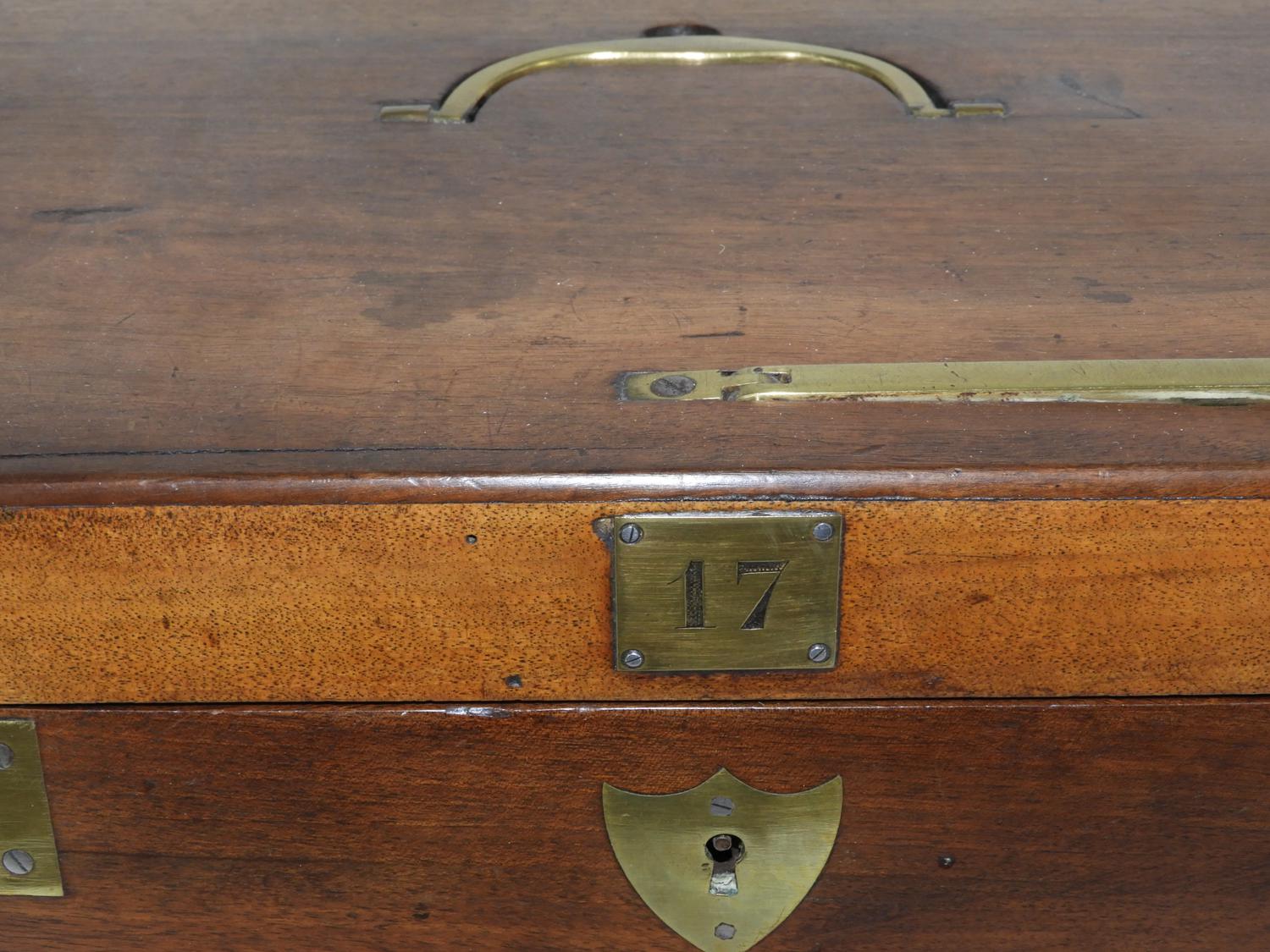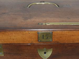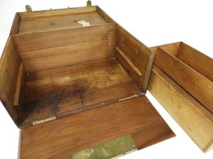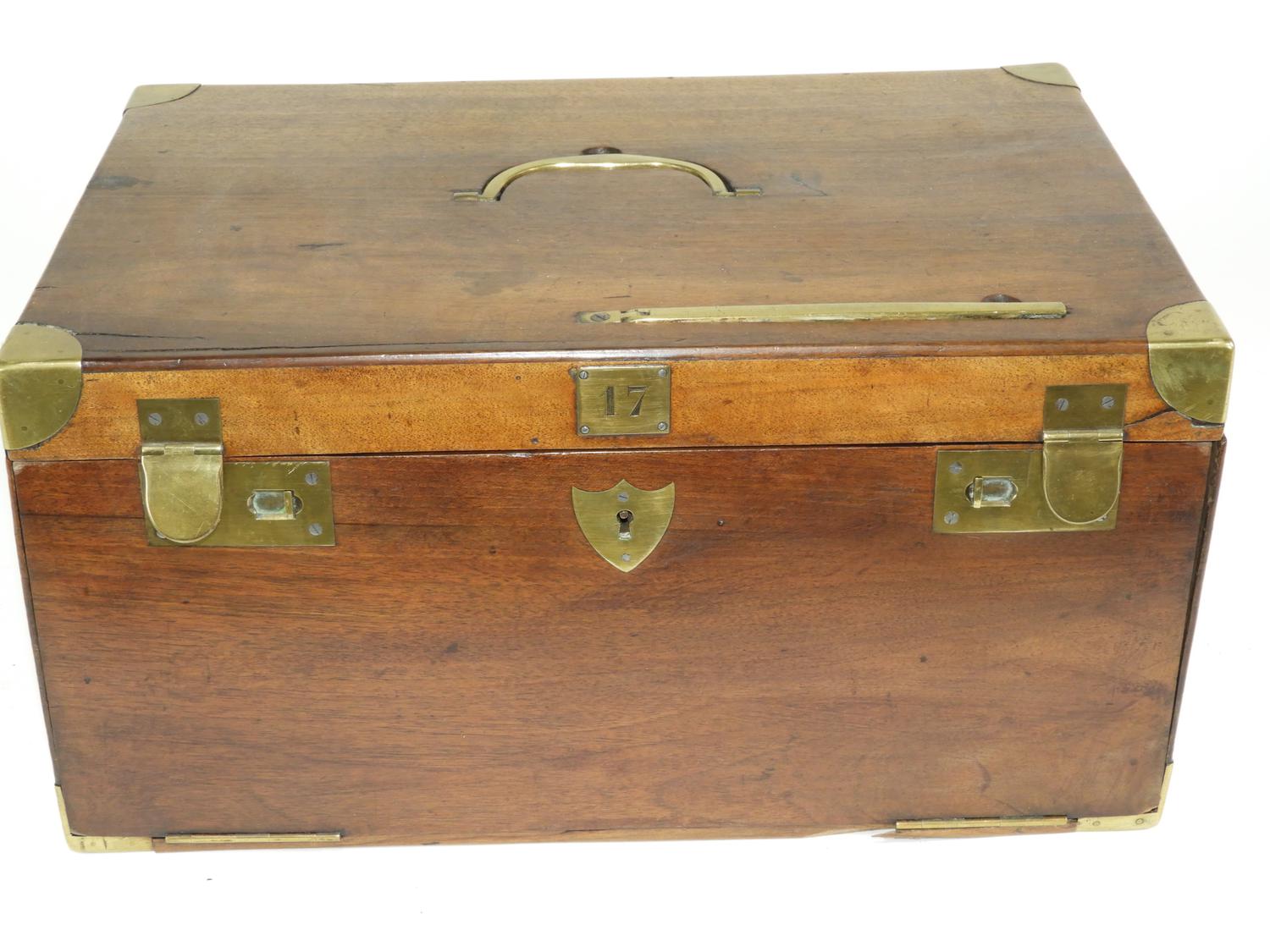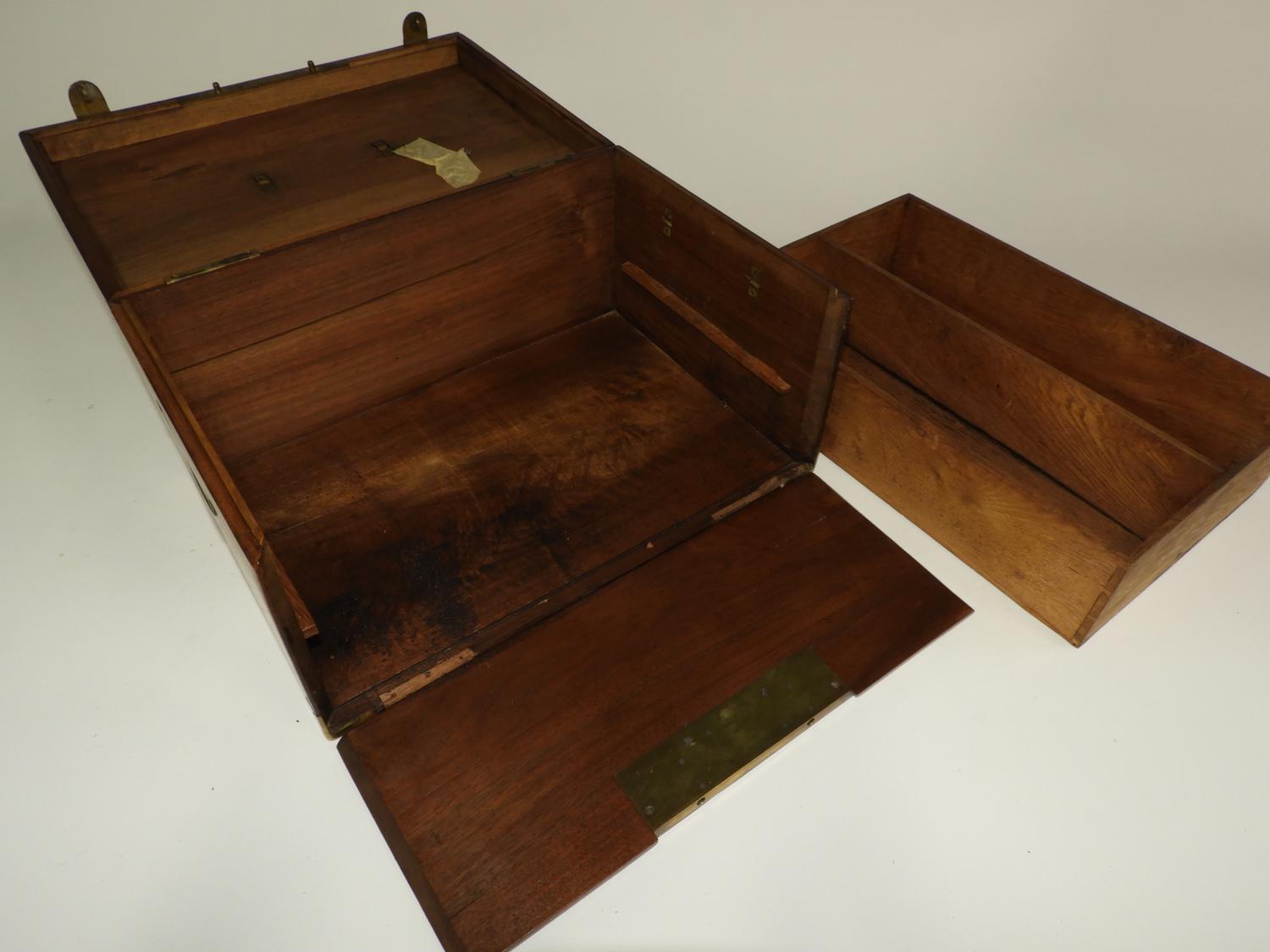 19th century mahogany and oak campaign work box, requires hinge restoration, 8 1/2" x 17" x 11 1/2"