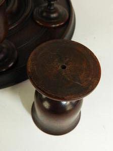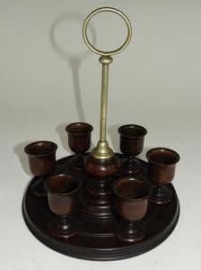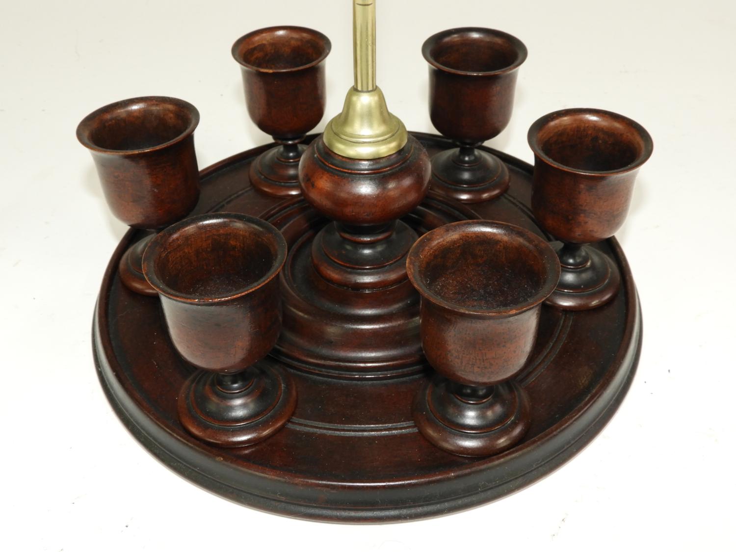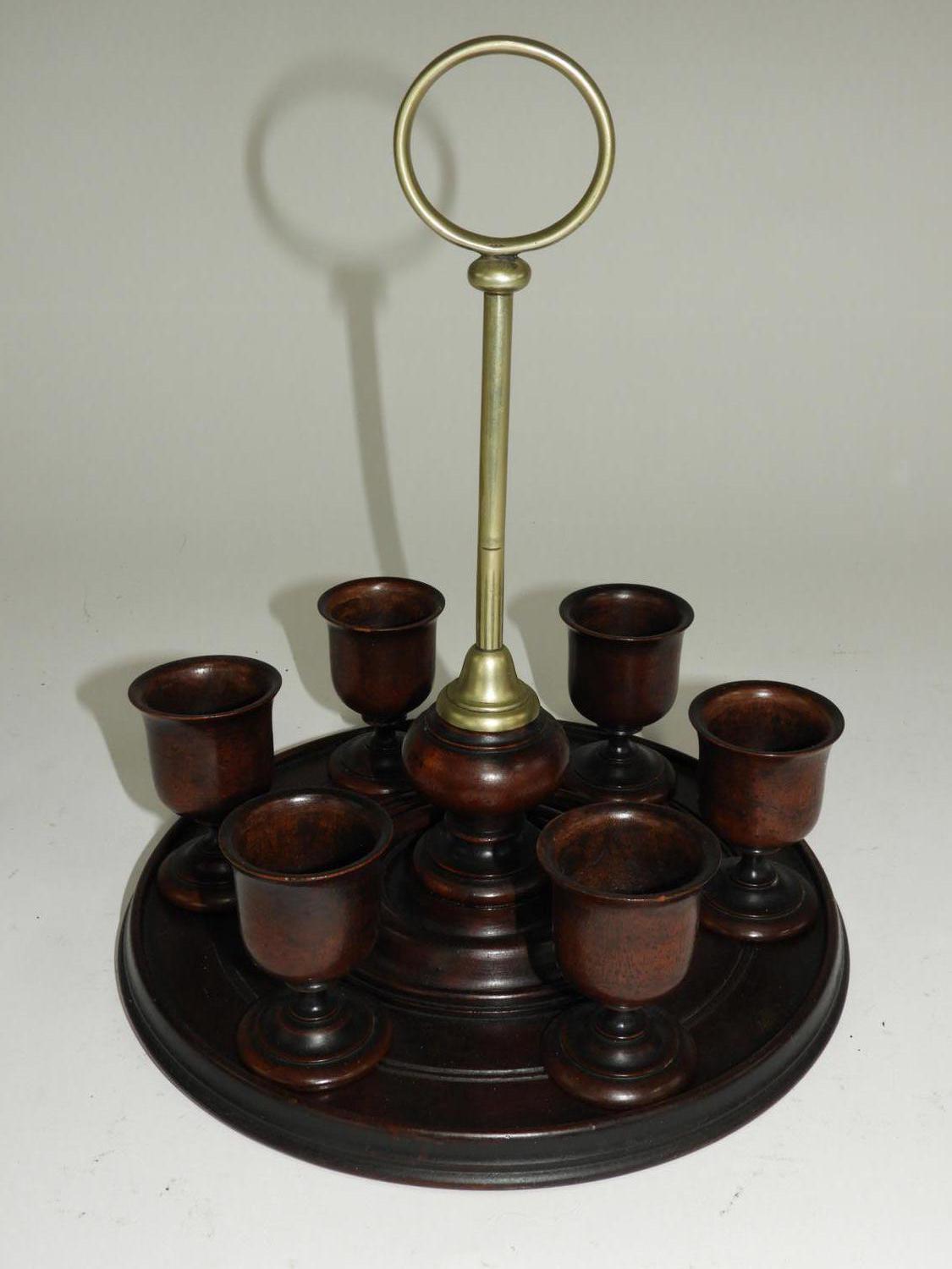 set of six turned mahogany egg cups on stand, early 19th century, 12" x 10"