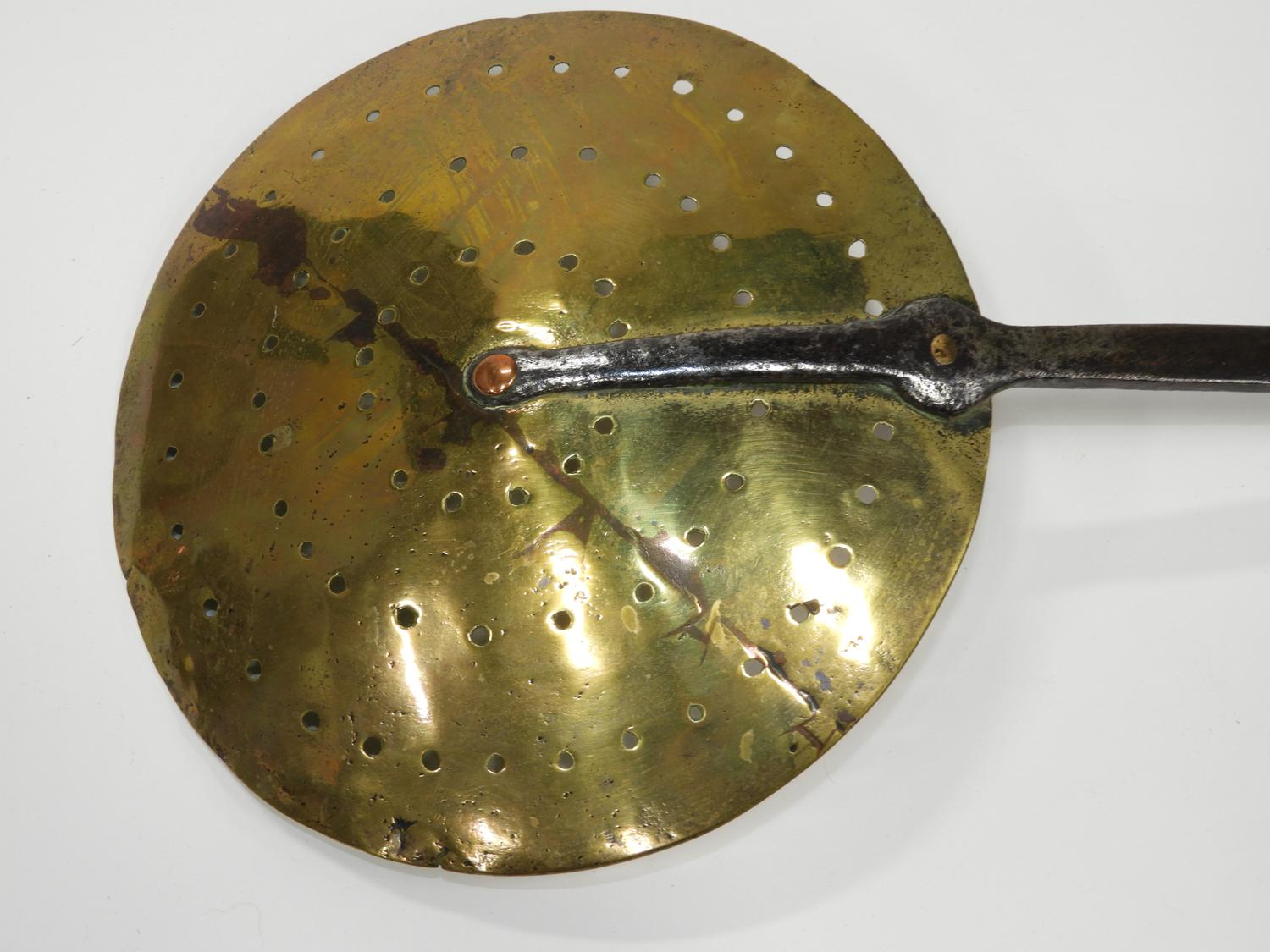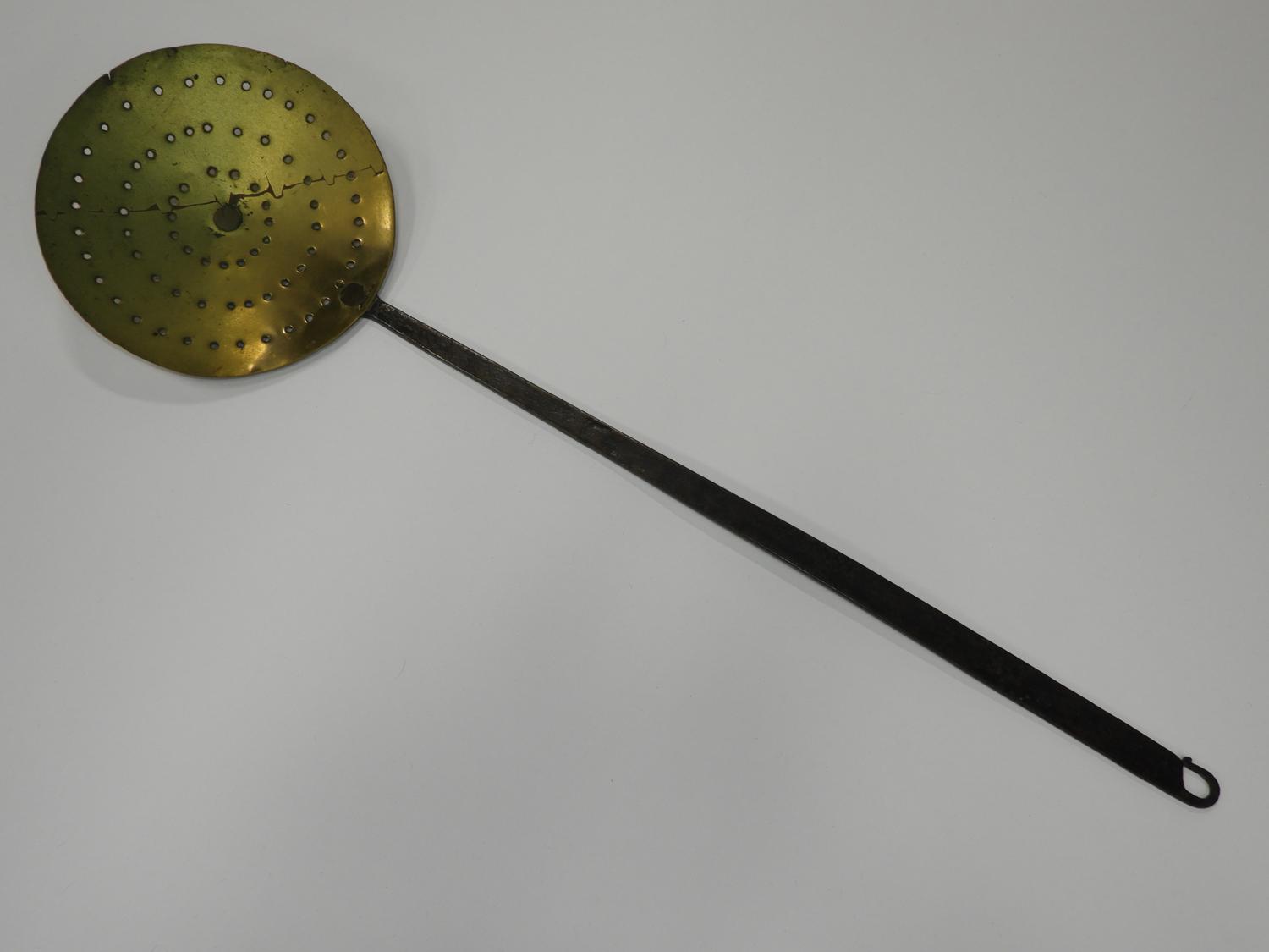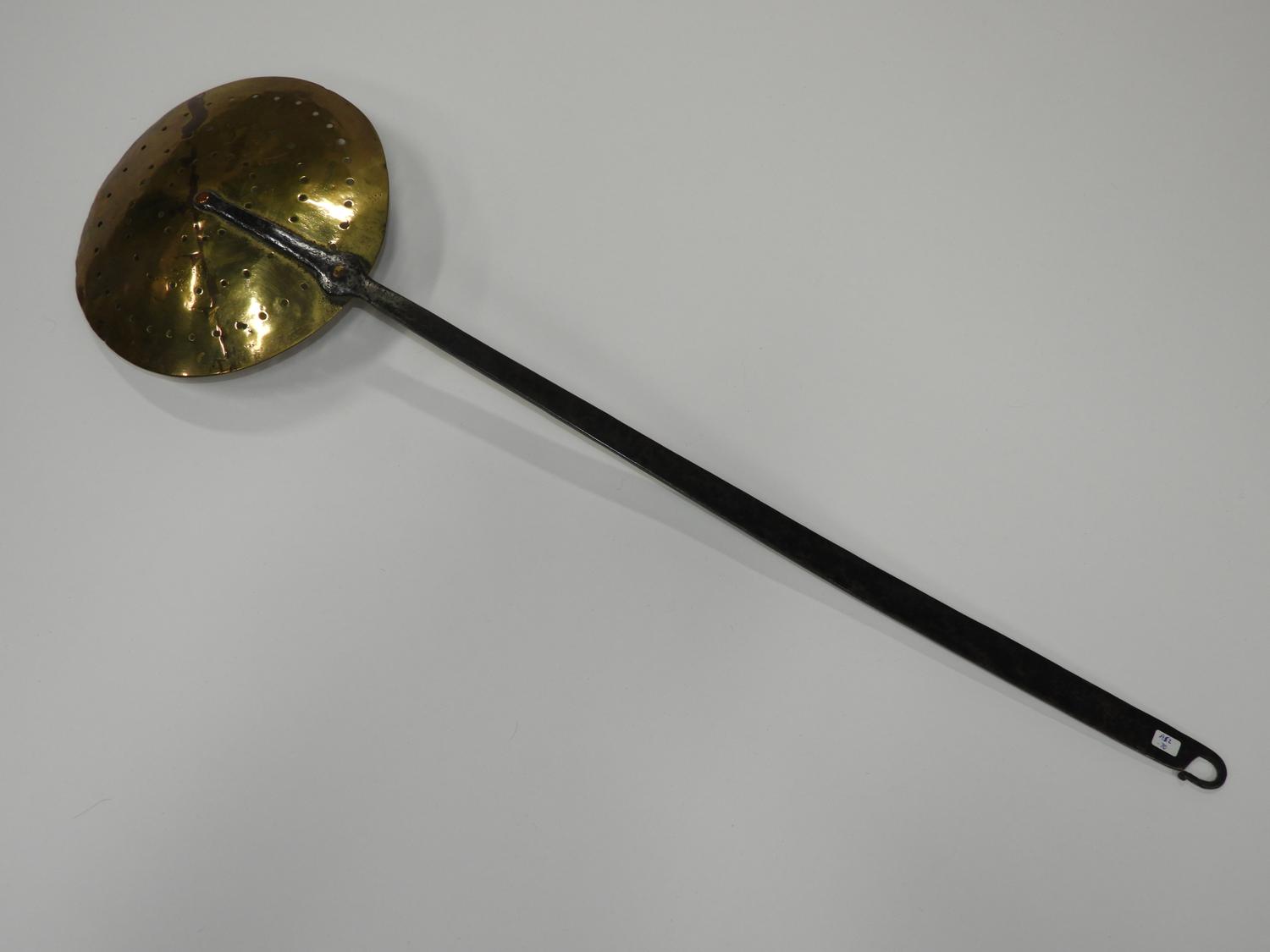early 19th century large brass and wrought iron strainer, length 32"