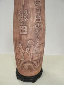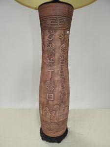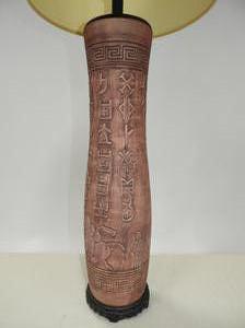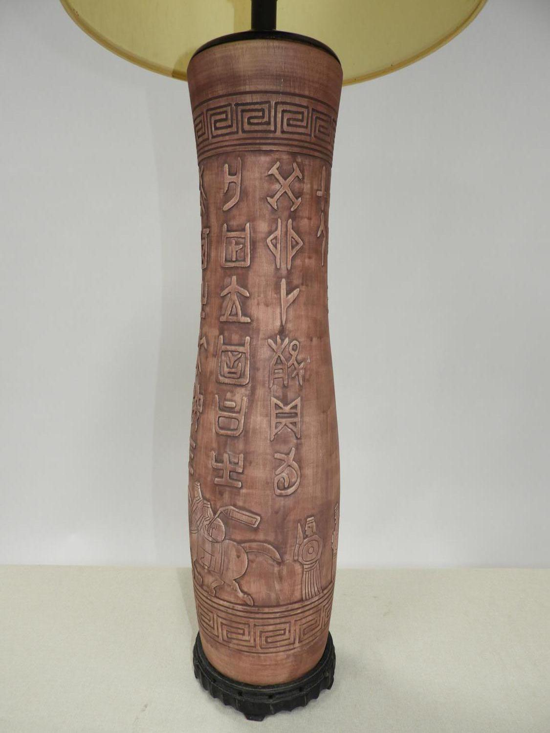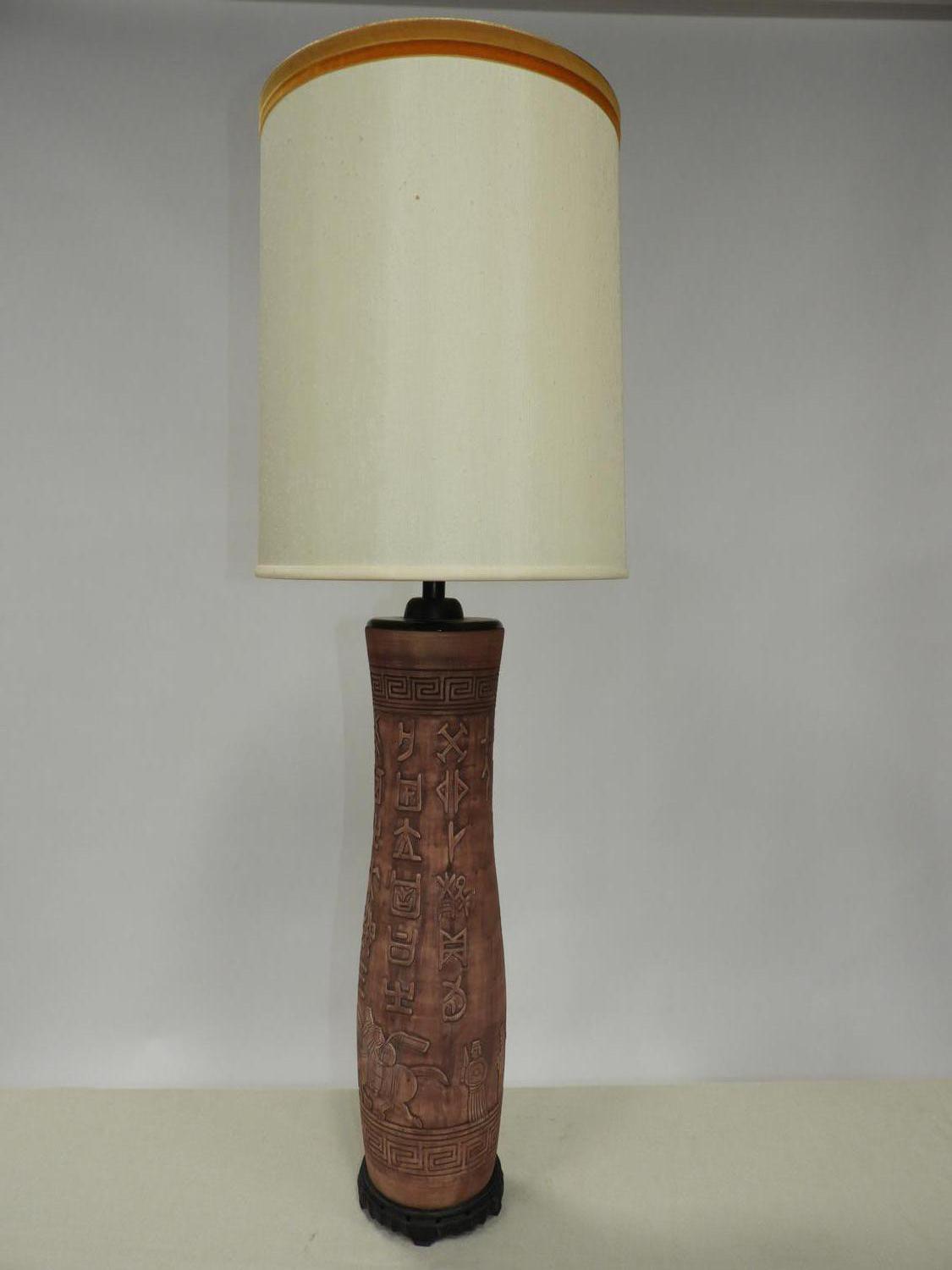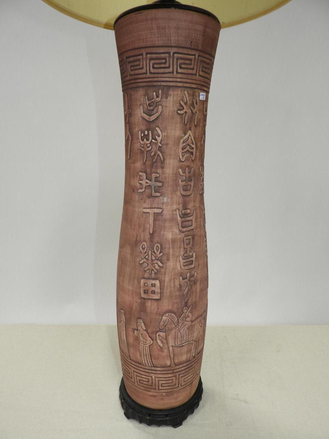 asian motif terracotta table lamp, mid 20th century, ht. 47 1/2"