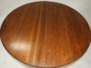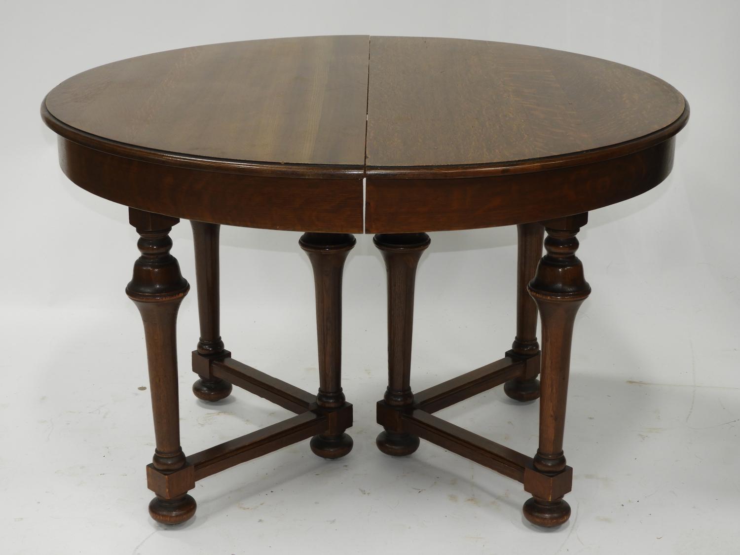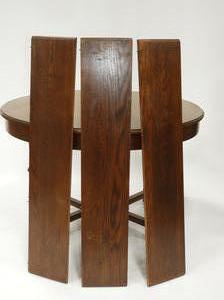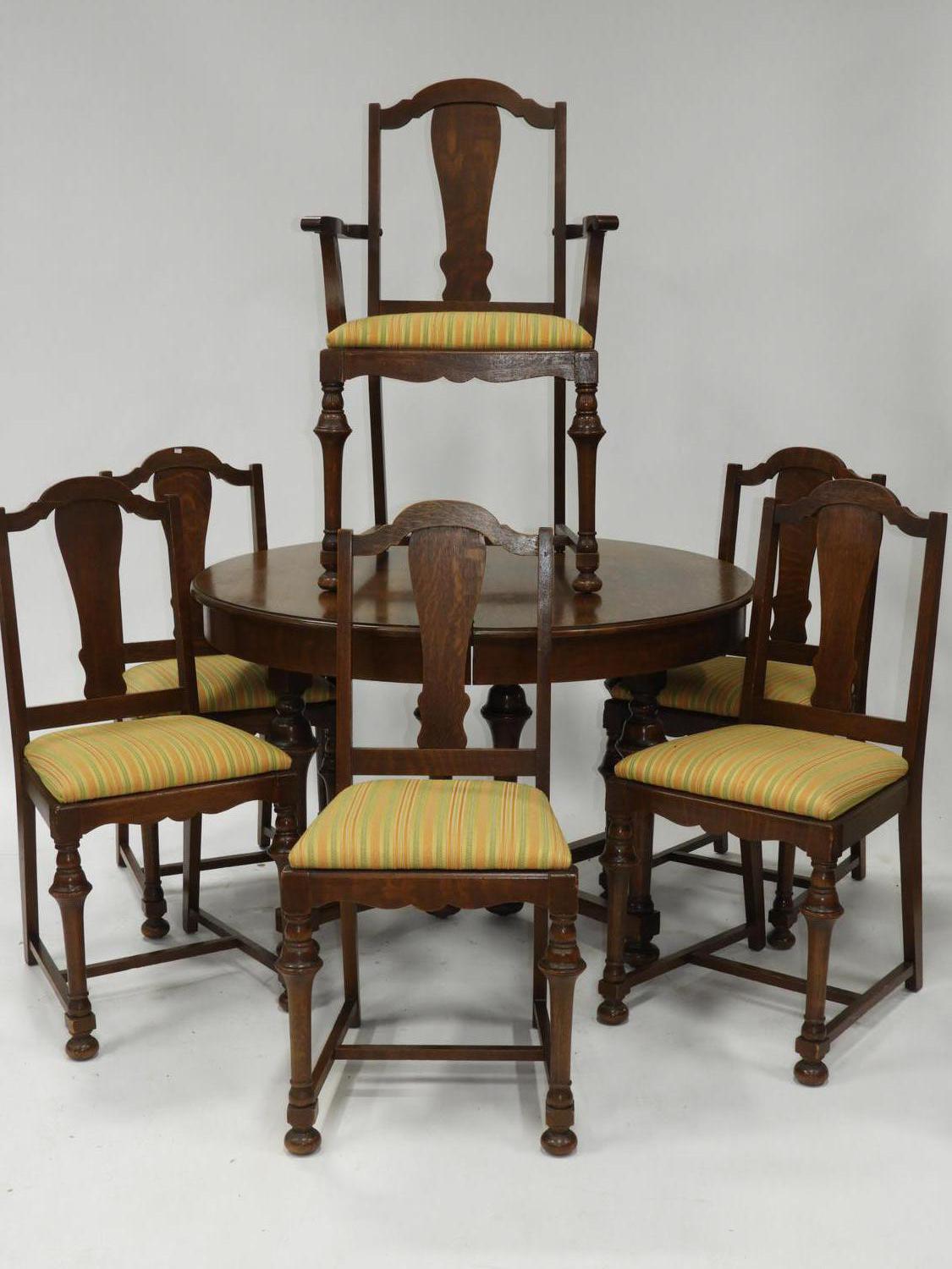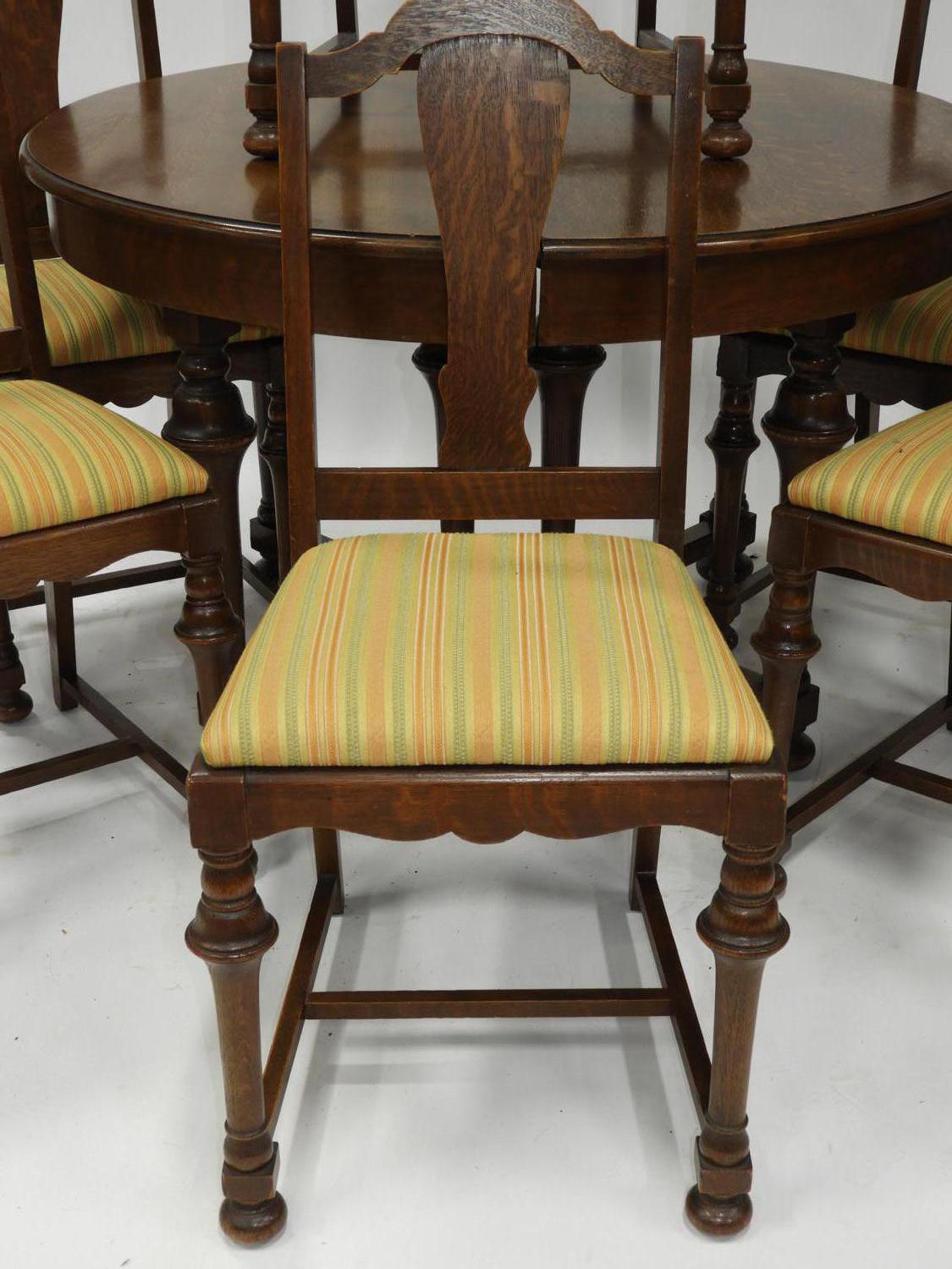 edwardian oak extending dining table with three 8 1/2" leaves and six matching chairs, early 20th century, 29 1/2" x 45"