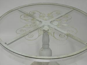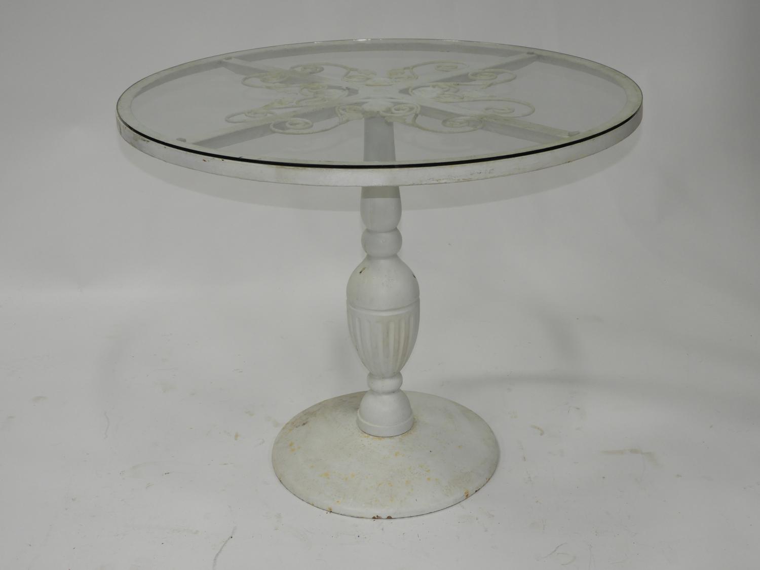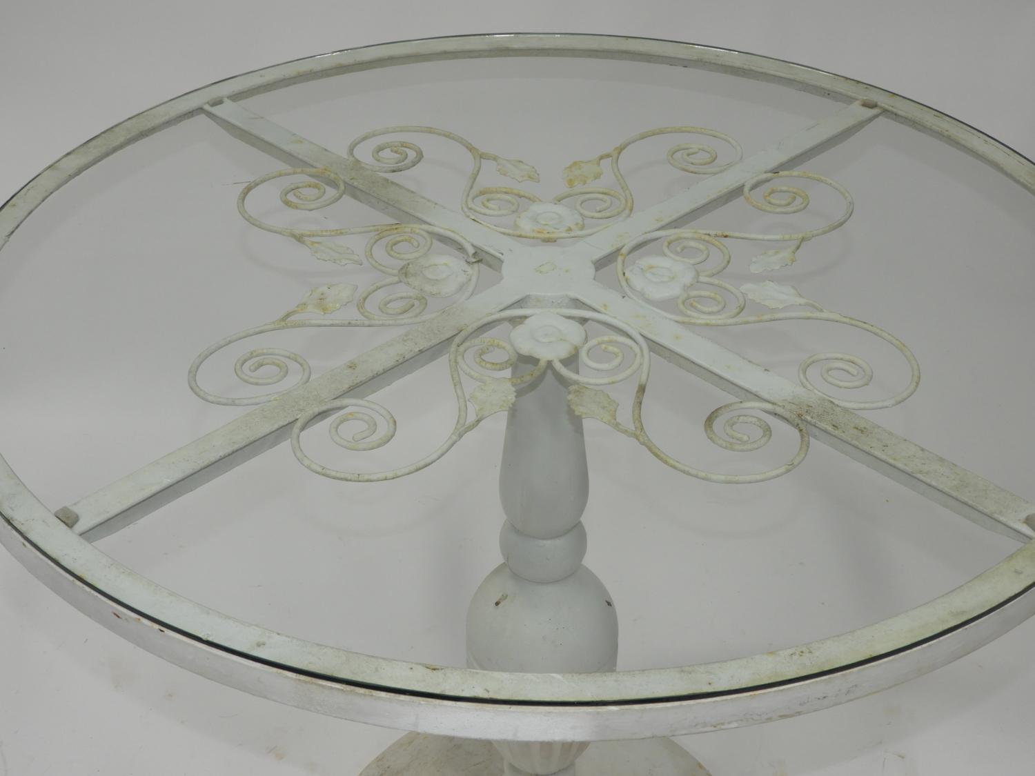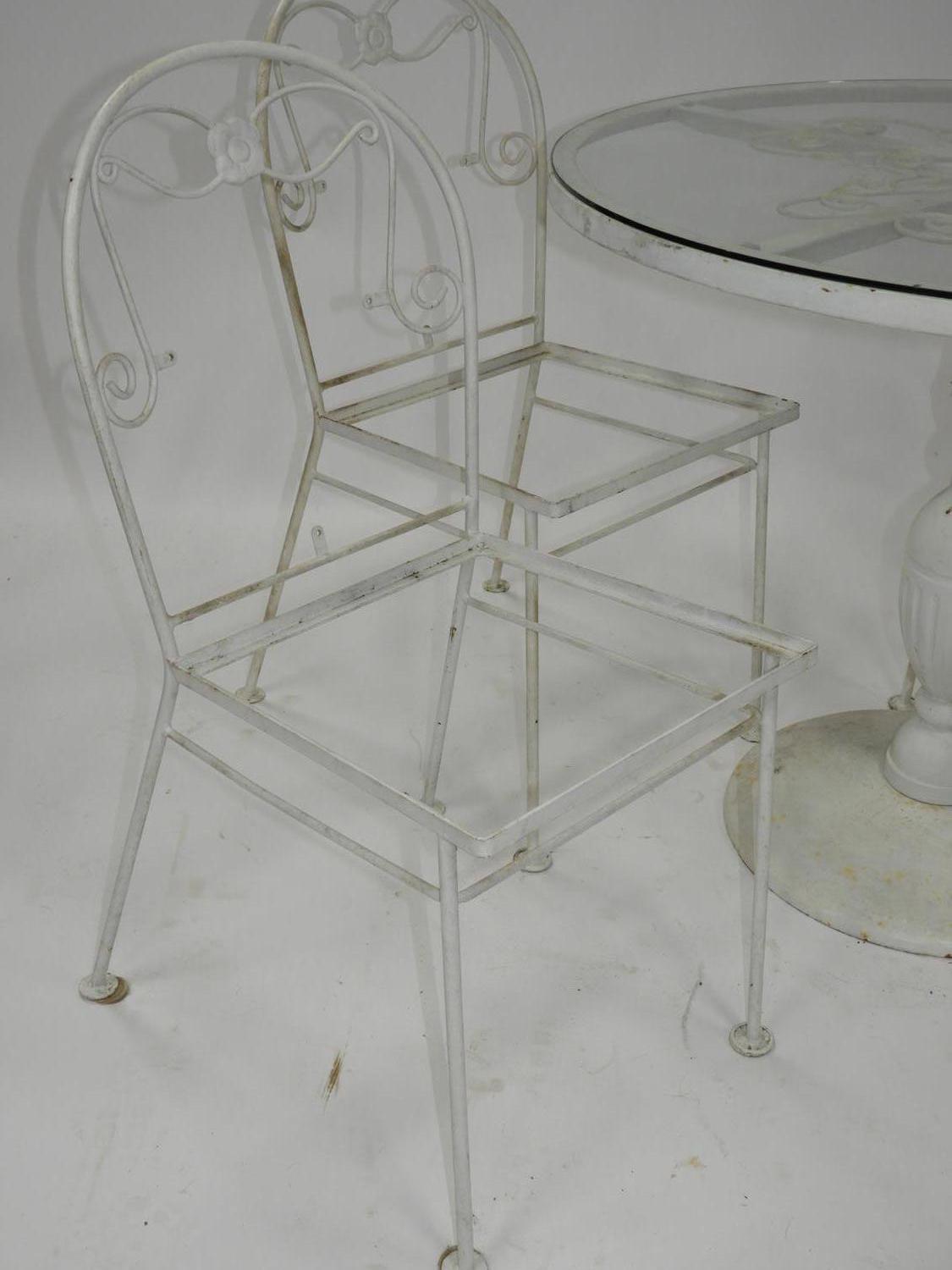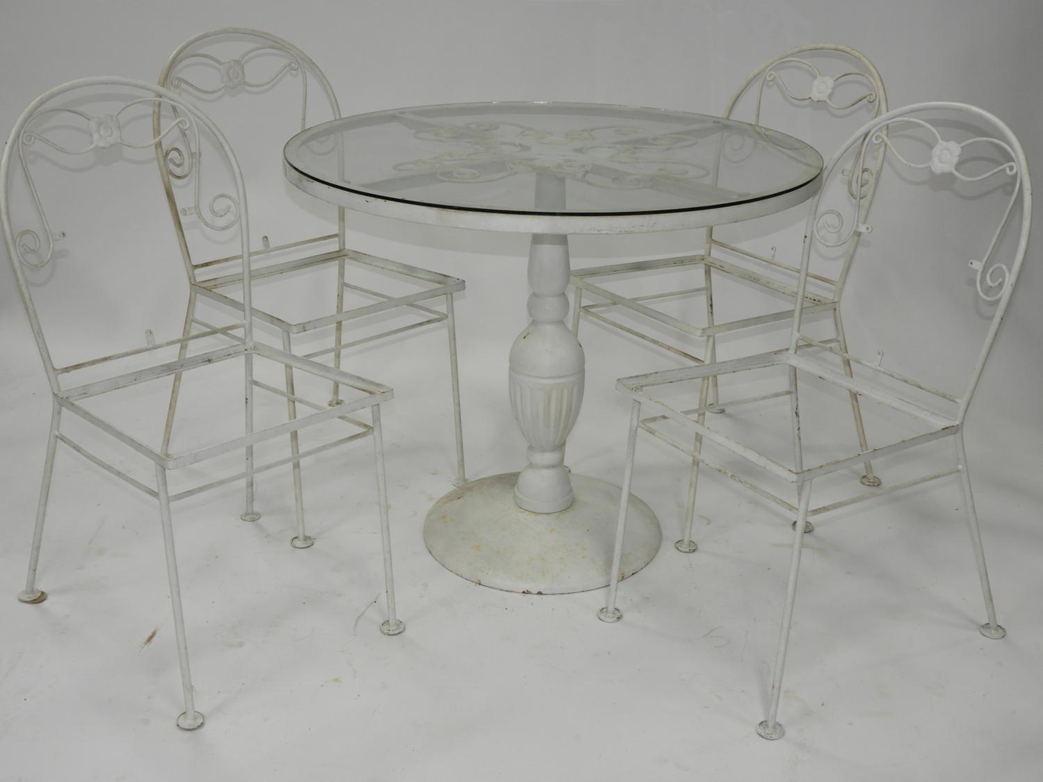 painted wrought iron garden set, pedestal table with glass top 30 1/2" x 36" and four chairs