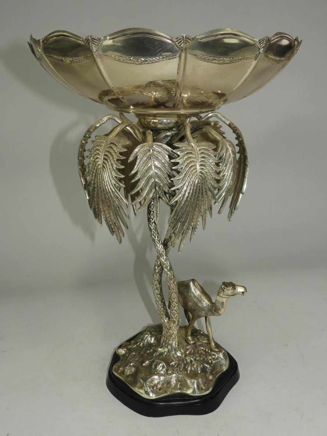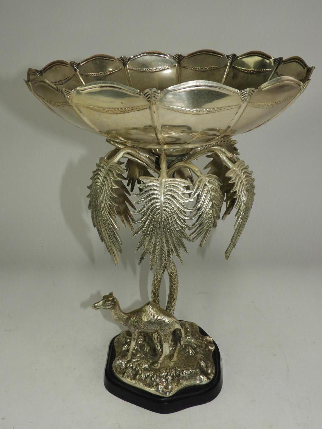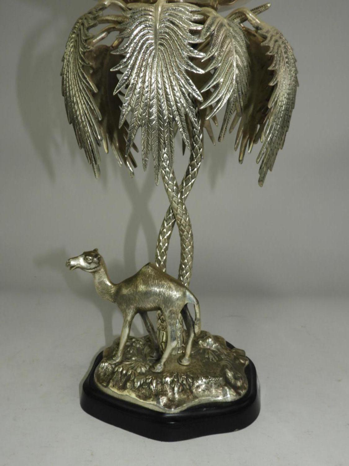 large silvered orientalist table centerpiece with camel and palm tree, h. 19 1/2"