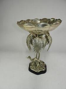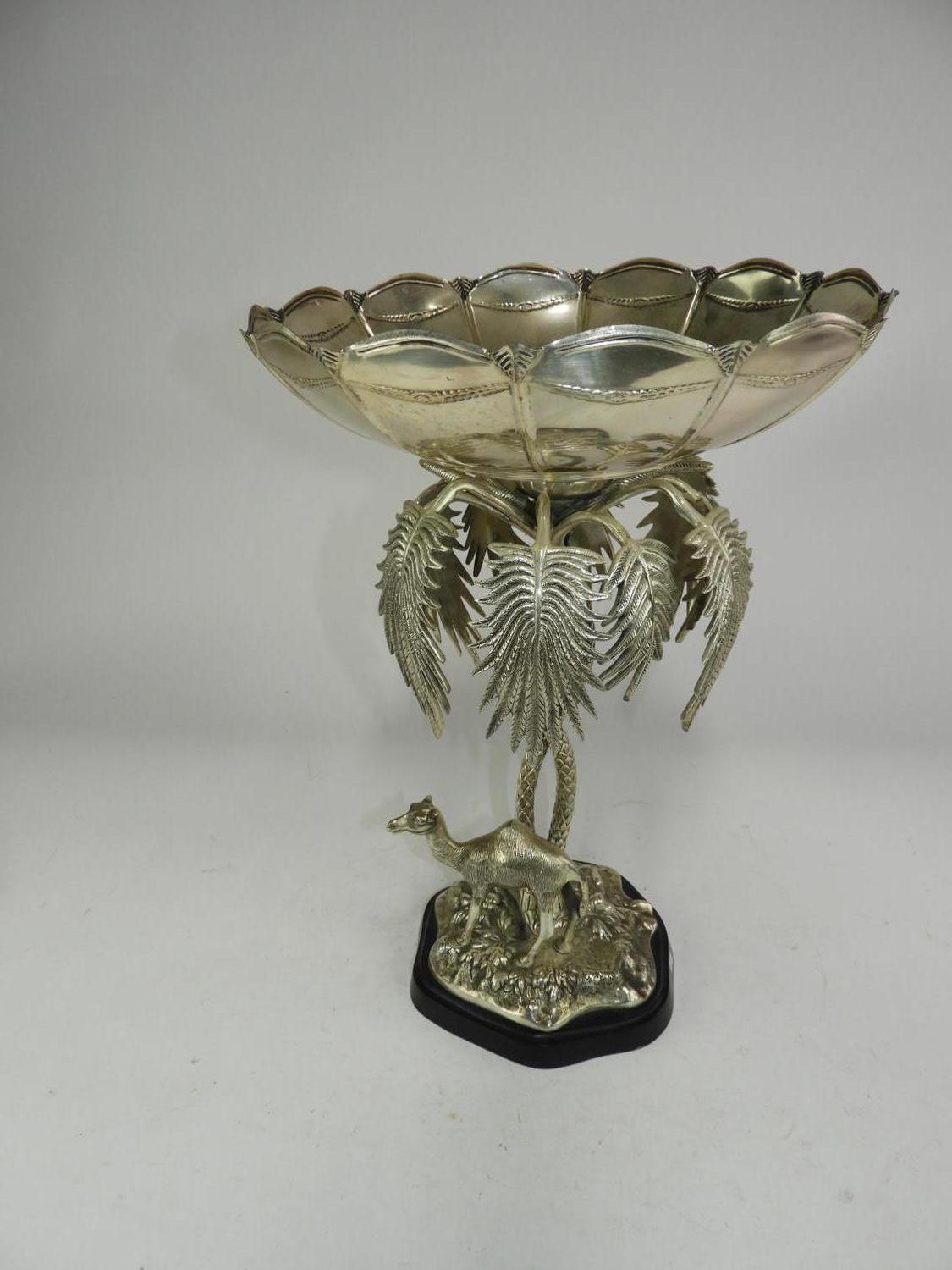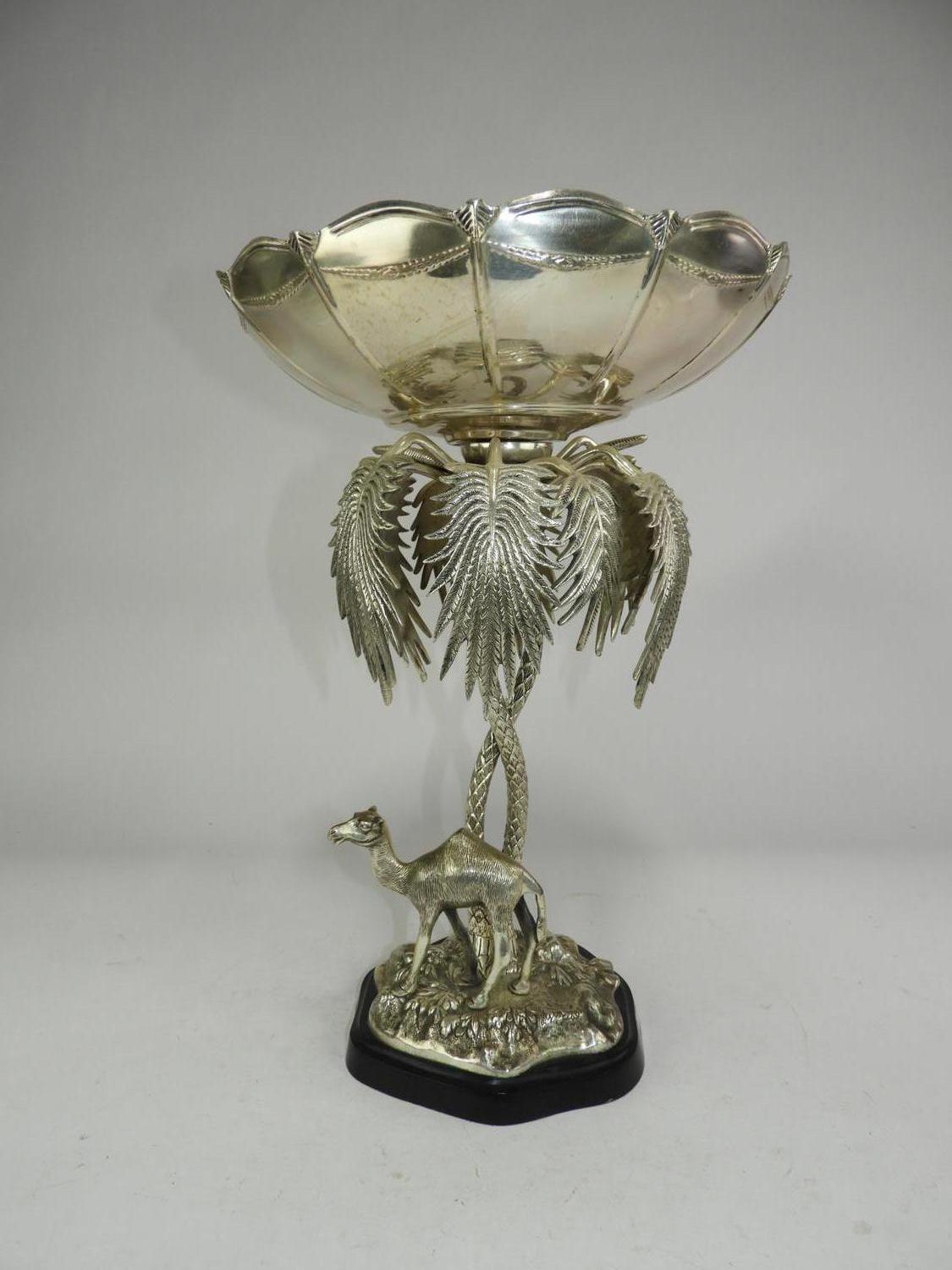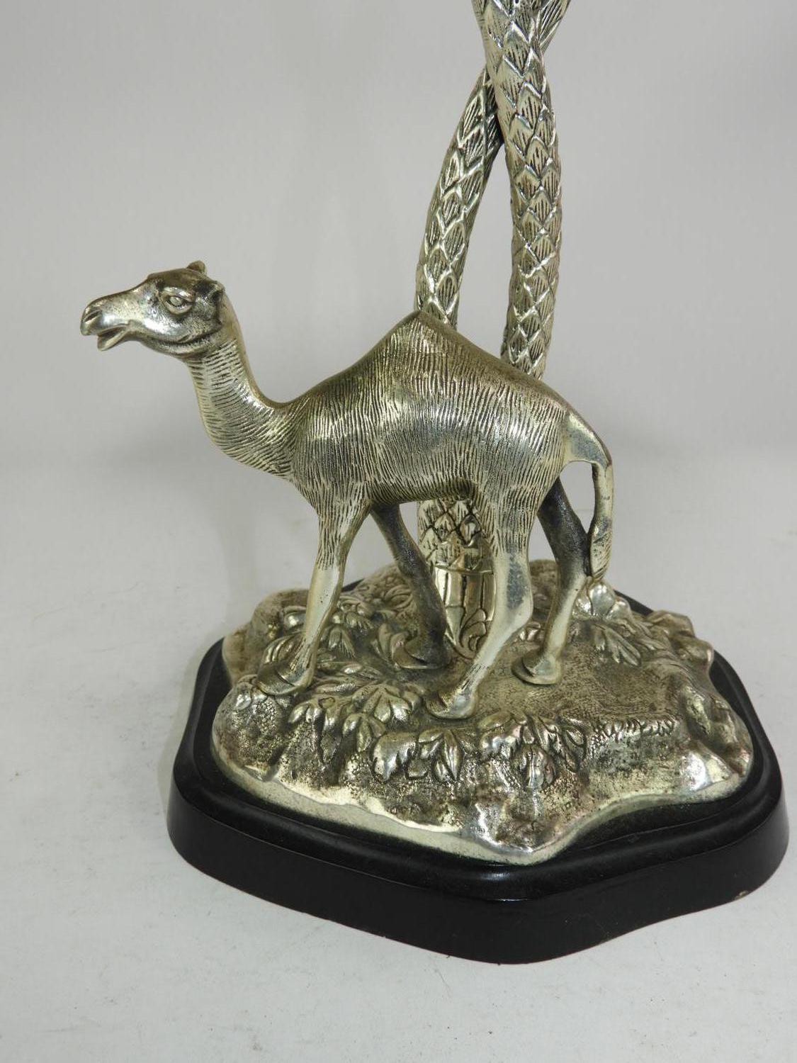 large silvered orientalist table centerpiece with camel and palm tree, h. 19 1/2"
