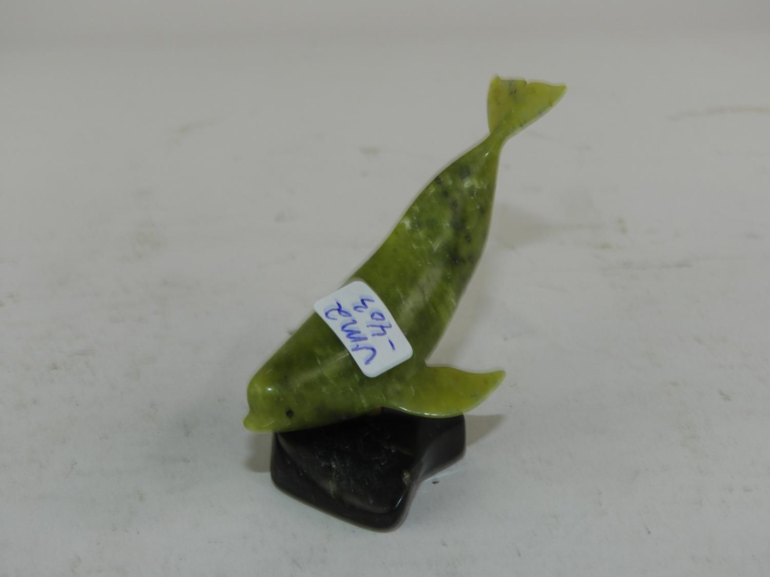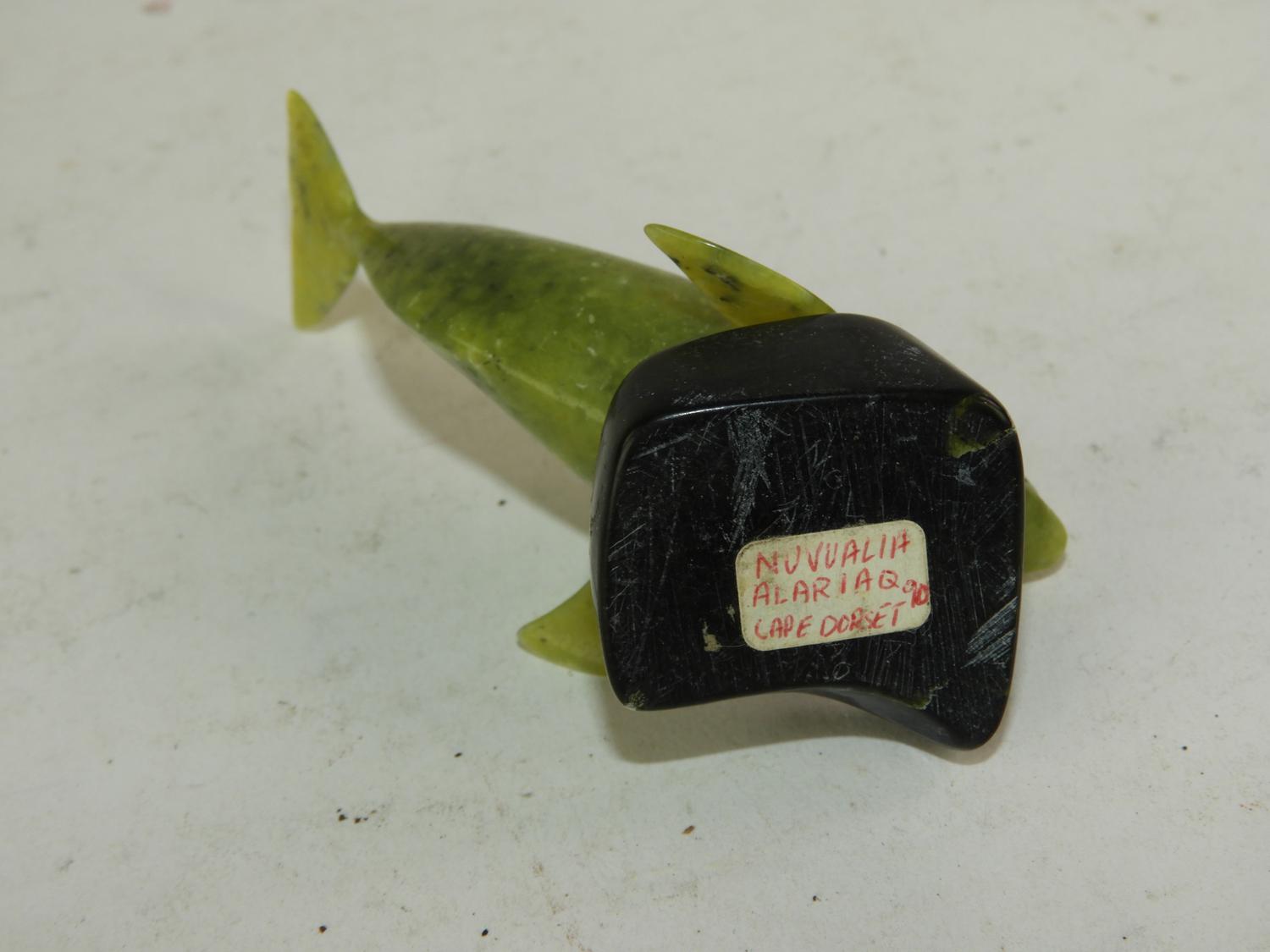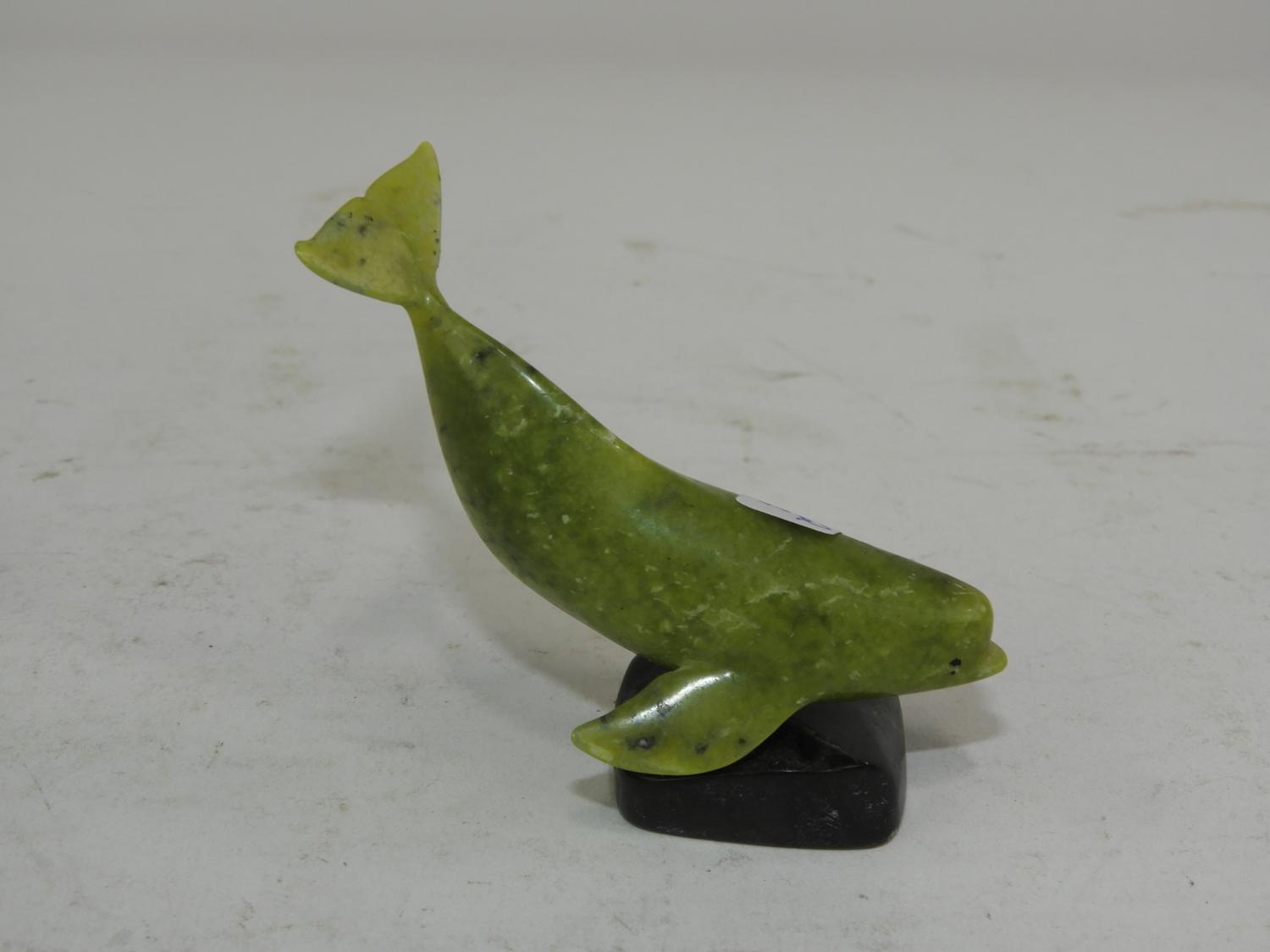 inuit carved jade baluga whale on stand, cape dorset, 2 1/2" x 2 1/2"
