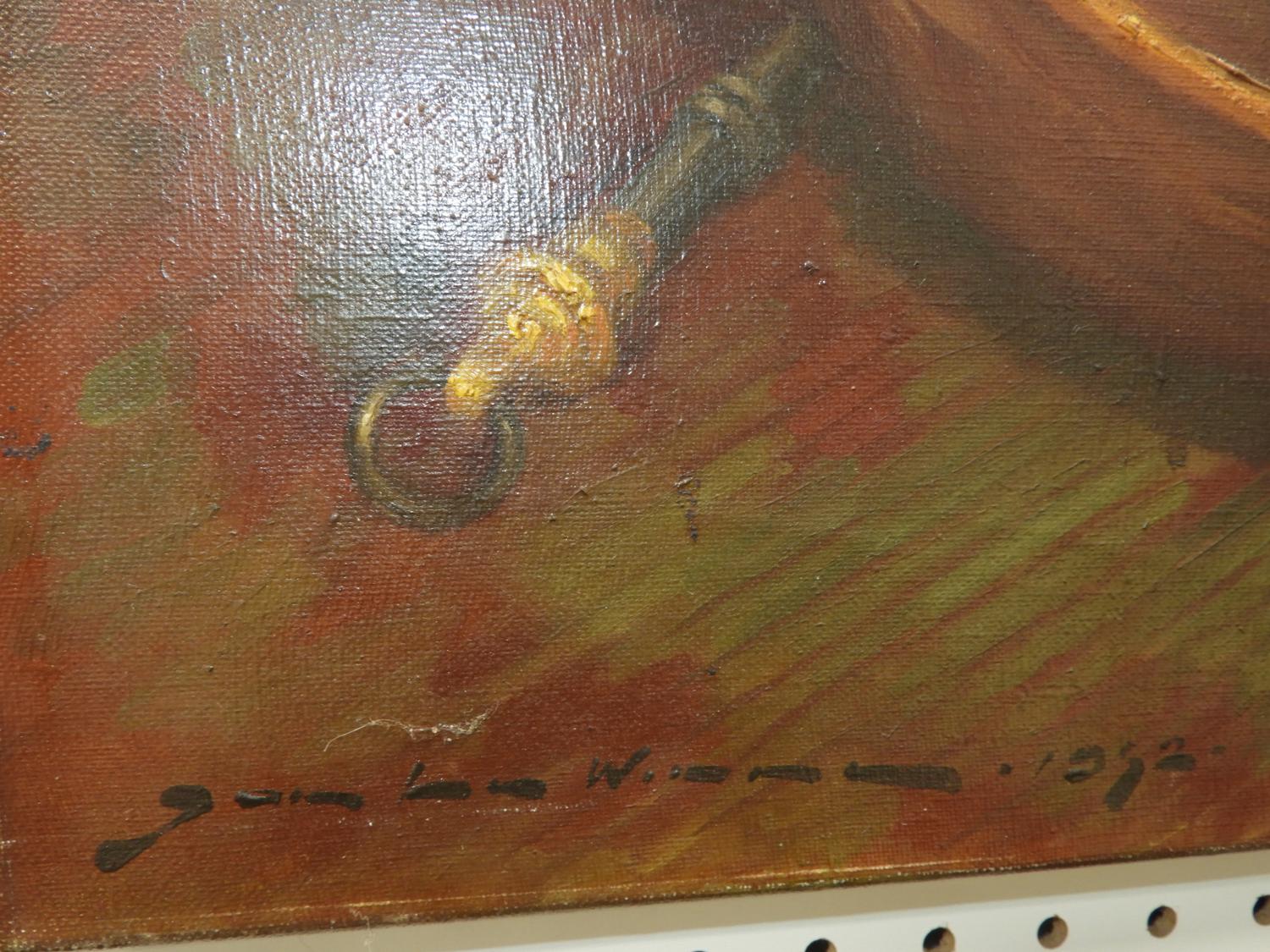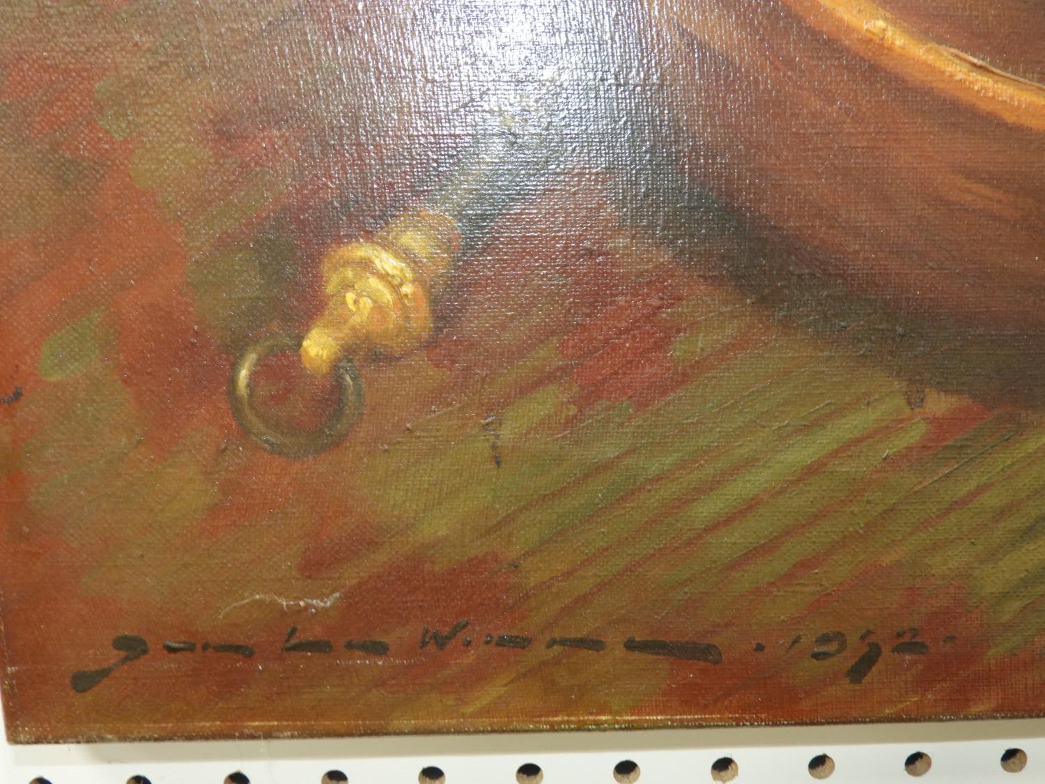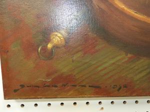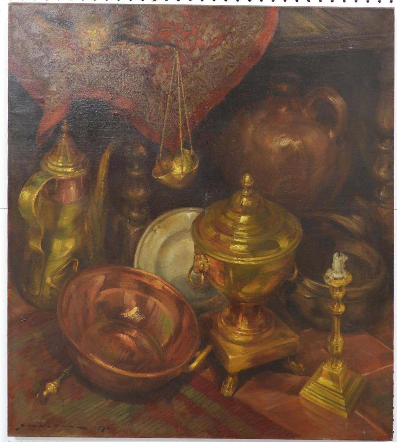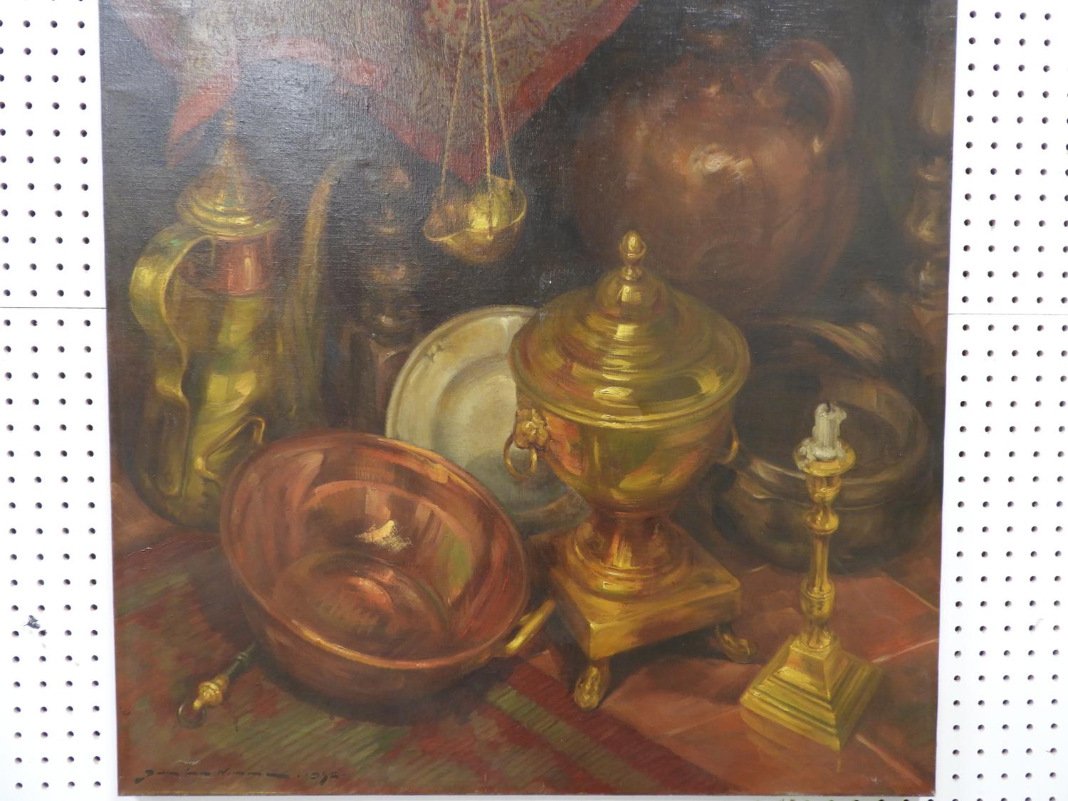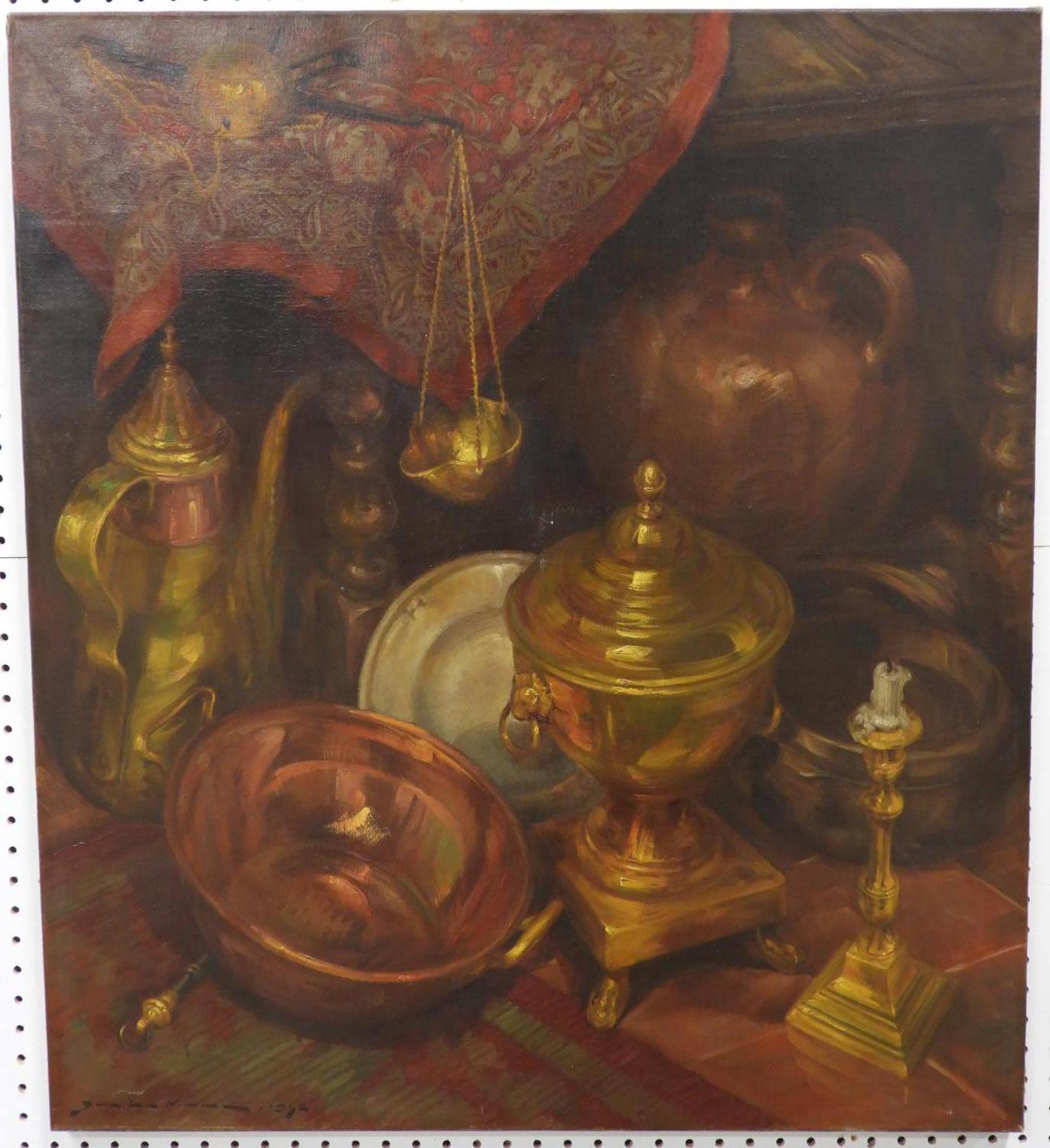 continental school indistinctly signed oil on canvas, 35 1/2" x 32", "stillife with brass and copper pots"