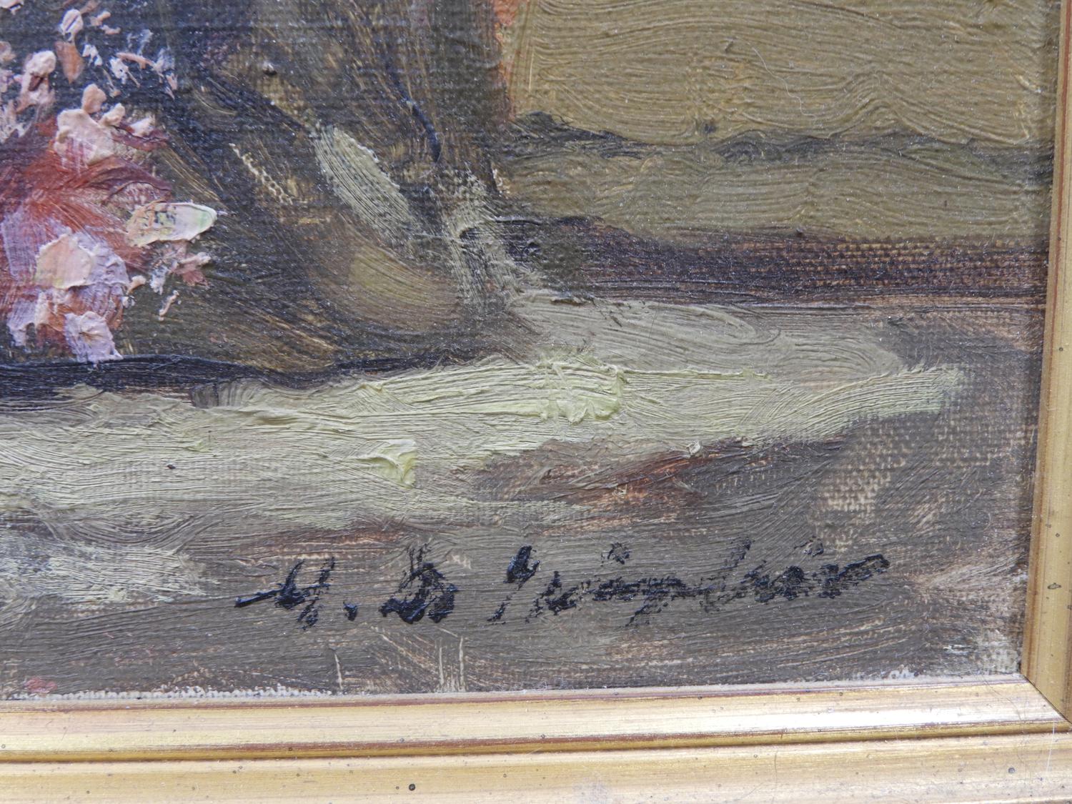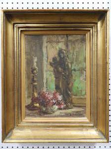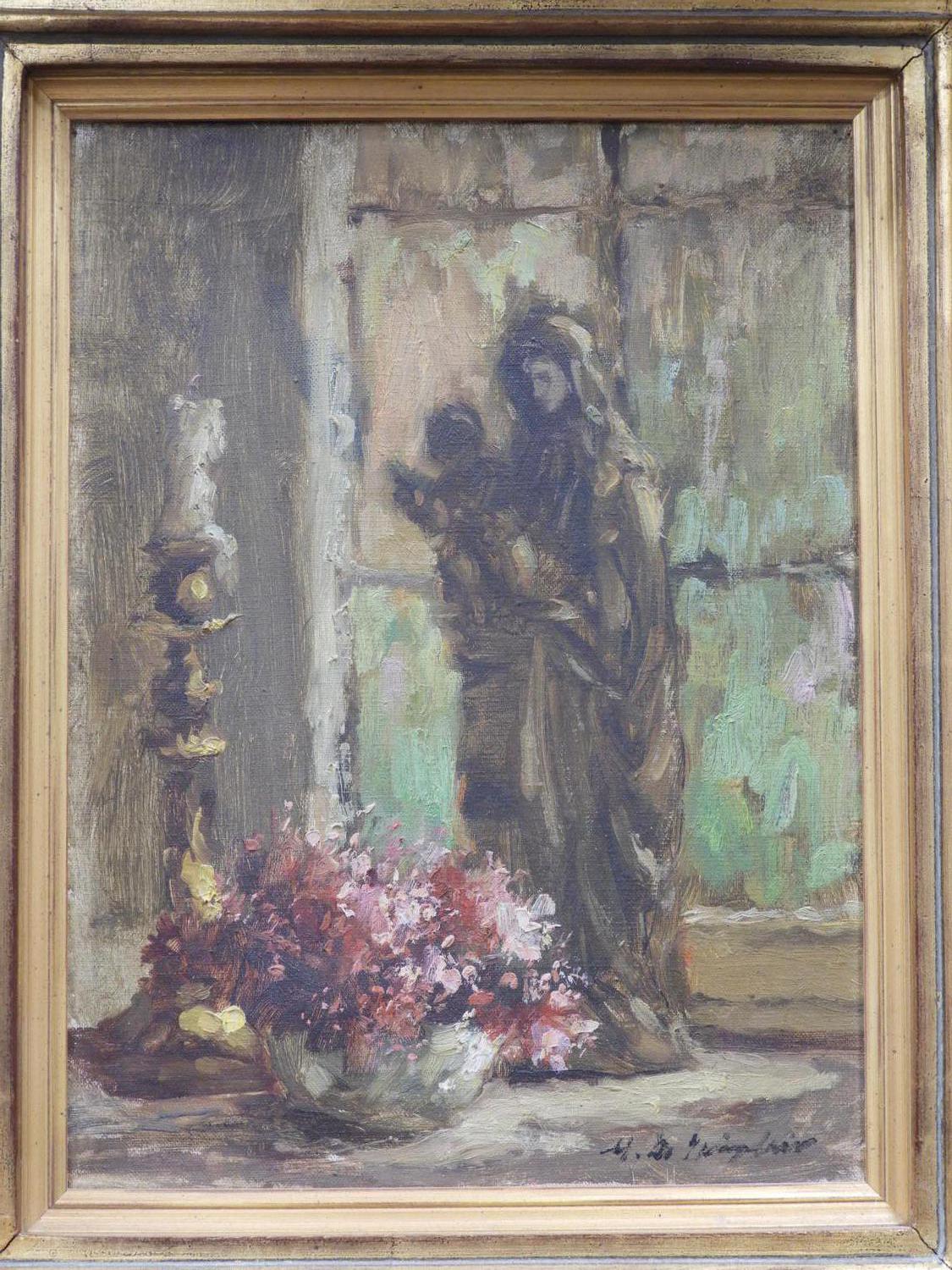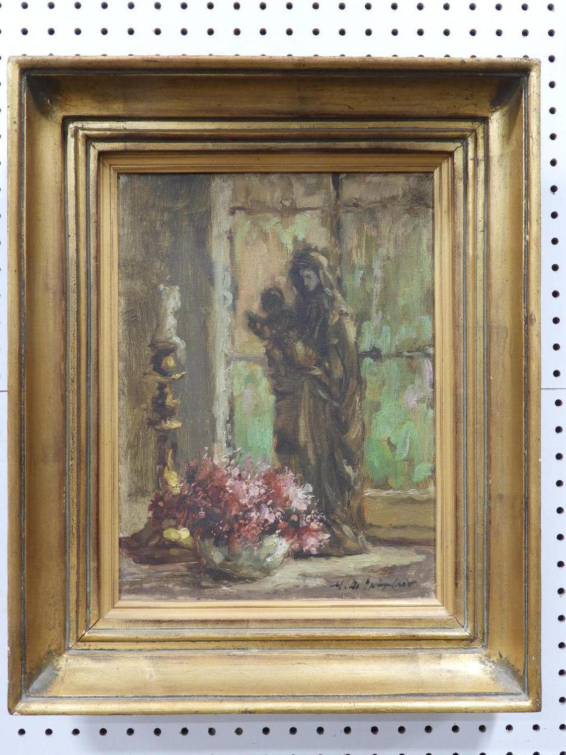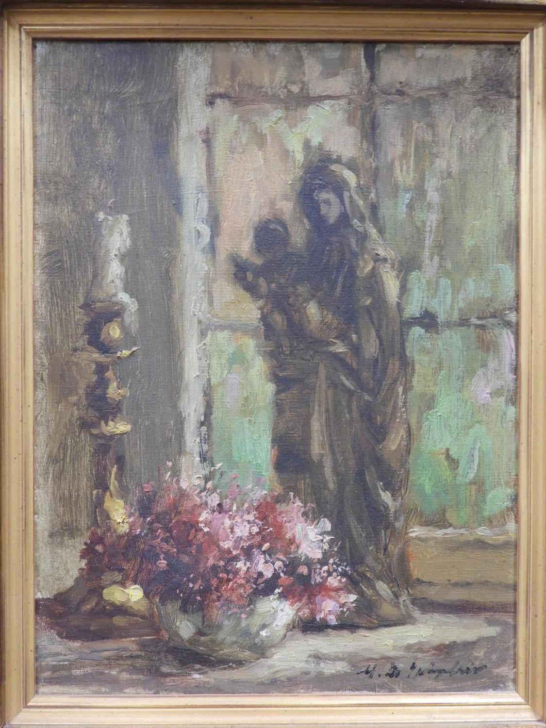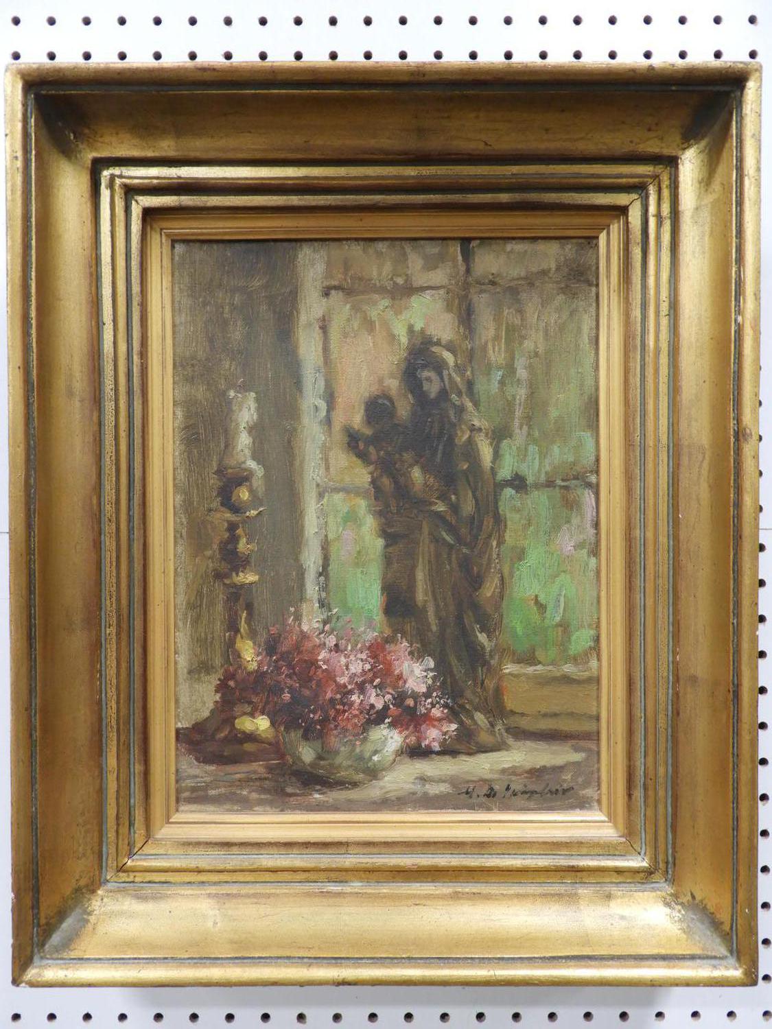 continental school indistinclty signed oil on canvas, 11 1/2" x 15 1/2", "stillife with madonna sculpture and candlestick"