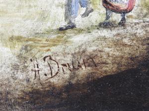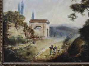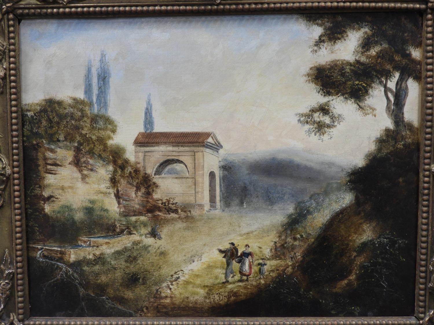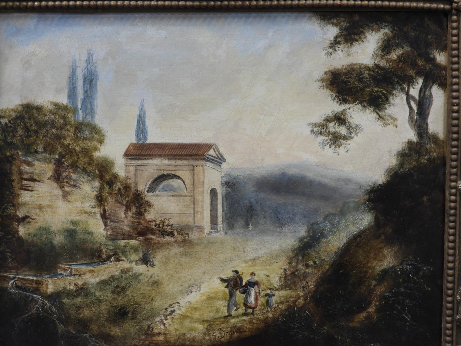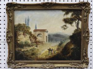 early 20th century continental school, indistinctly signed, oil on board, 13" x 17", "landscape with figures"
