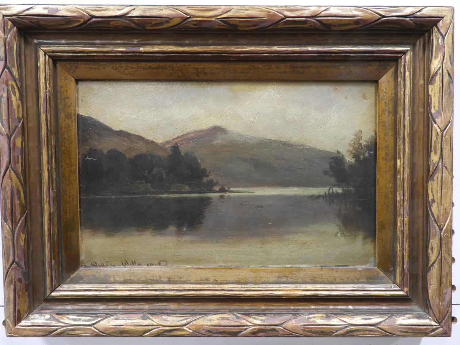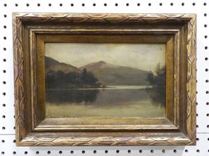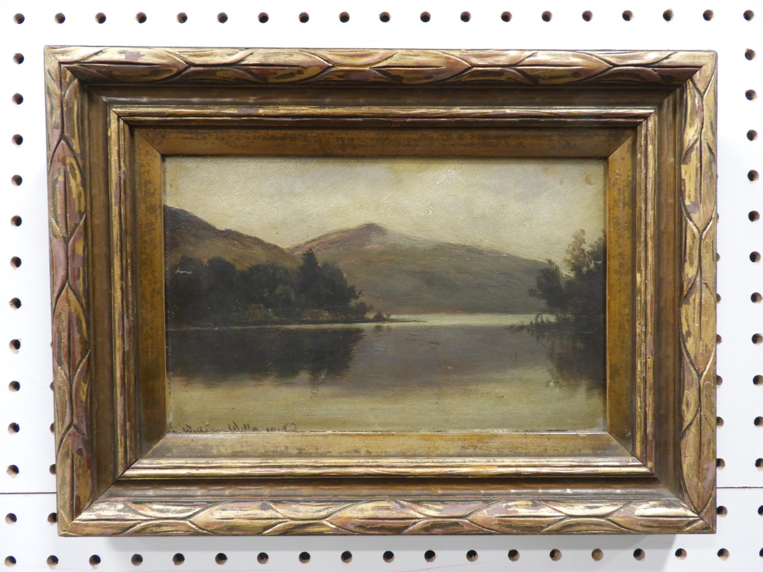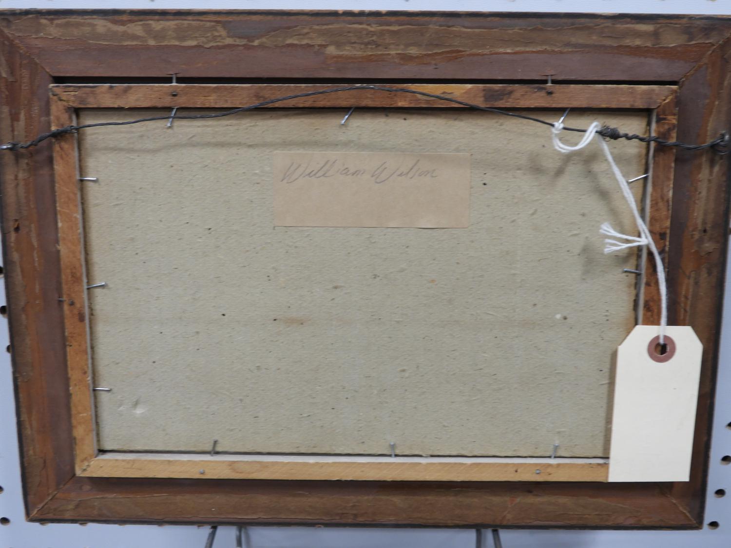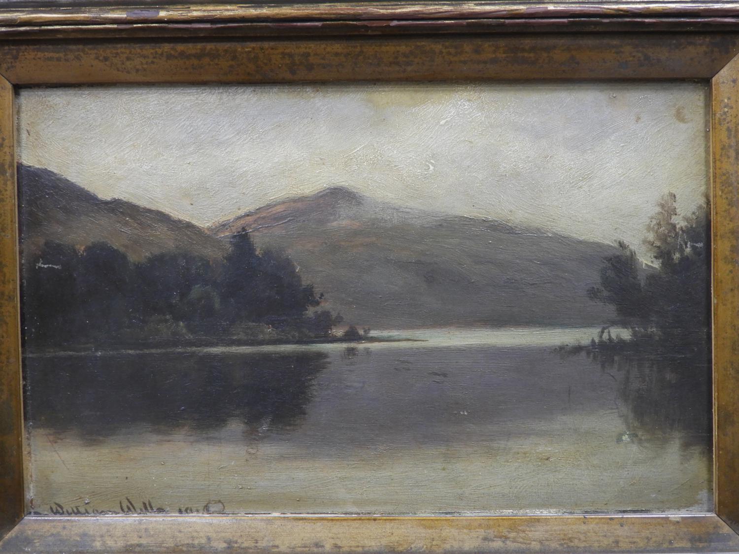 william wilson (1905-1972), oil on board, 6 1/4" x 10 1/4", "mountain lake scene"