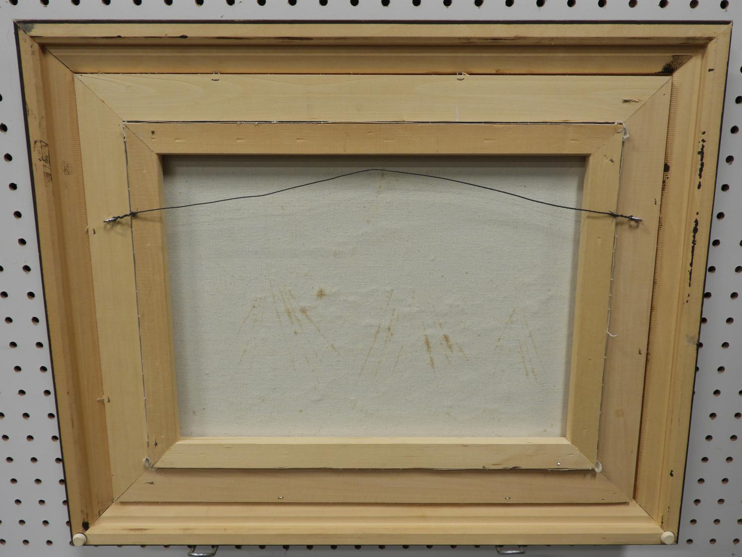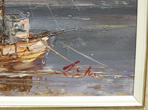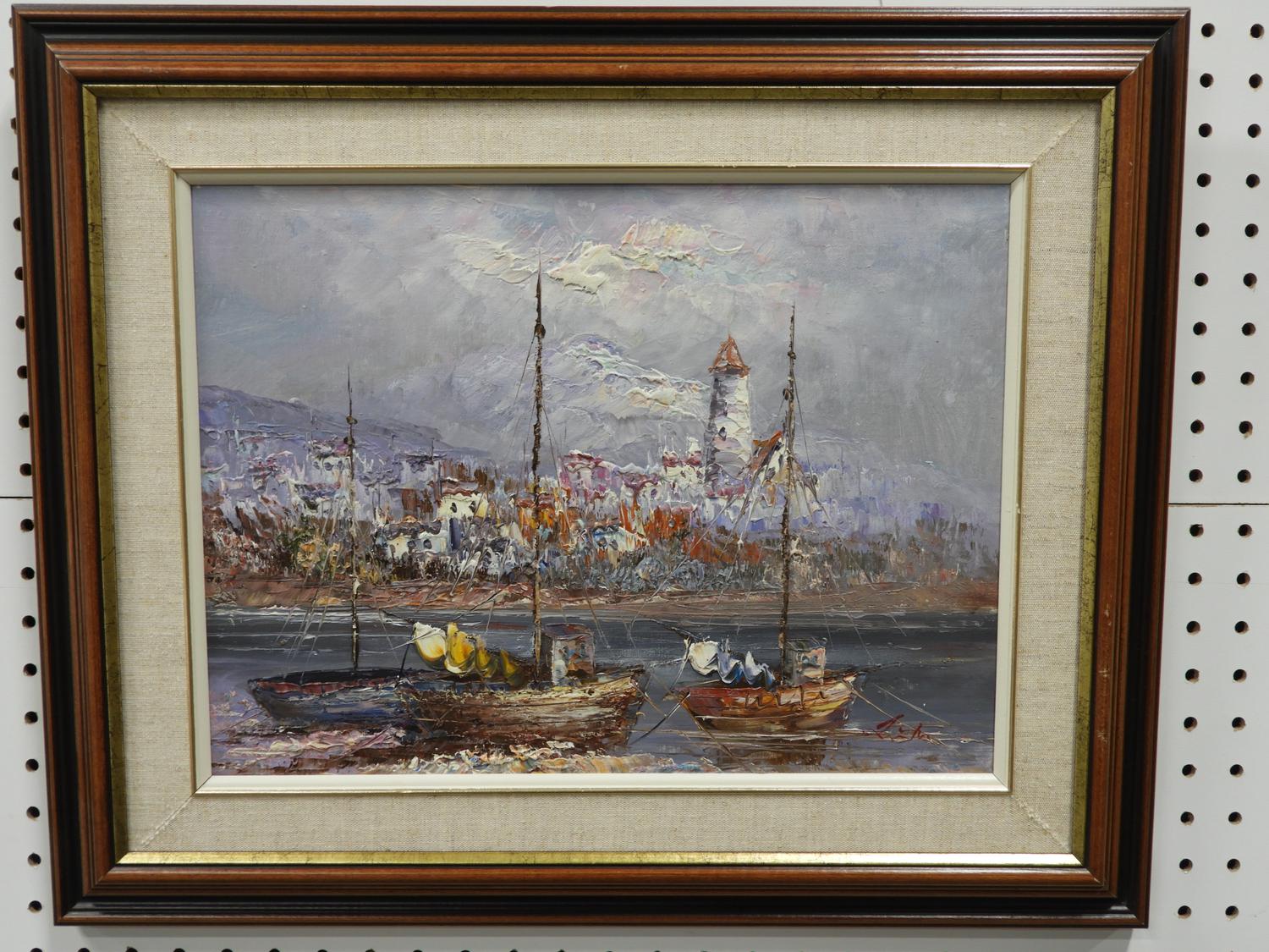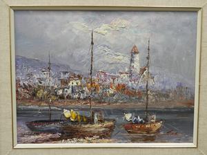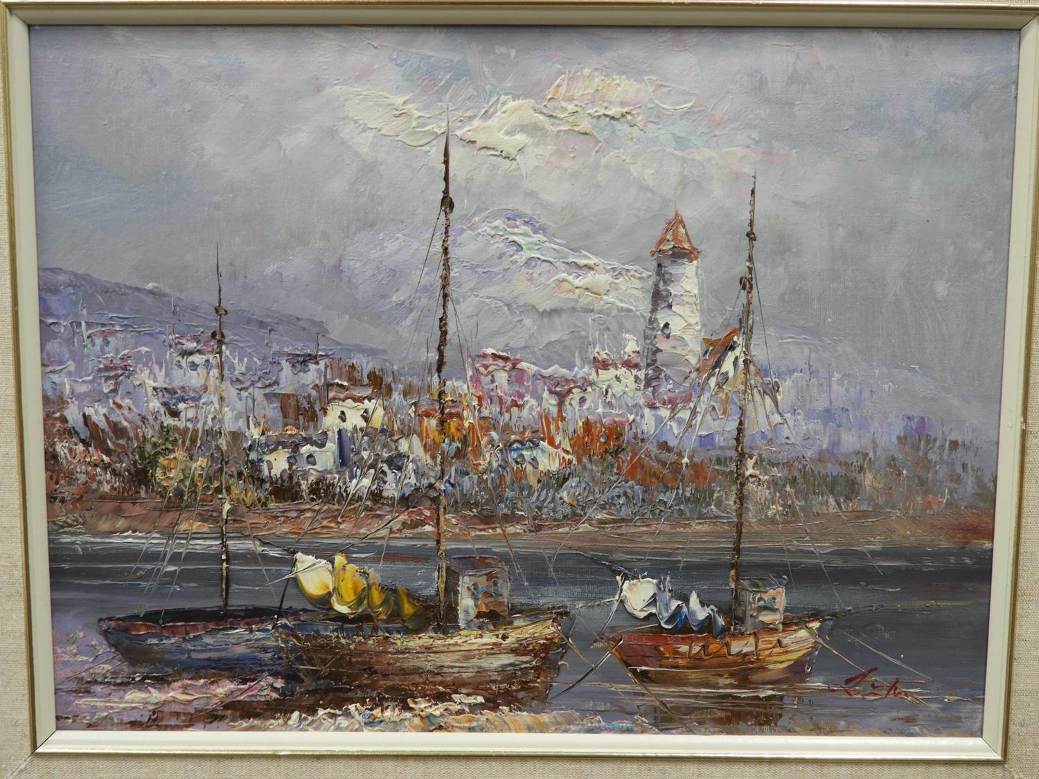 indistinctly signed oil on canvas, 12" x 16", "untitled shoreline with boats and lighthouse"