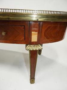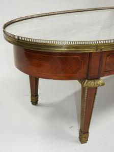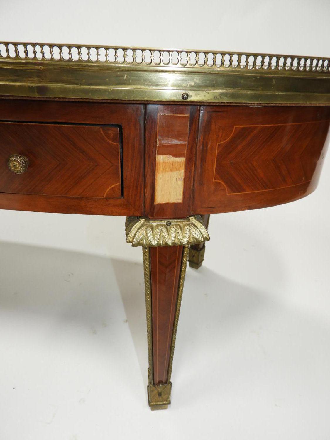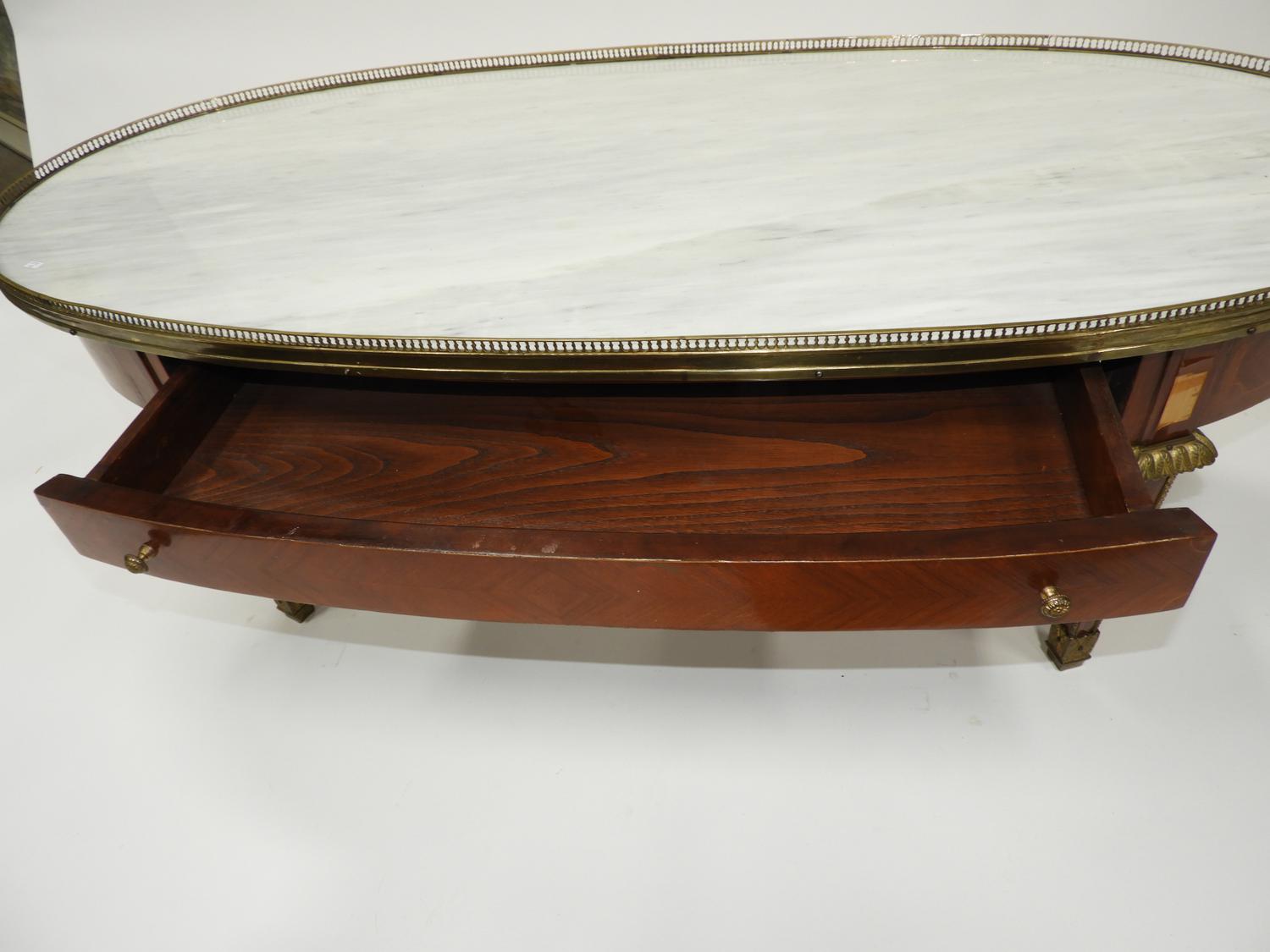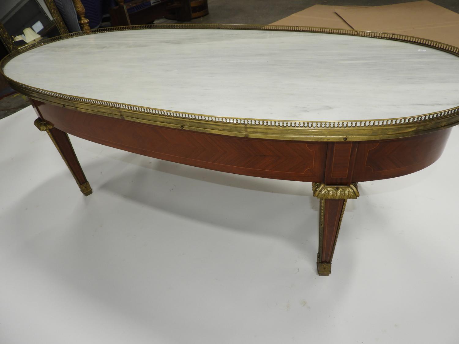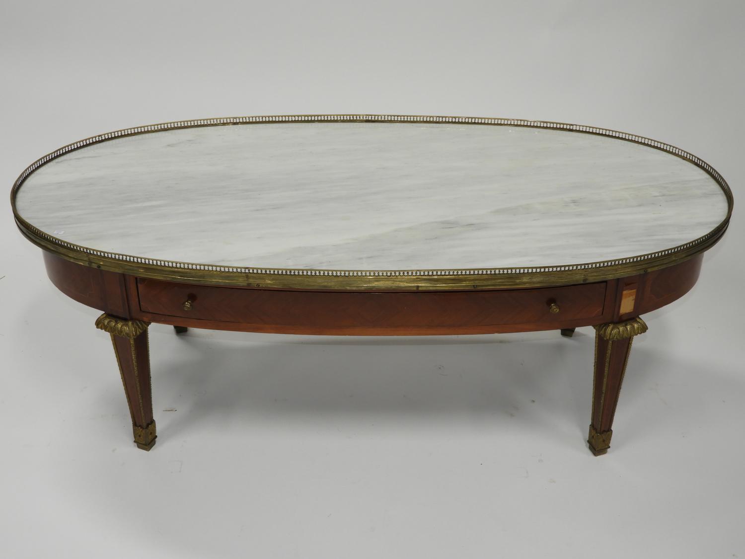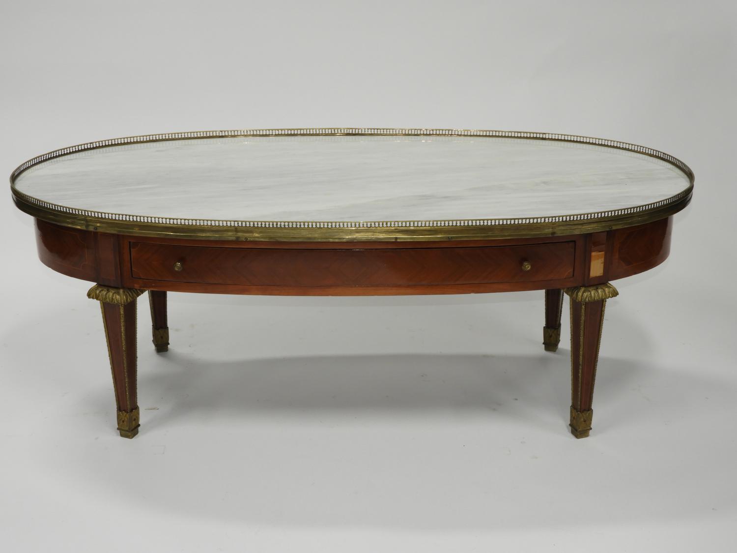 louis xiv-style marble top gilt mounted parquetry inlaid oval coffee table with gallery rim, mid 20th century, 18 1/2" x 50 1/2" x 23"