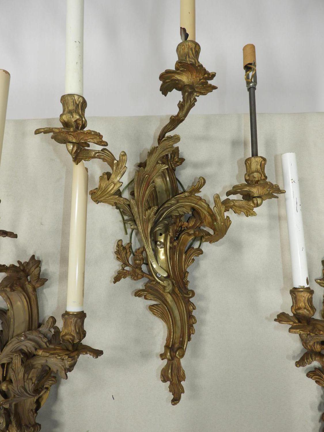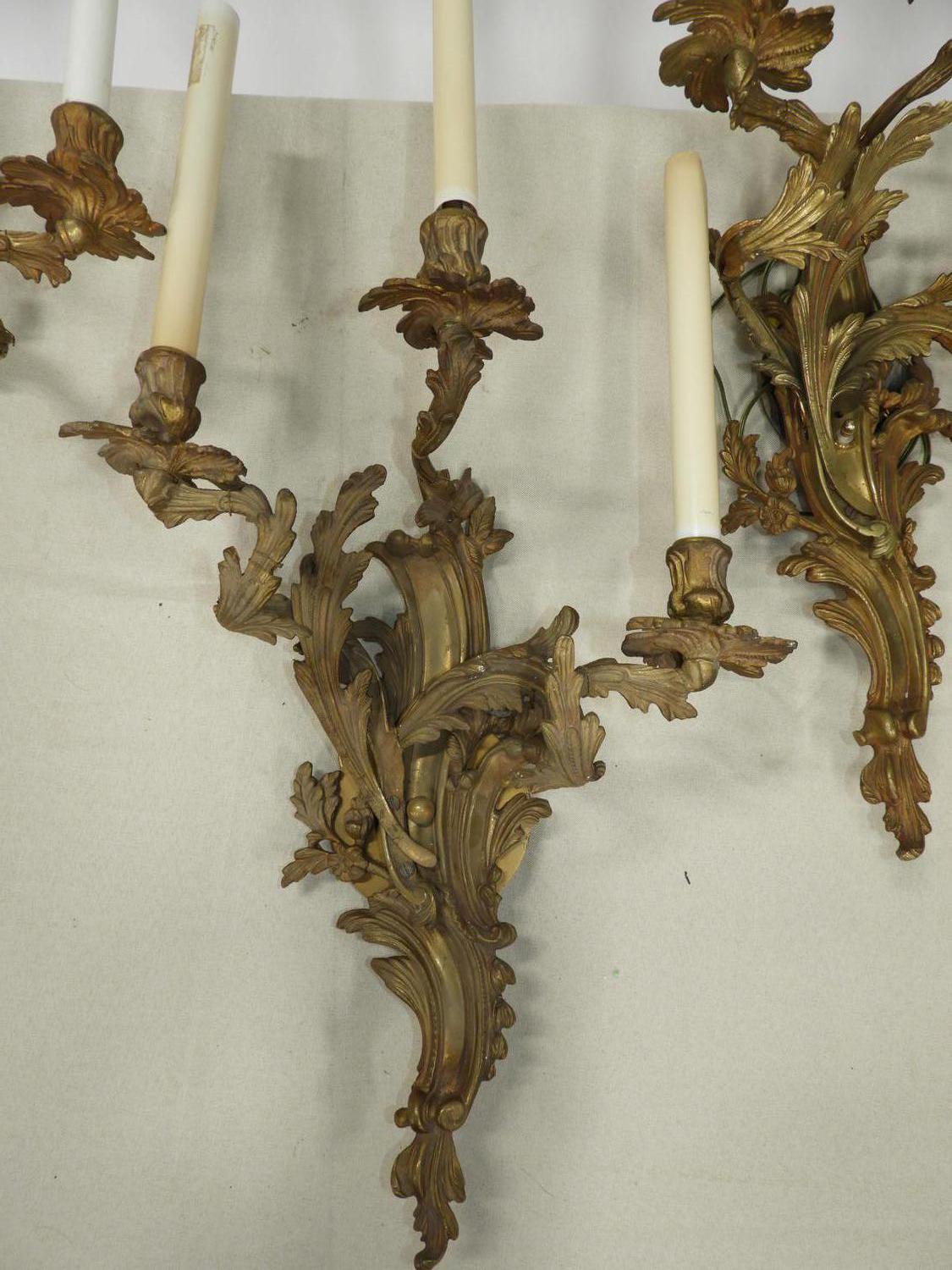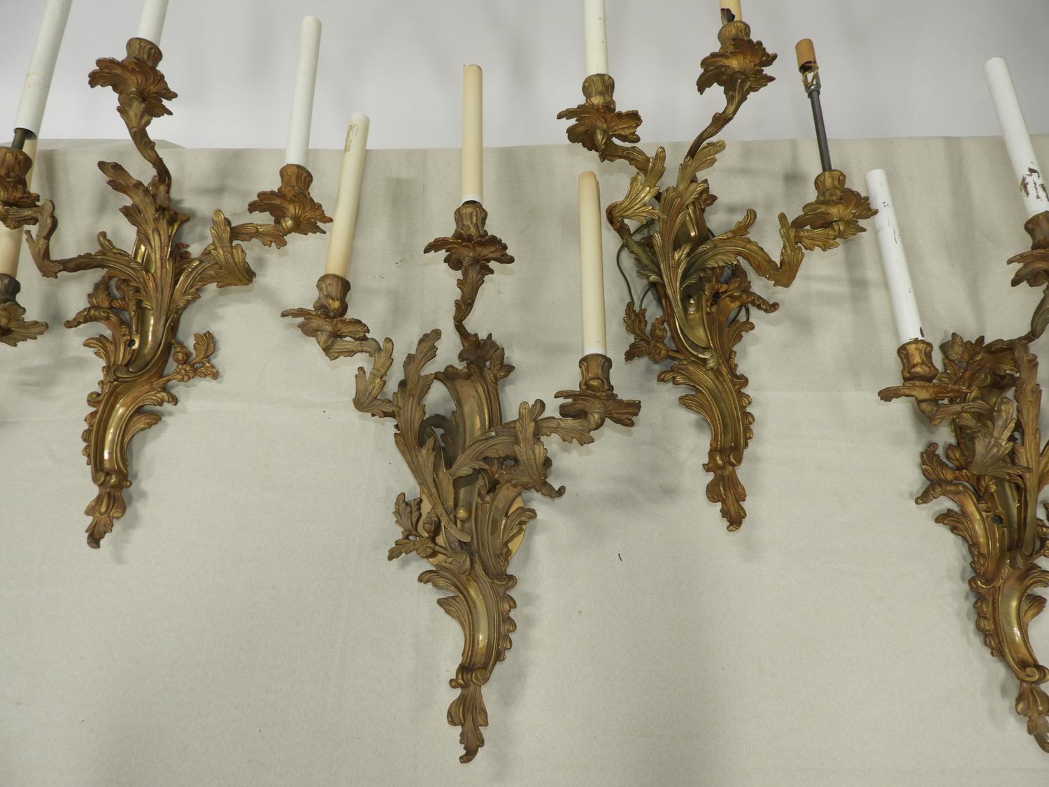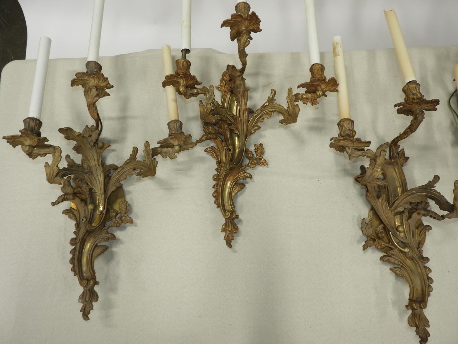 set of five louis xv-style ormolu three branch wall sconces, 29" x 15" x 7"