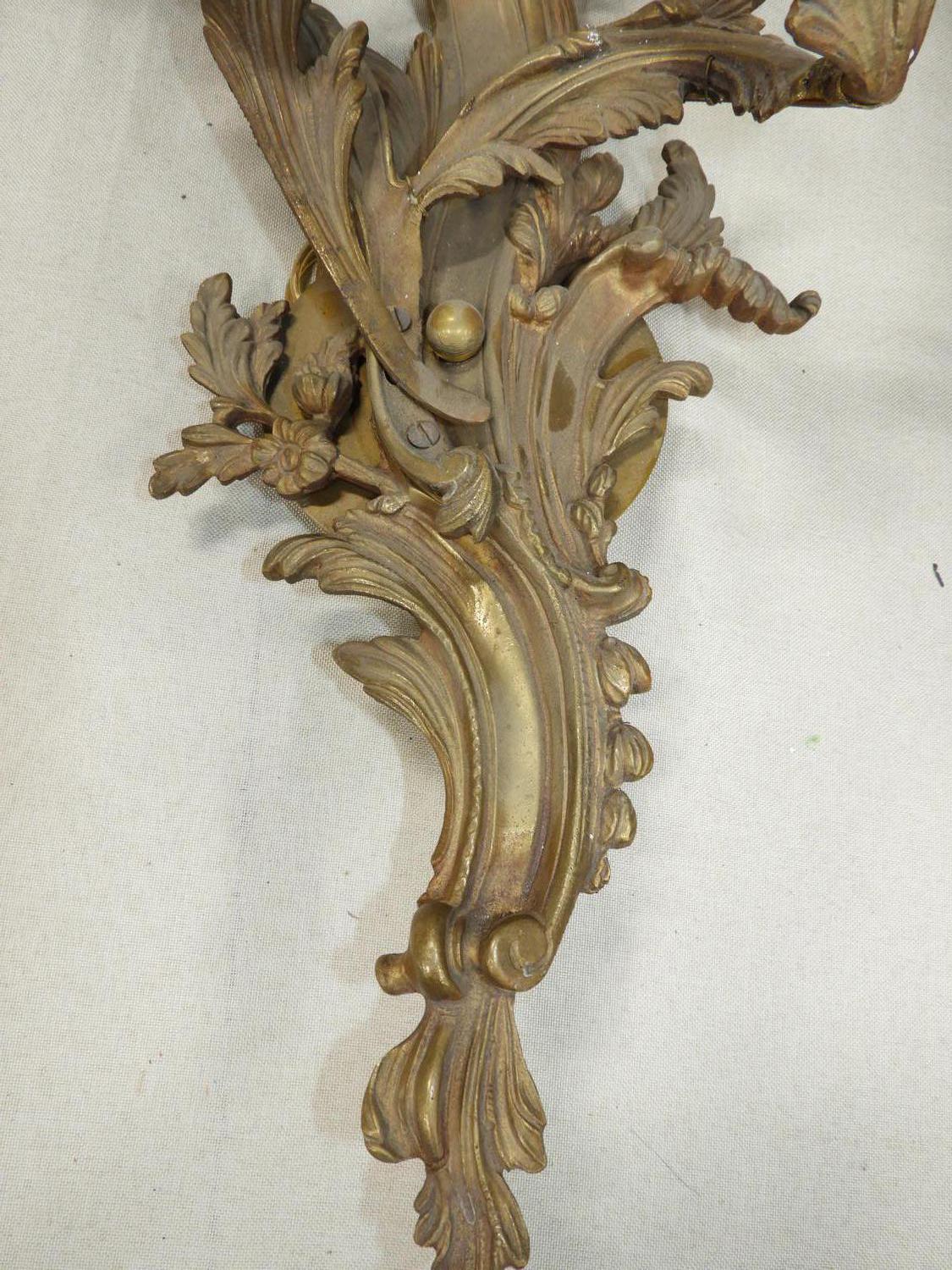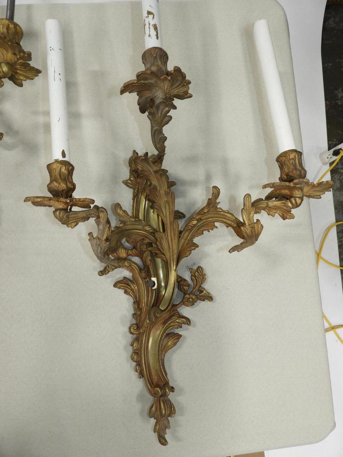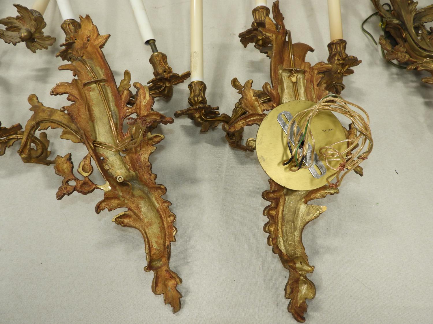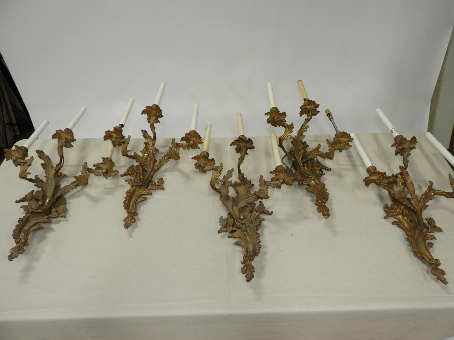 set of five louis xv-style ormolu three branch wall sconces, 29" x 15" x 7"