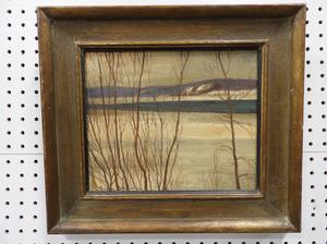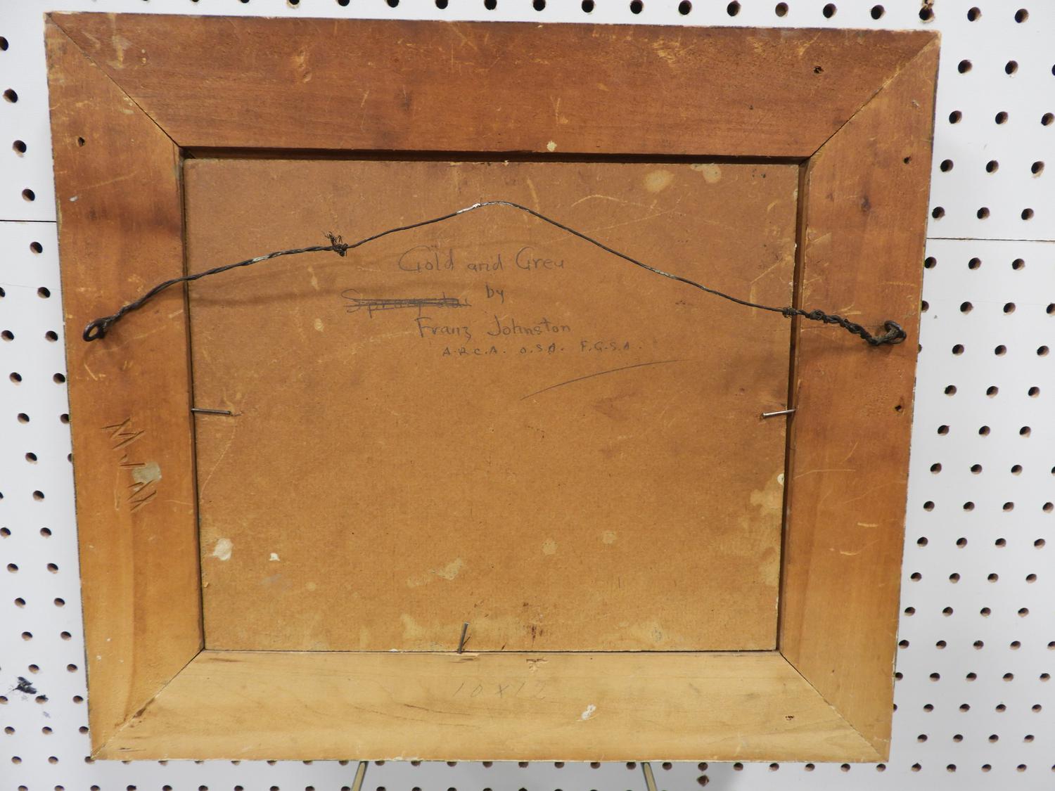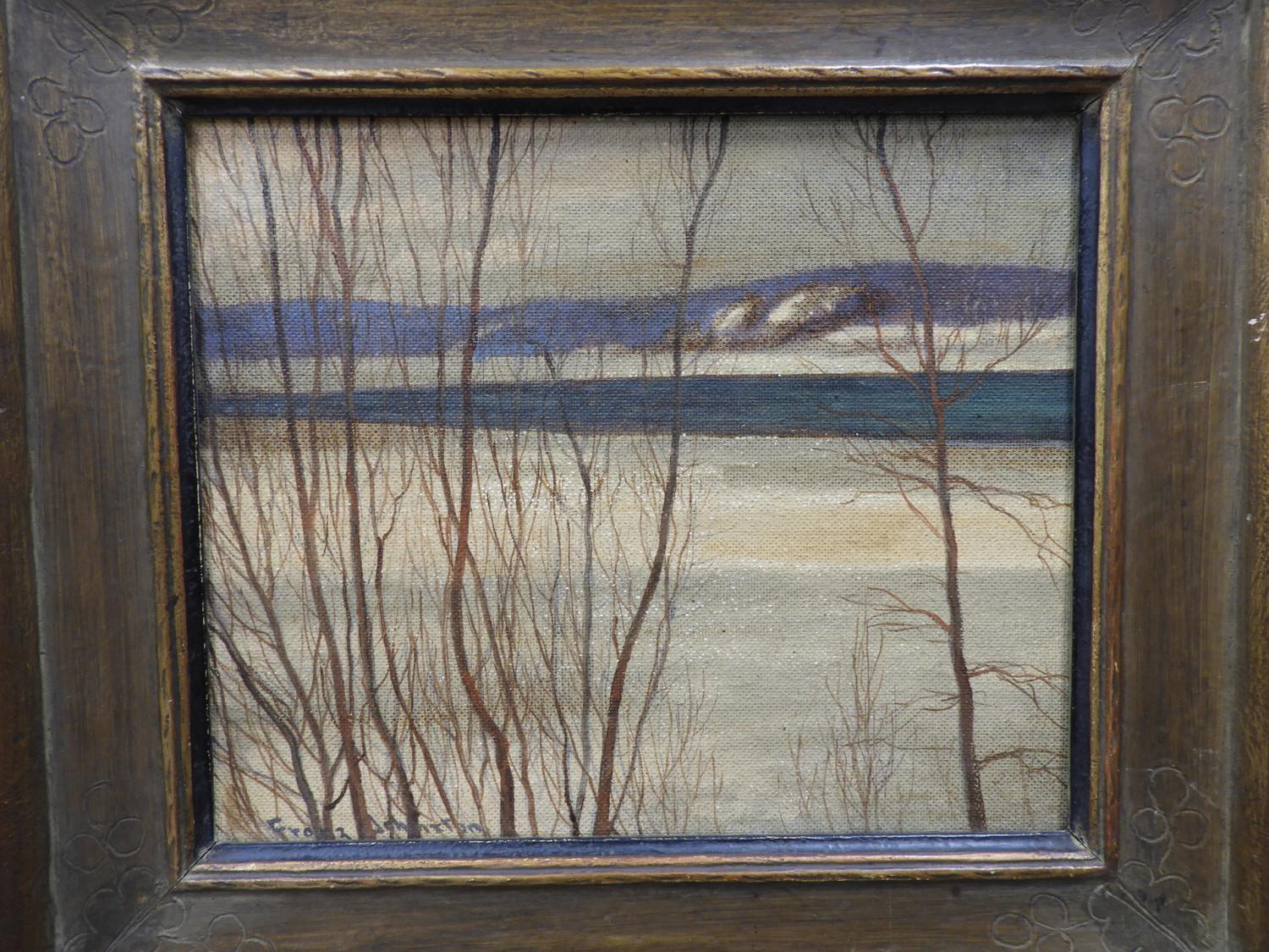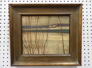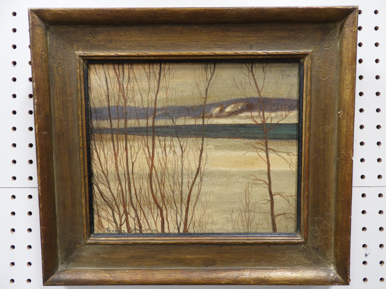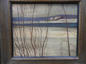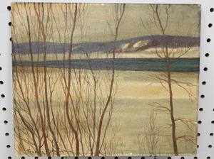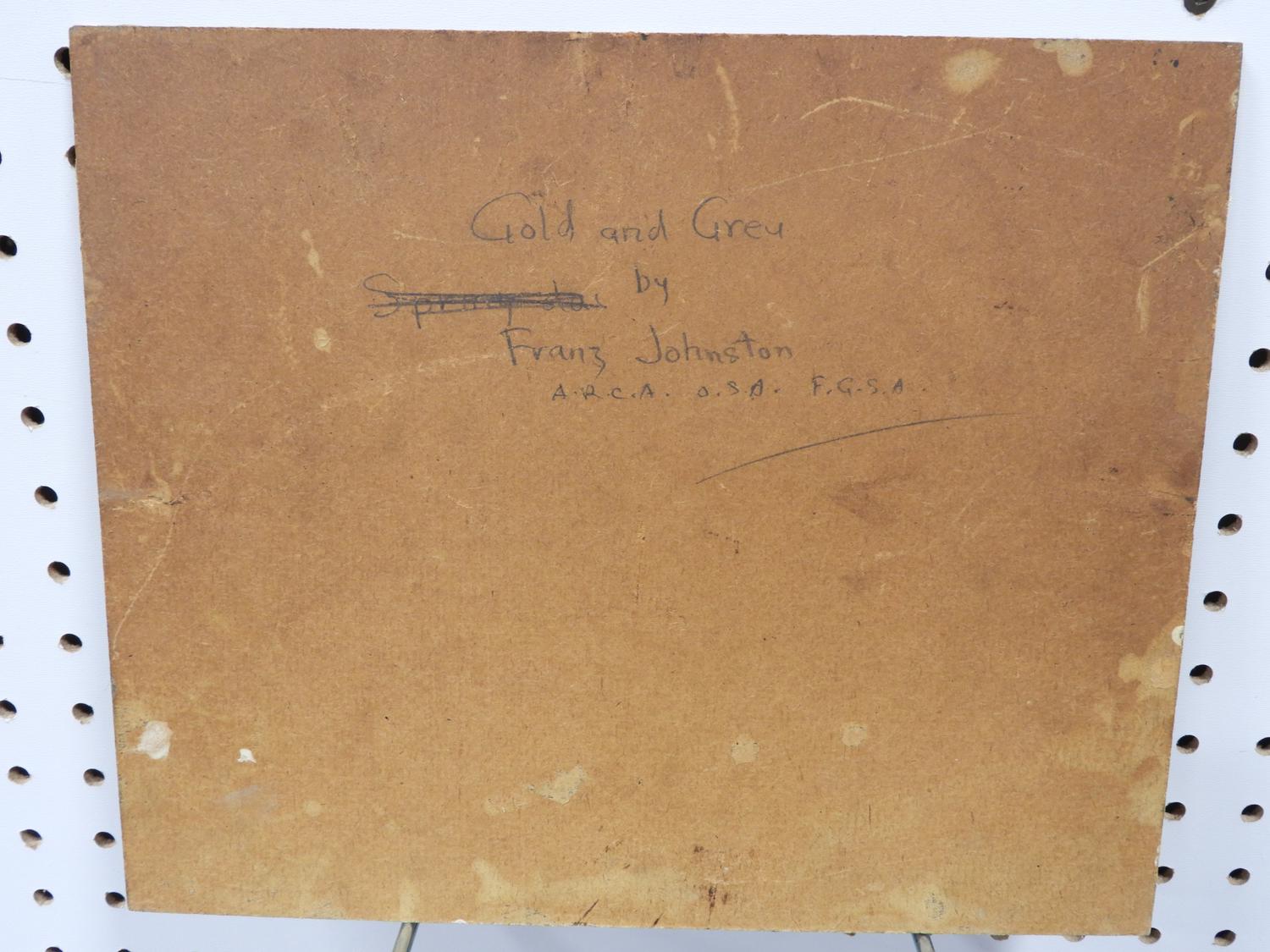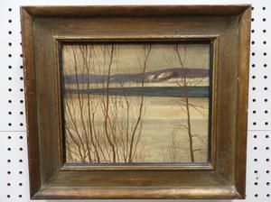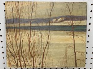 Frank Hans (Franz) Johnston1888 - 1949, CanadianGold and Grey, c. 1937Oil on board10 x 12 in., 25.4 x 30.5 cmInscription verso: in graphite: Gold and Grey/ by / Franz Johnston/ A.R.C.A., O.S.A., F.G.S.A. / Spring [[crossed out]] …[[illegible]]The viewer looks through the bush in the foreground to ice and snow, a narrow section of free-flowing water and in the distance, more snow. There even is snow piled on the distant blue hills. It`s a grey day but holds the promise of spring in the lightening sky.Franz Johnston loved painting the spring break-up of lakes and rivers. It was a view he studied often and he had seen the composition used in this straight-forward way by Tom Thomson, his friend from his days at Grip Limited in Toronto, and the Group of Seven of which he was a member in 1920. As the spring progressed, he doubtless came back to the same place to record the site but now under more favourable weather conditions, perhaps on a bright day and with the water flowing more freely.He may have painted the sketch in the Longlac District of Ontario, now amalgamated with other townships and districts to form an area called Greenstone, Ontario. He painted a sketch there titled “Advancing Spring - Melting Shows in Late March in the Longlac District” (1937), sold at Waddington`s Auction in May 2017. It too is oil on board and of the same size. In it, he recorded the banks of snow, blue where they sloped down to the river.As a result of his trip, Johnston seems to have gone back to the studio and created the major canvas “Advancing Spring”, sold on two occasions by Joyner/Waddington`s (2009 and again in 2112), utilizing the carefully delineated bushes from “Gold and Grey”, especially in the foreground, and the steep banks of snow from the second sketch. He seems to have had his former membership in the Group of Seven on his mind because on the back of “Gold and Grey” he wrote “Franz Johnston, A.R.C.A., O.S.A., F.G.S.A.”. The last abbreviation stands for “Former Group of Seven Artist”. He wrote the same inscription on the back of the second sketch he painted in March in the Longlac District.“Gold and Grey” has its own quiet charm as an indication of Franz Johnston`s visit to what was for him a handsome new painting area. That he rose to its beauty is seen in his major painting on the subject. But even as he sketched, he must have realized its potential. There are many gaps in the history of Franz Johnston, as enunciated by art historians. “Gold and Grey” helps to fill one of these gaps and it fills it with style. A Johnston sketch of such quality only appears rarely on the market.Joan Murray