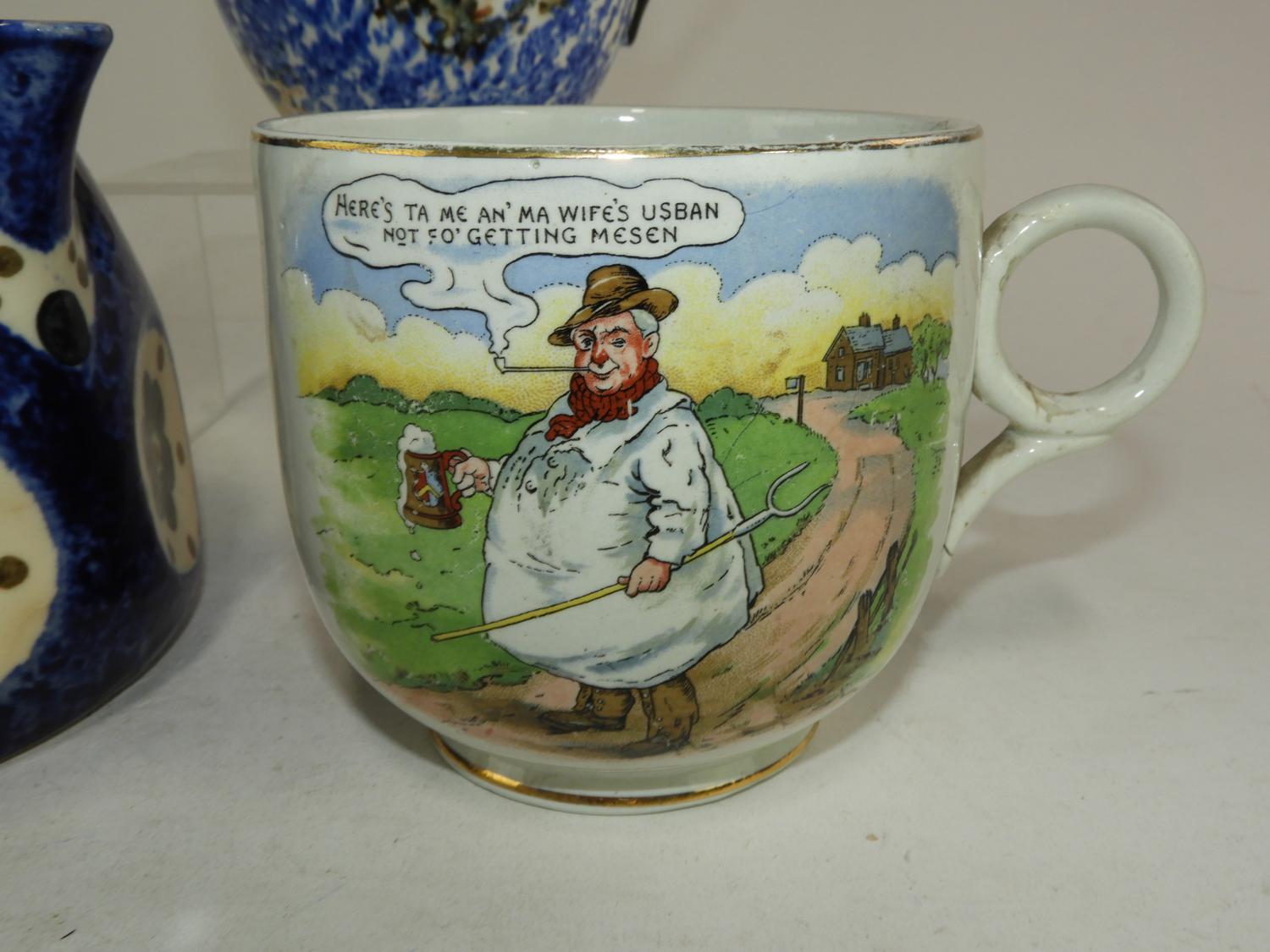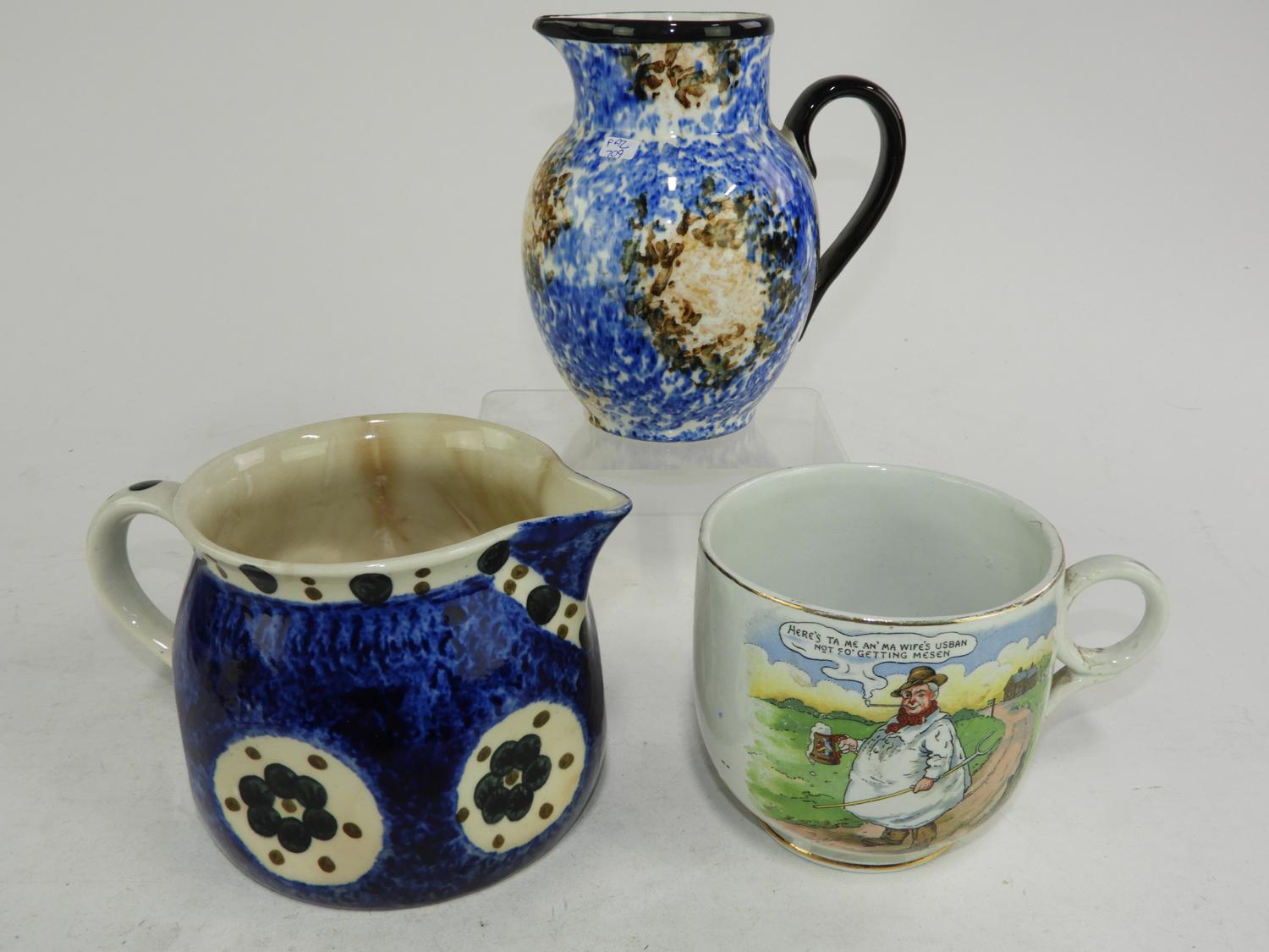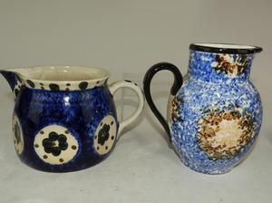 2 sponge decorated pitchers and a cartoon mug