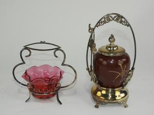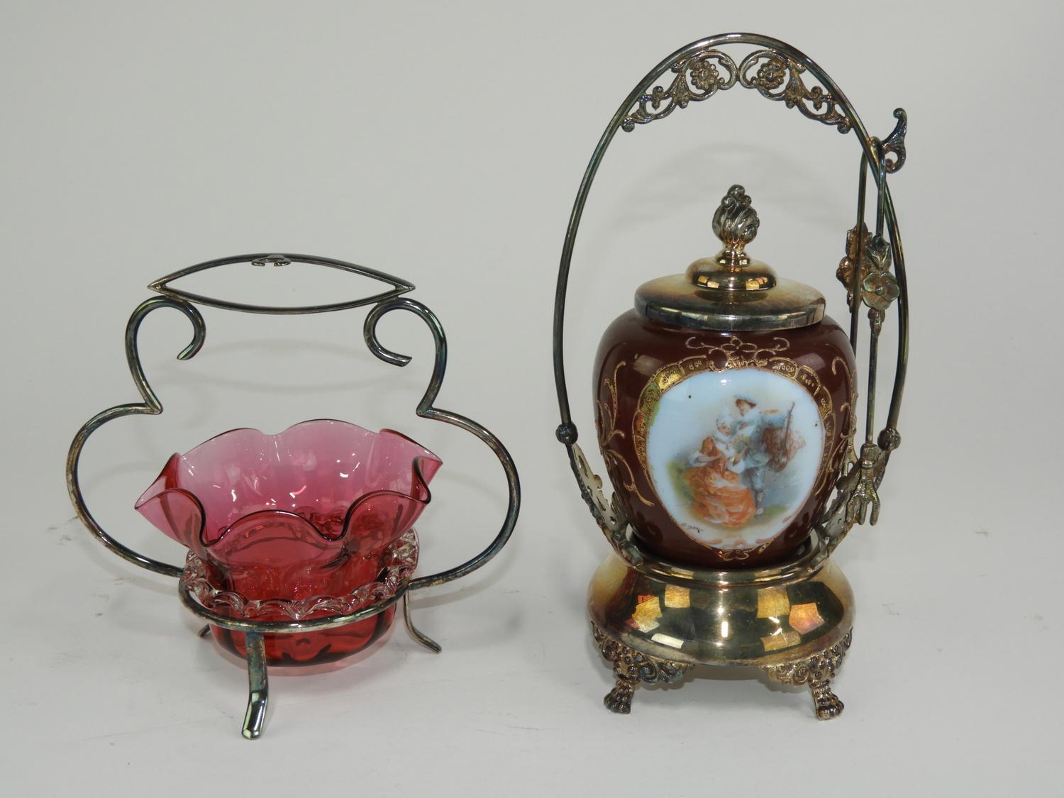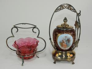cranberry and a painted milk glass and silver plate cruets