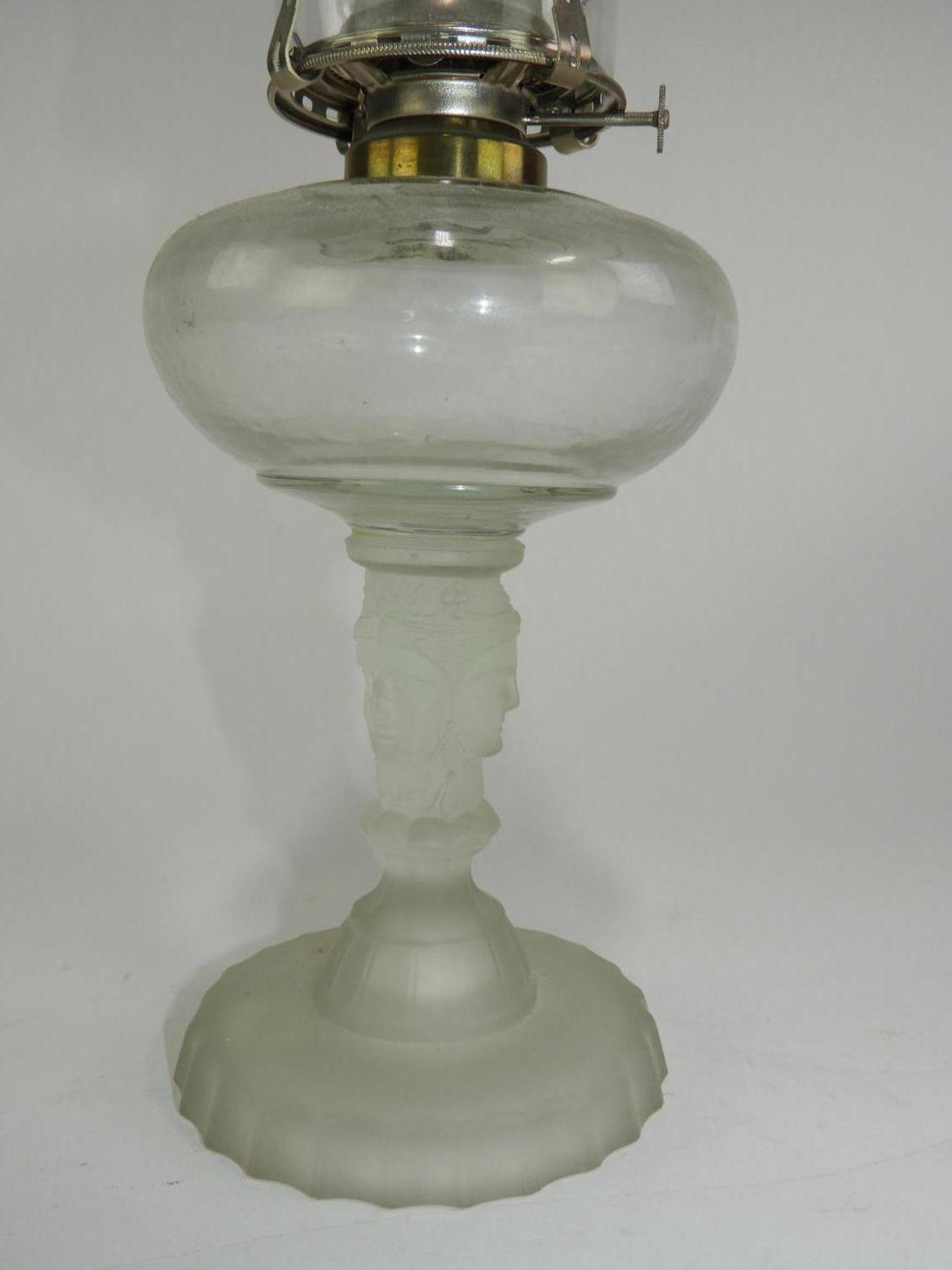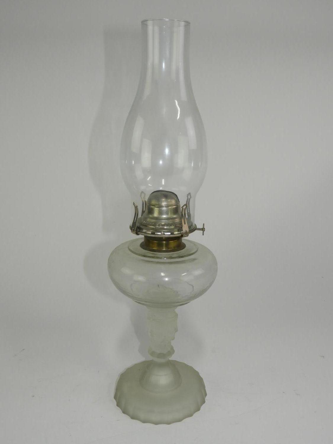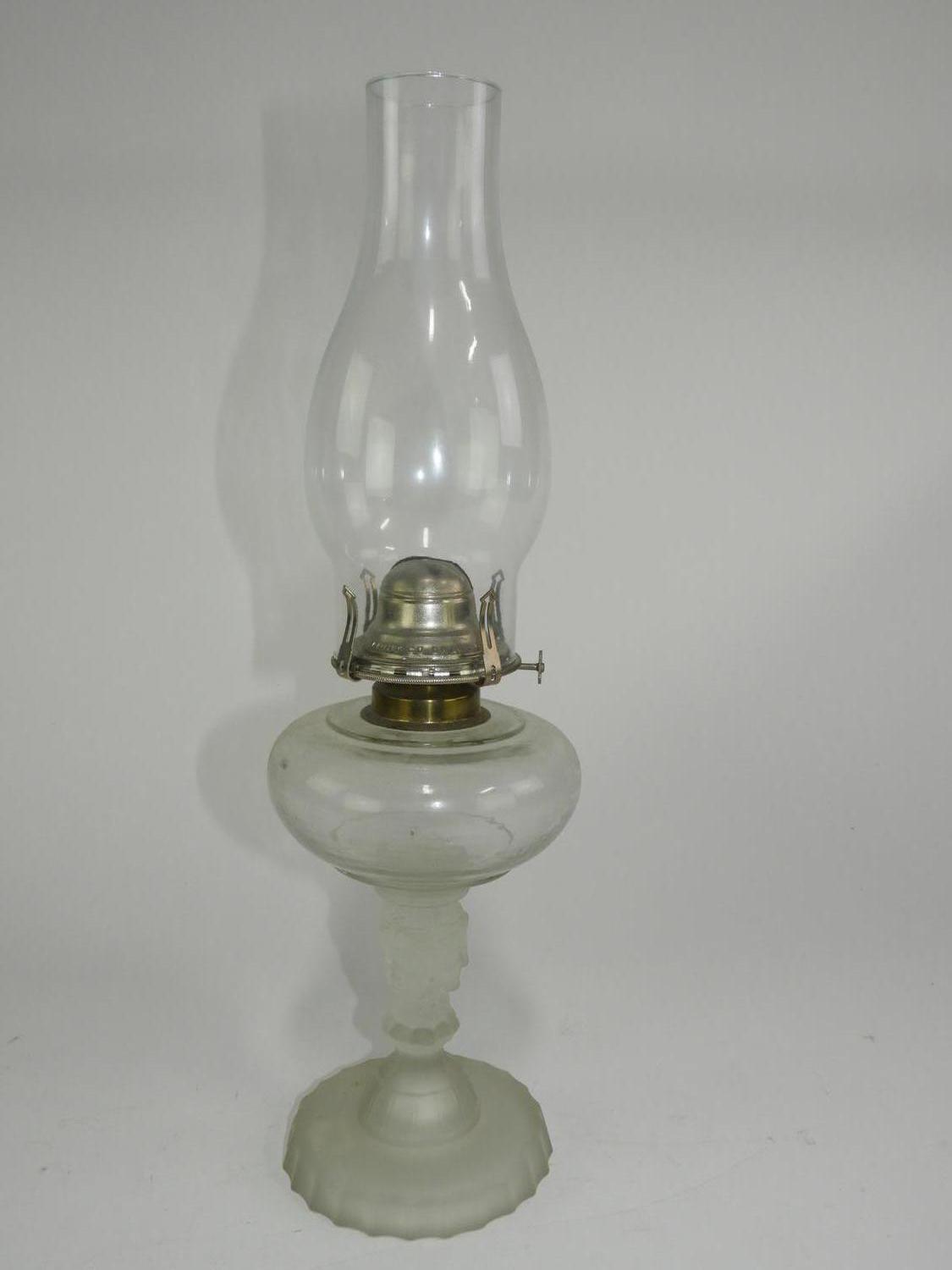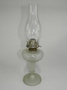 american frosted pressed glass oil lamp, ht. 17 1/2"