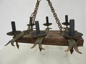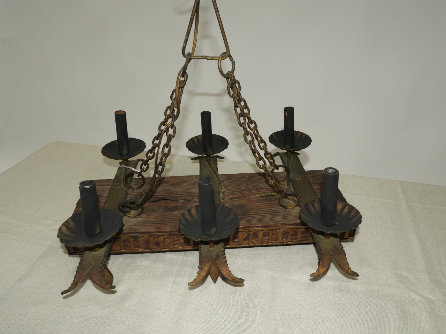 hanging oak and brass light fixture