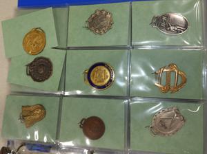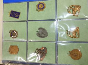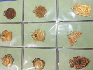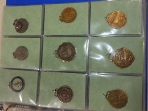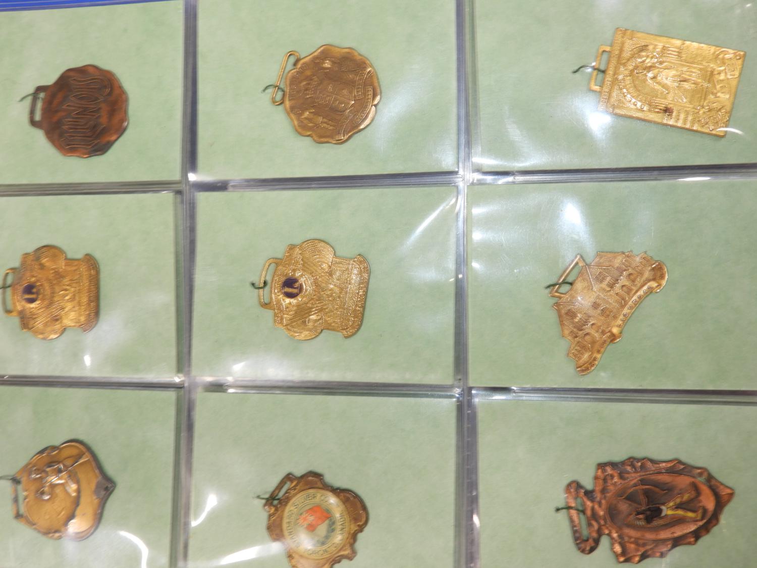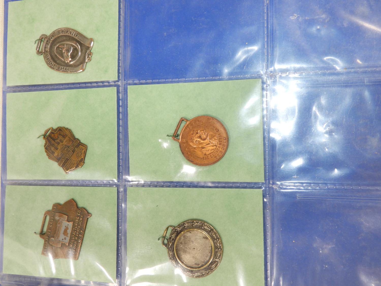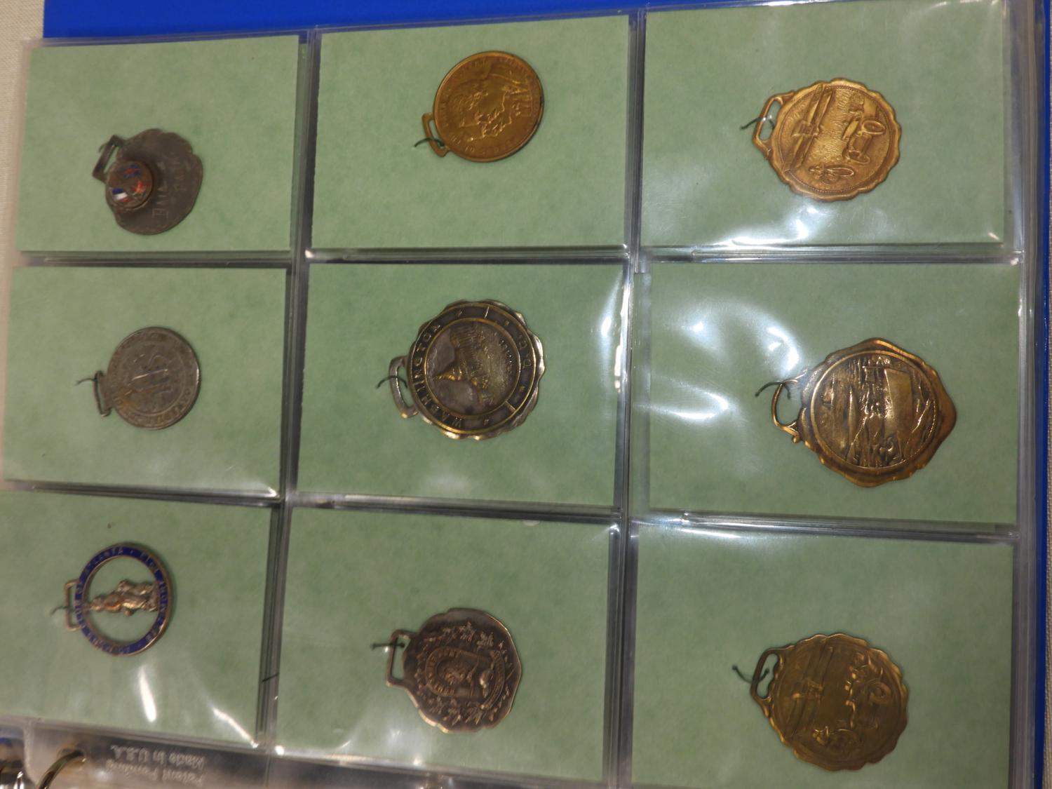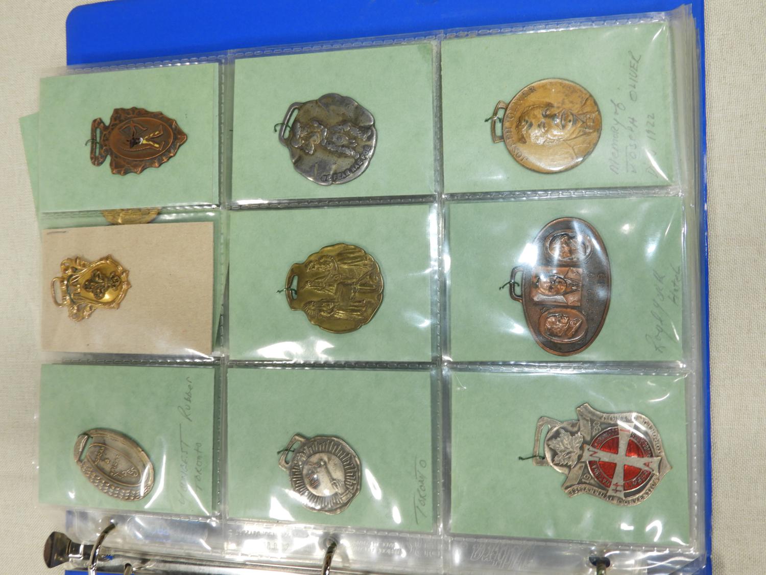 binder of vintage pendant medallions and fobs
