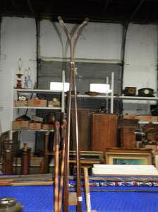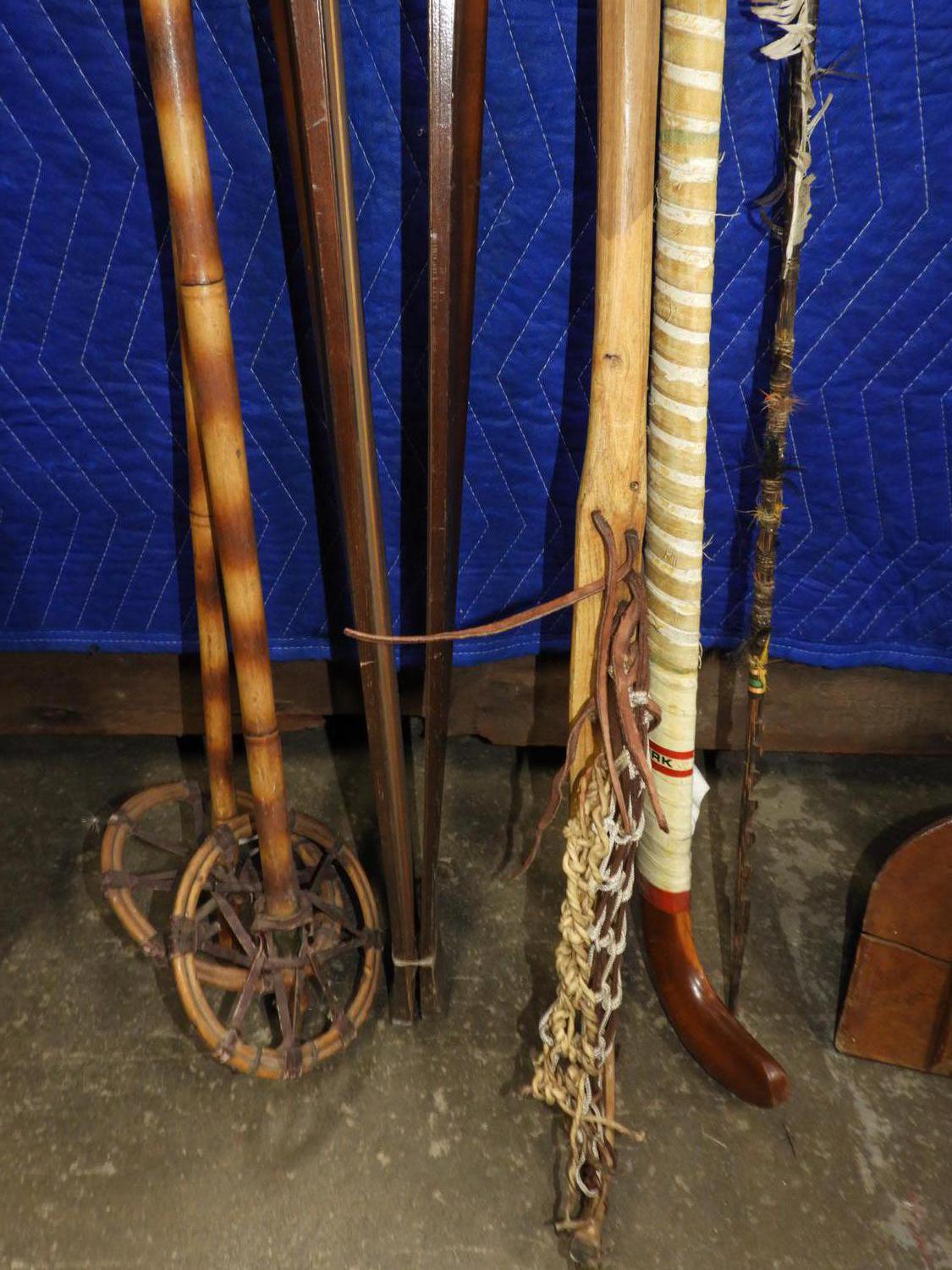 pair of chalet wooden skiis with bamboo poles, spear, lacrosse stick and field hockey stick