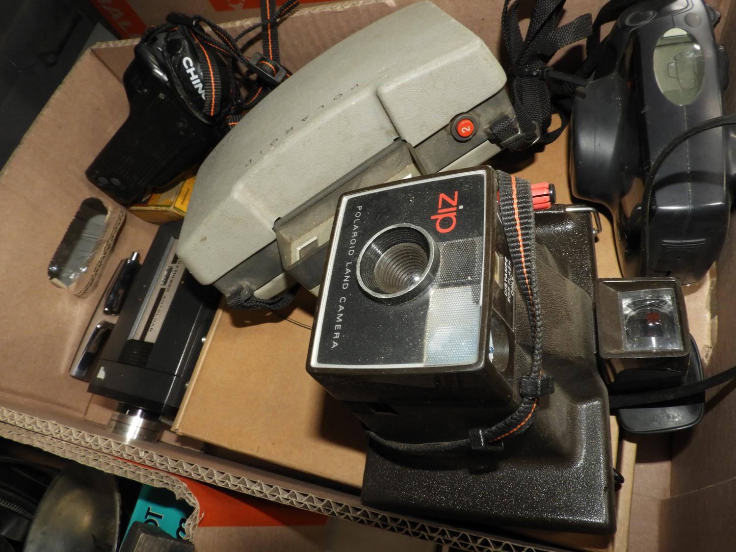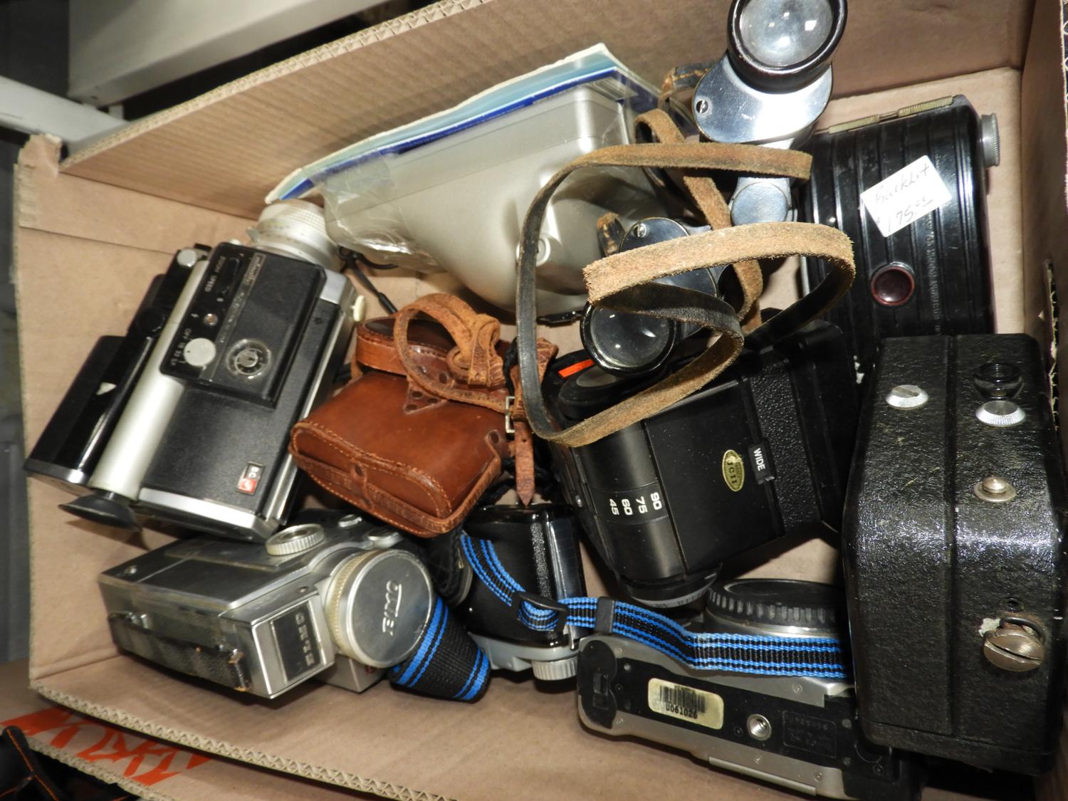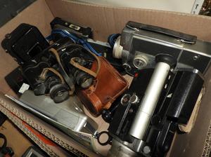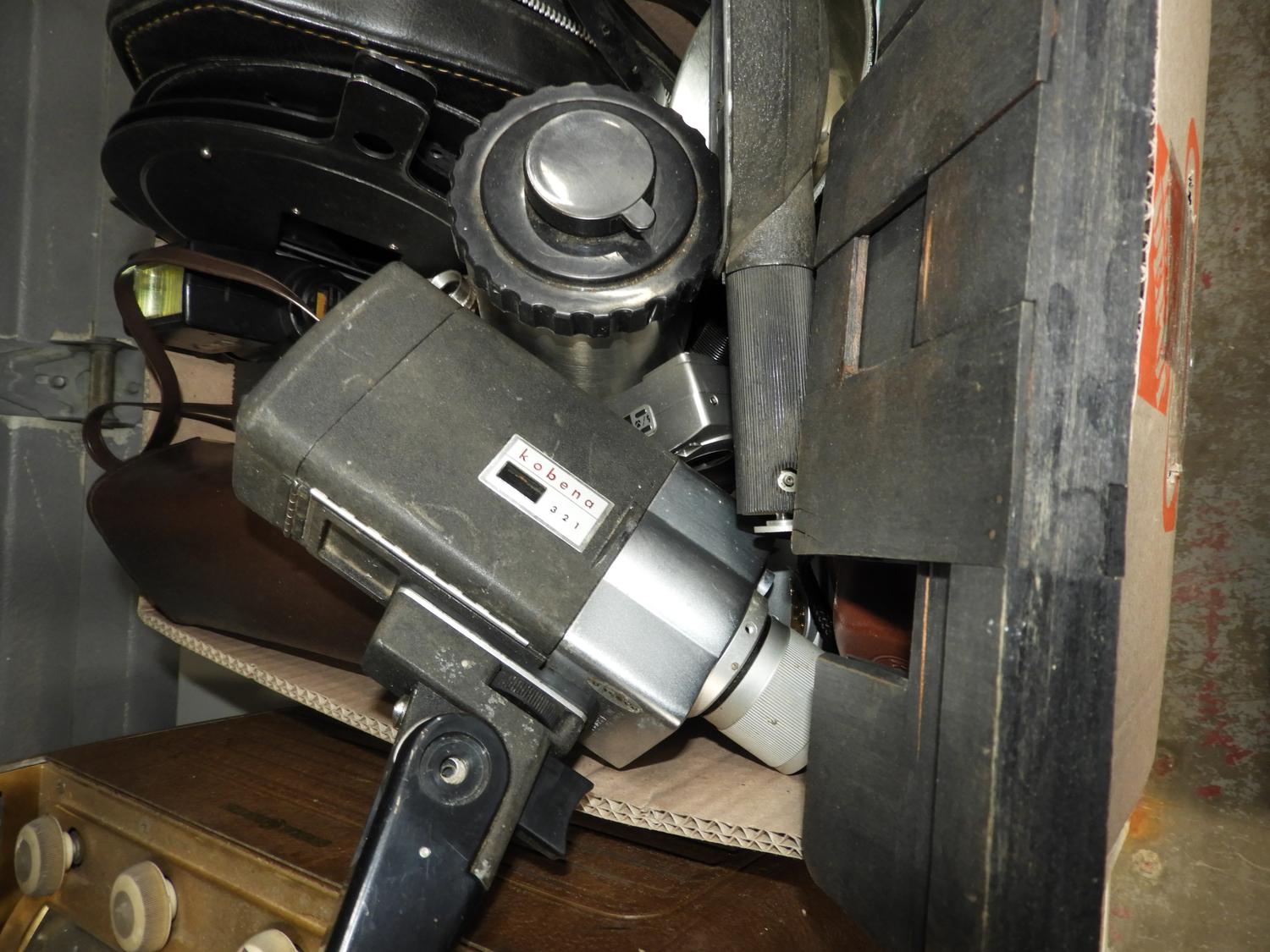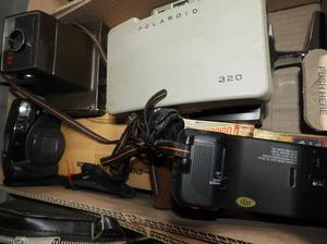 lot of vintage cameras and a radio